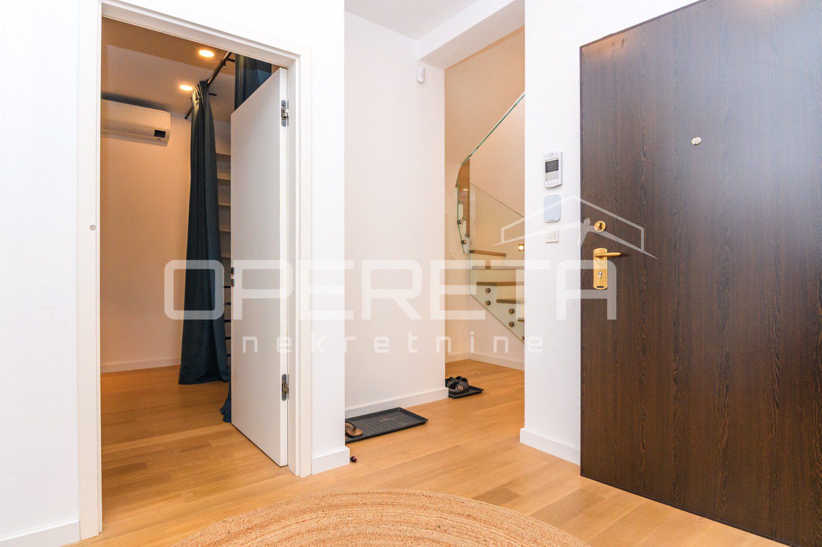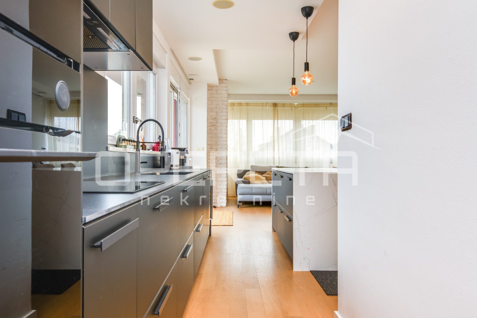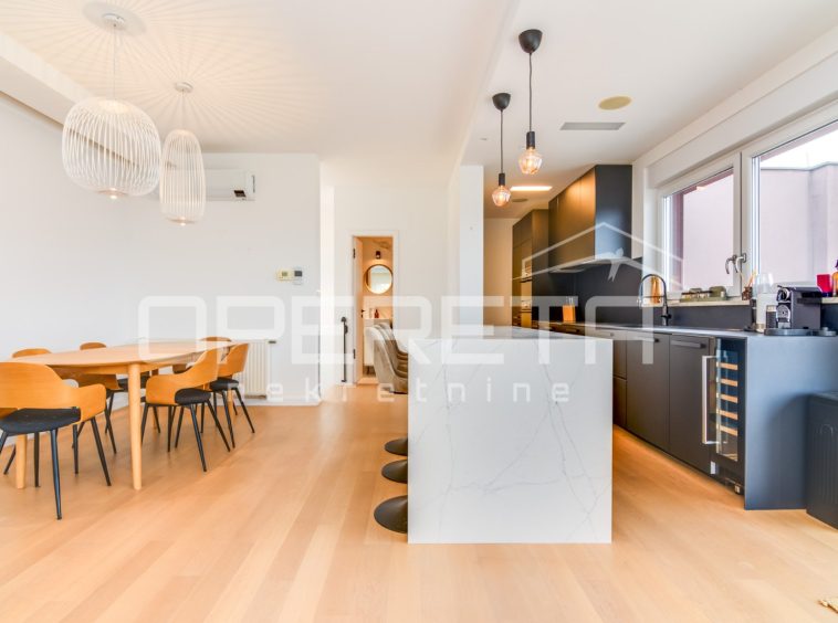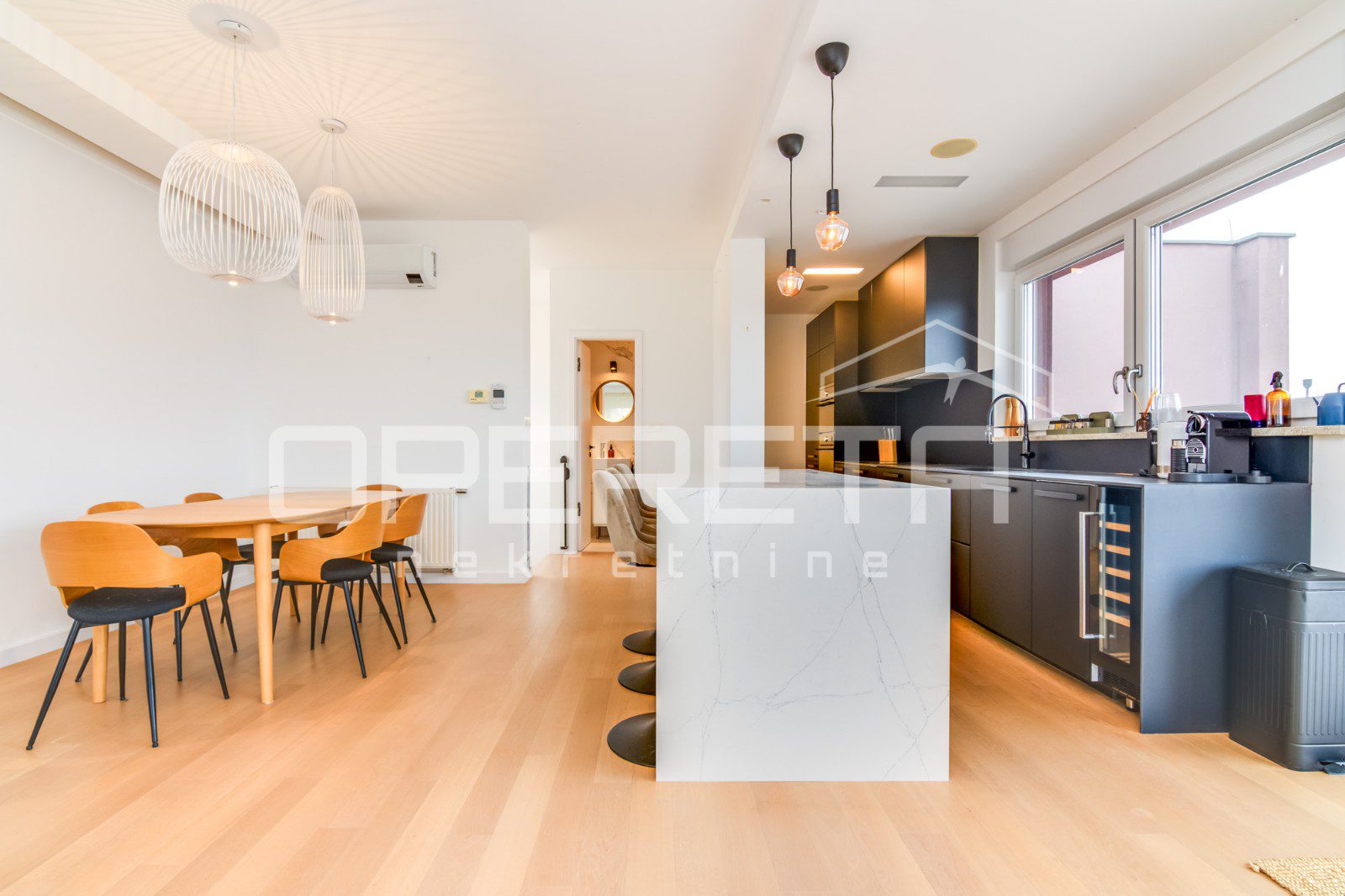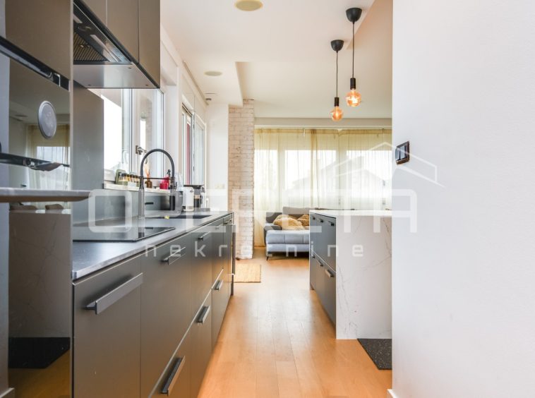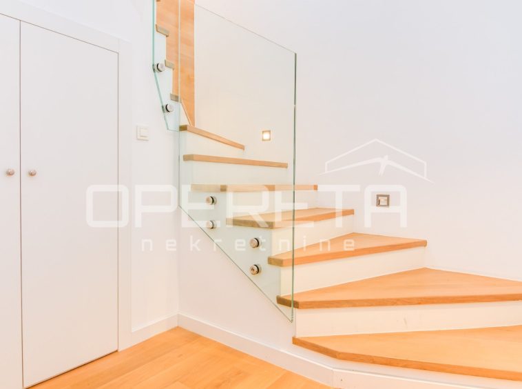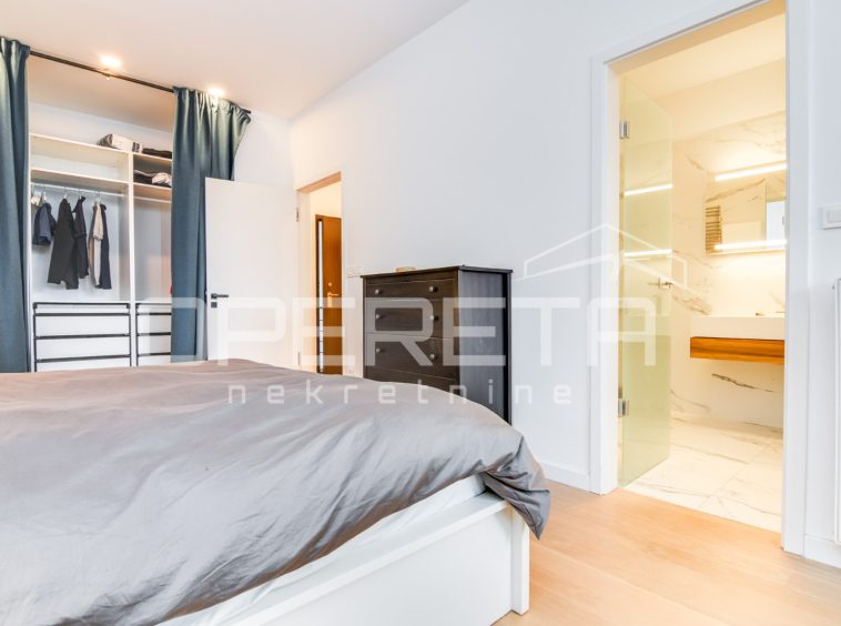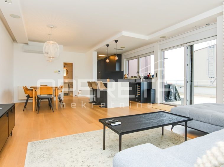 The apartment consists of a lower floor with 3 bedrooms, one of which (master) has its own bathroom and a closed loggia, a laundry room and a bathroom, while on the second floor there is a large open space living room with a kitchen and dining room with access to a spacious terrace and a guest toilet
