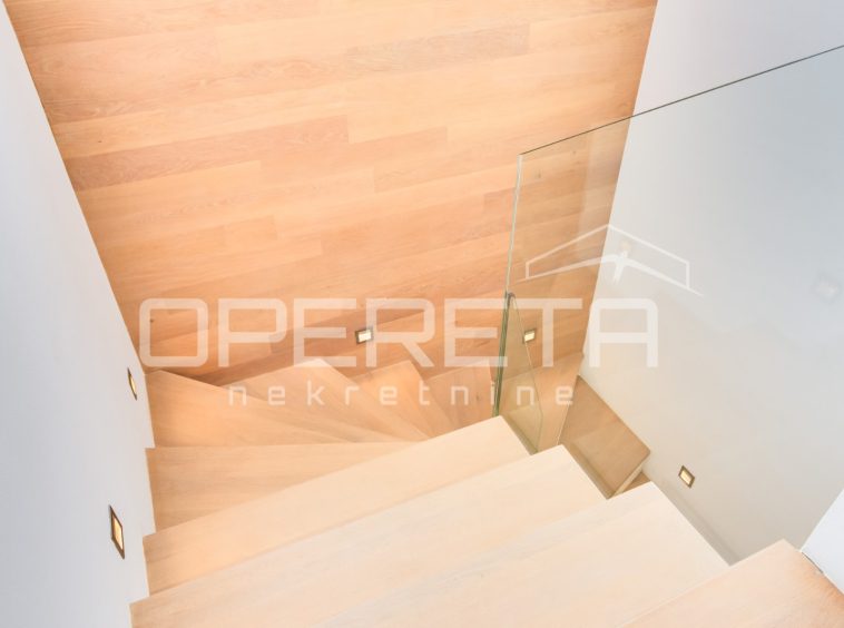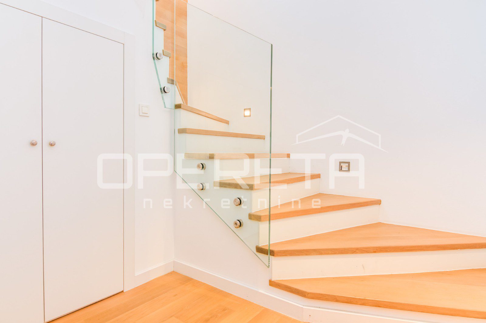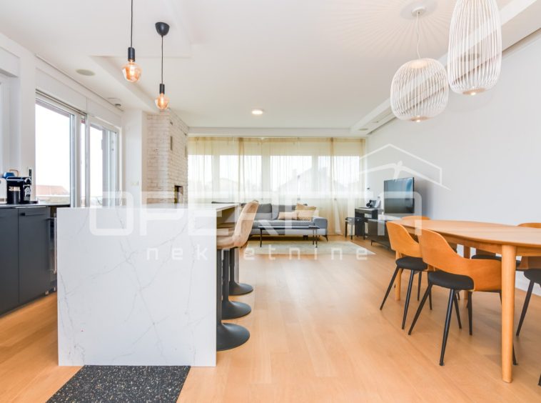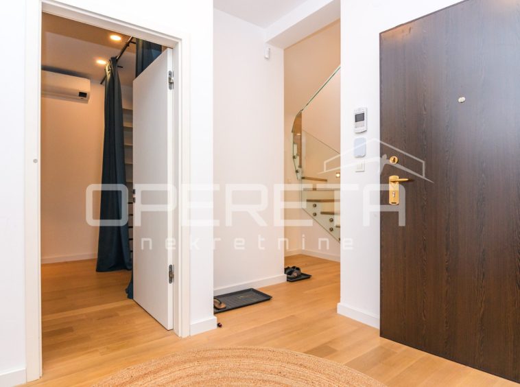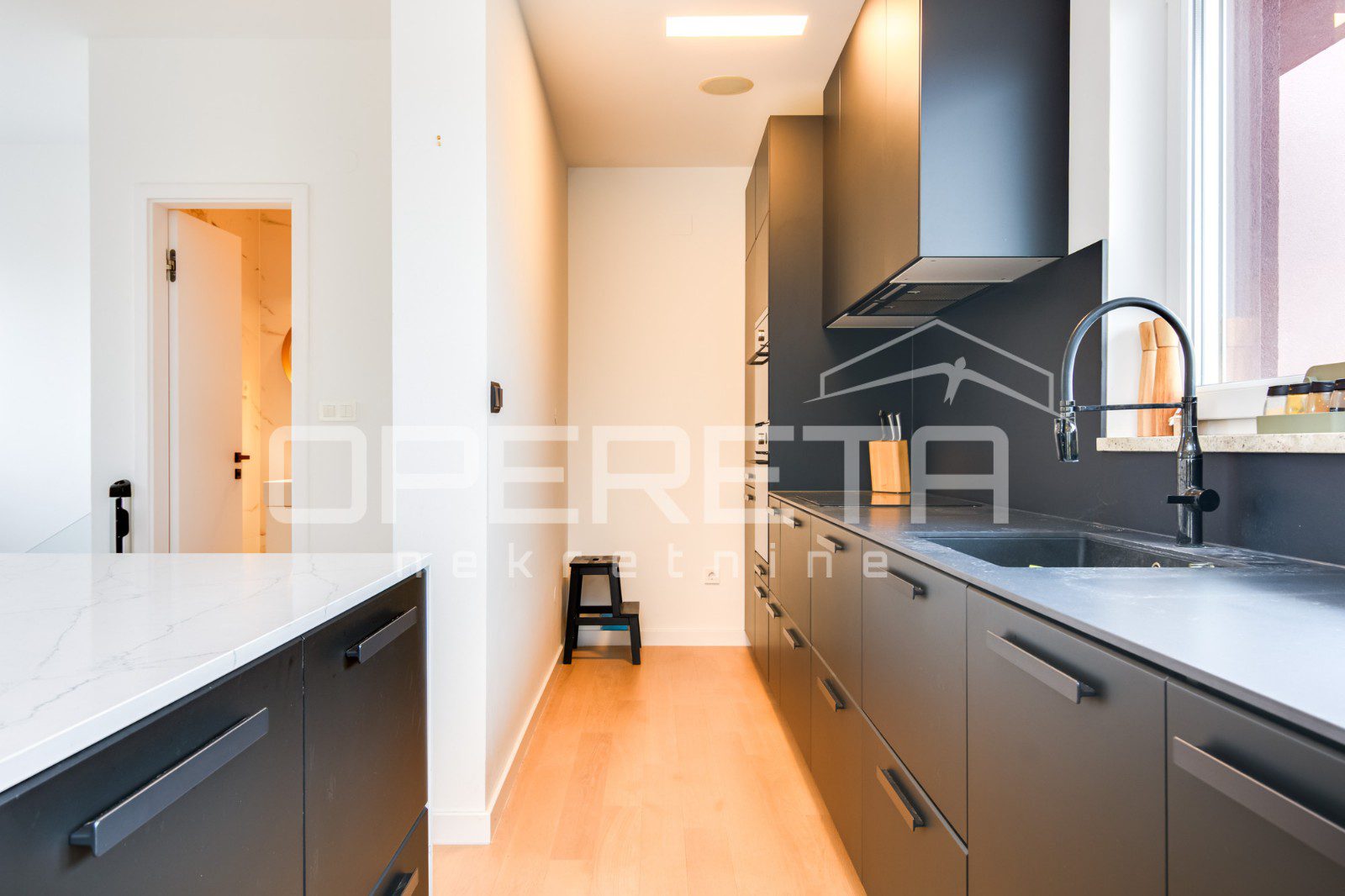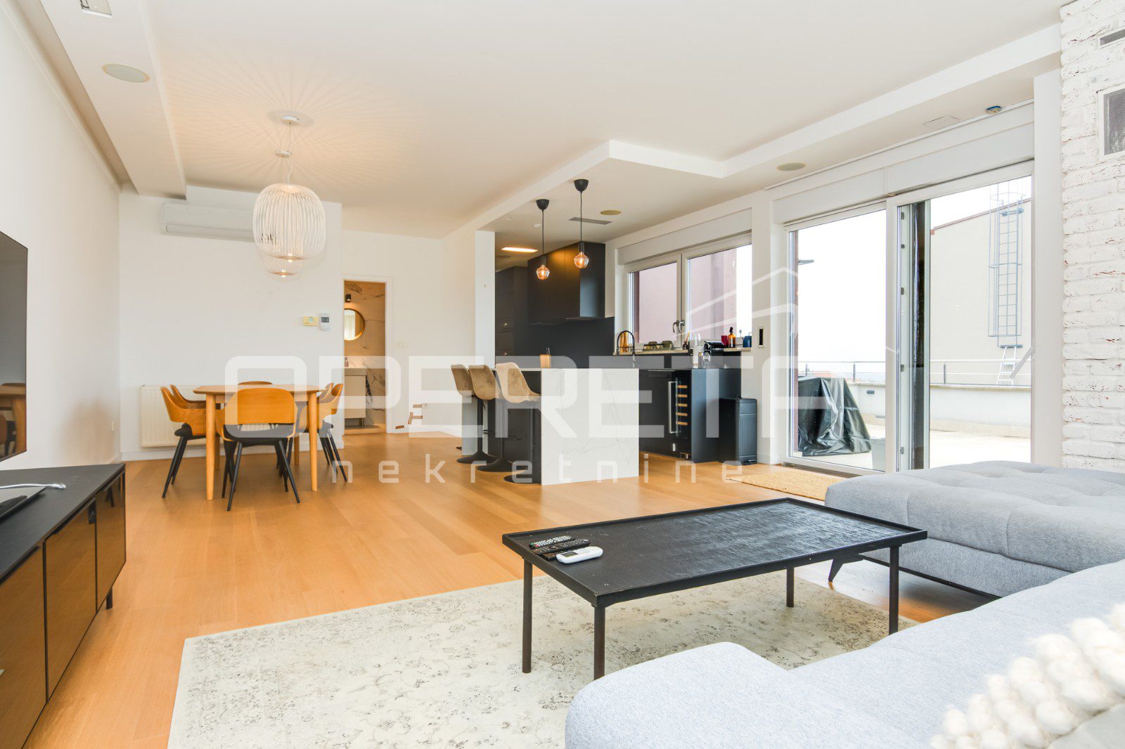 The apartment consists of a lower floor with 3 bedrooms, one of which (master) has its own bathroom and a closed loggia, a laundry room and a bathroom, while on the second floor there is a large open space living room with a kitchen and dining room with access to a spacious terrace and a guest toilet