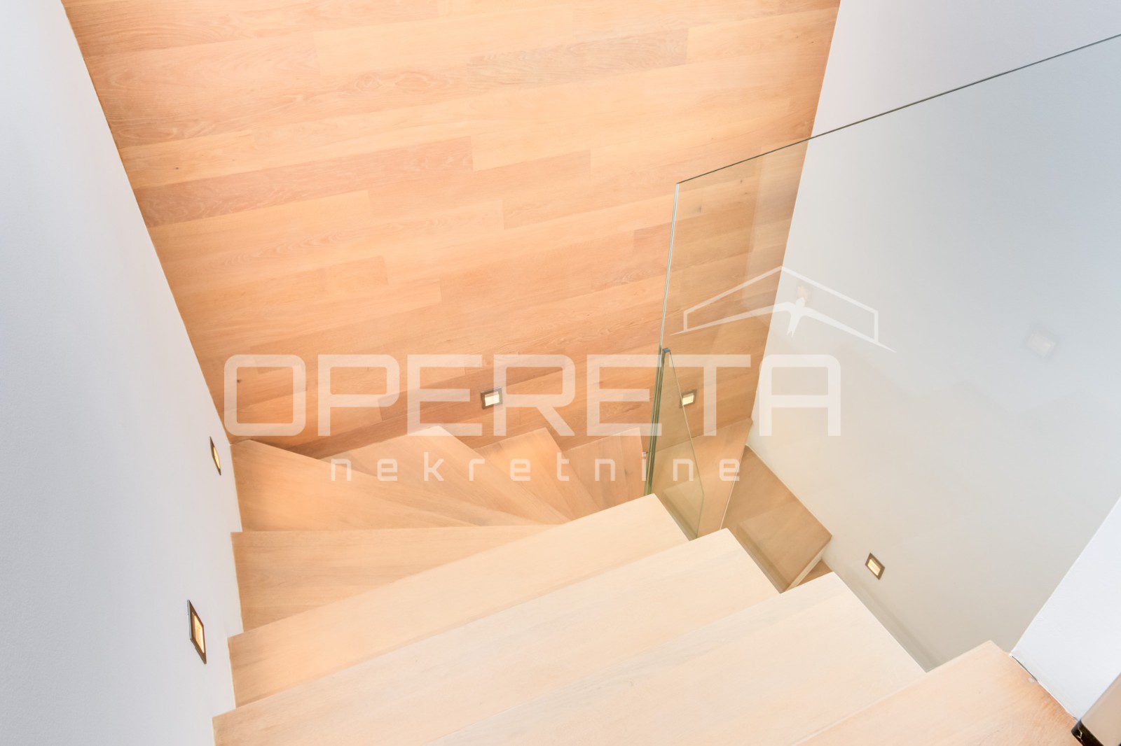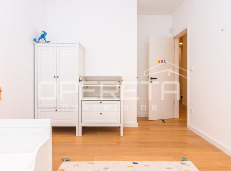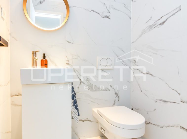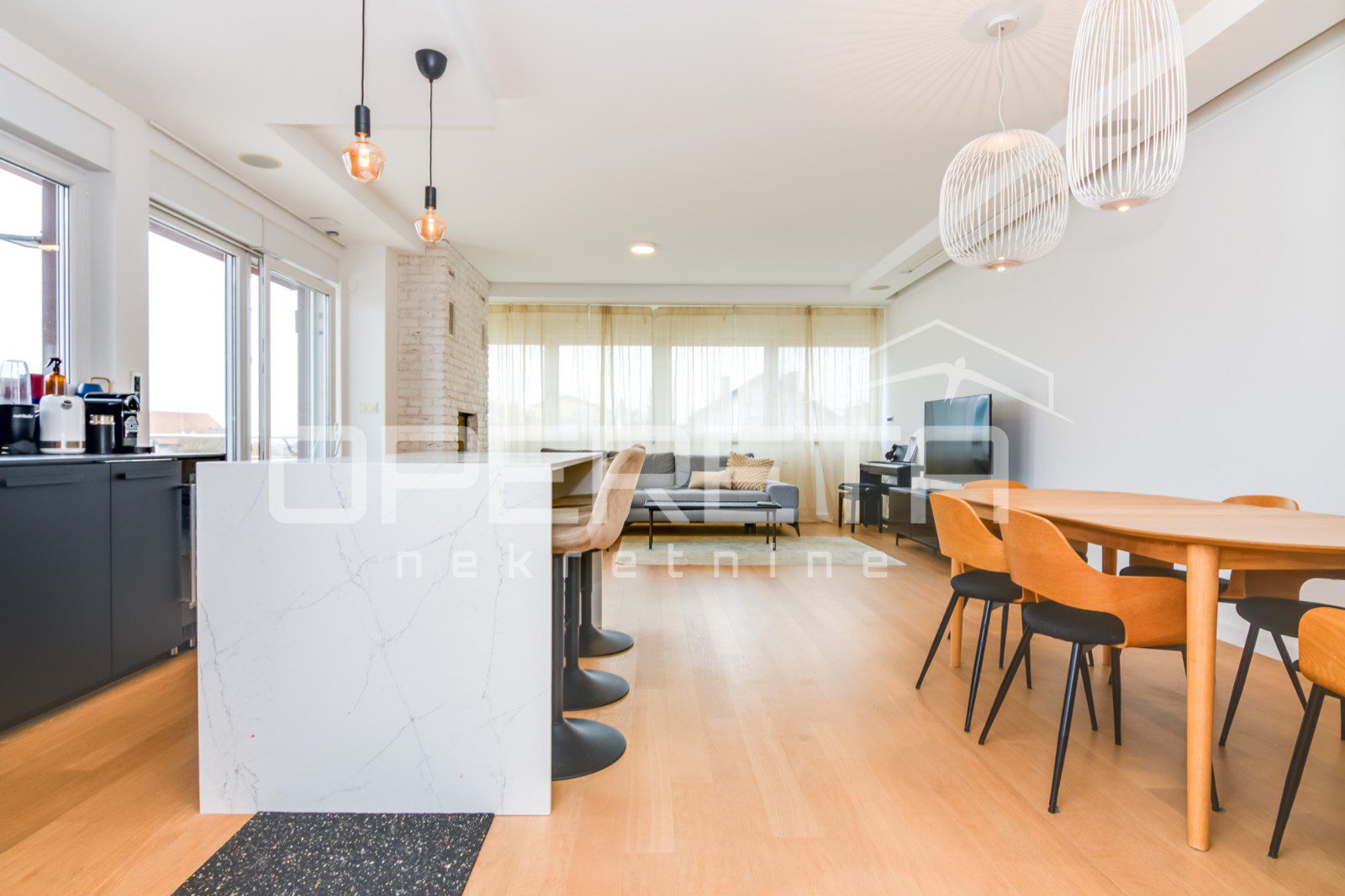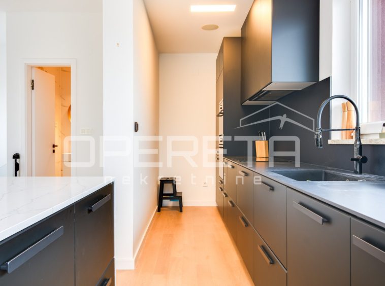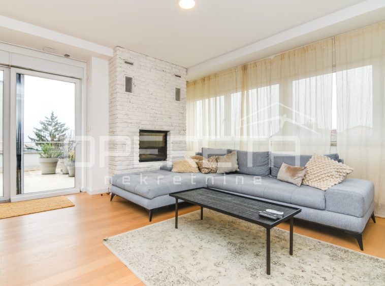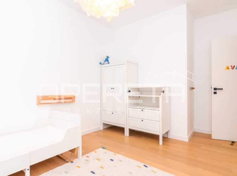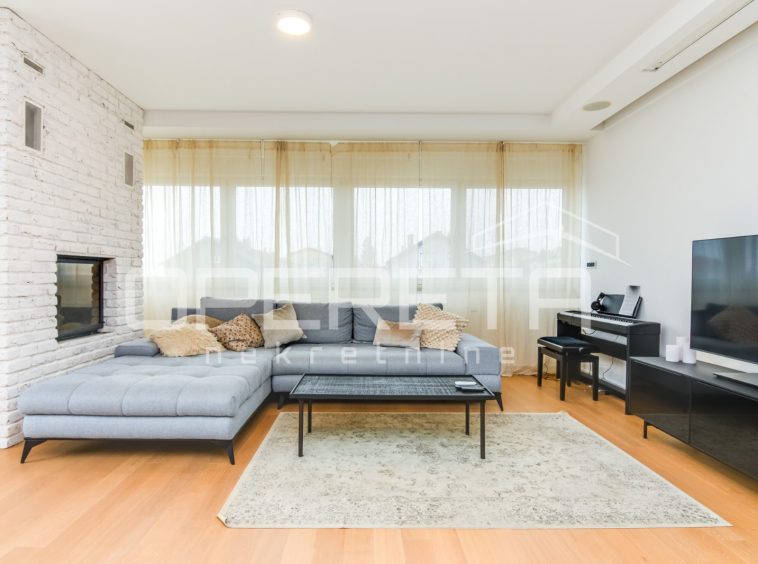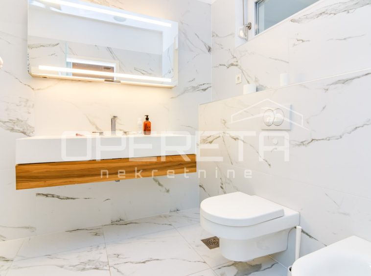 The apartment consists of a lower floor with 3 bedrooms, one of which (master) has its own bathroom and a closed loggia, a laundry room and a bathroom, while on the second floor there is a large open space living room with a kitchen and dining room with access to a spacious terrace and a guest toilet