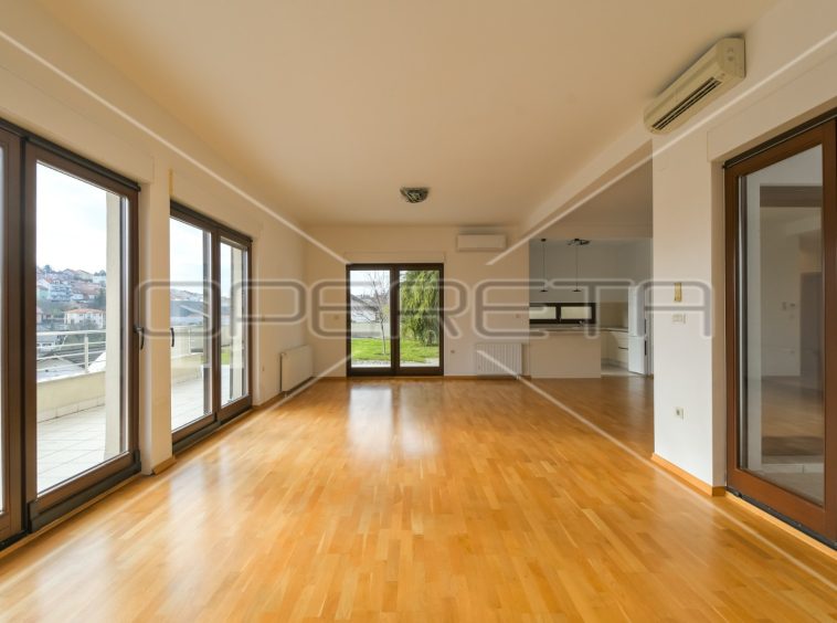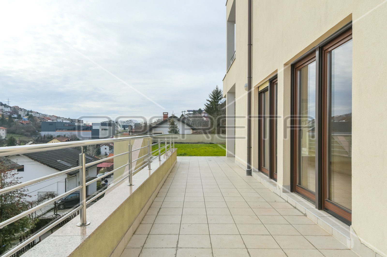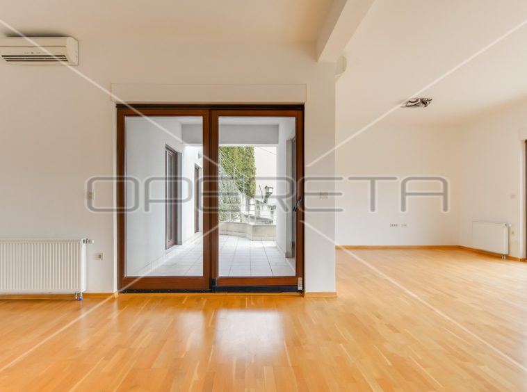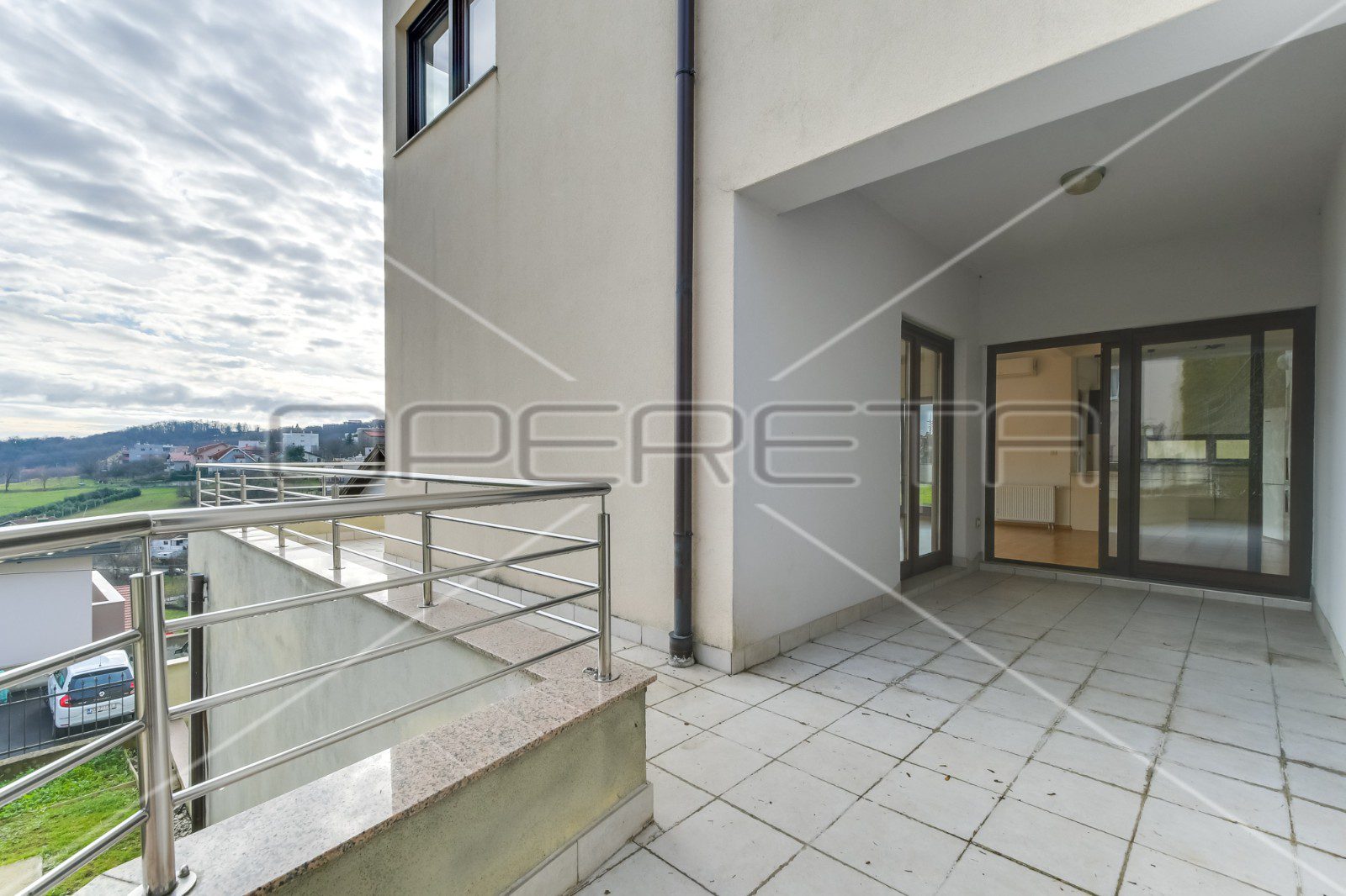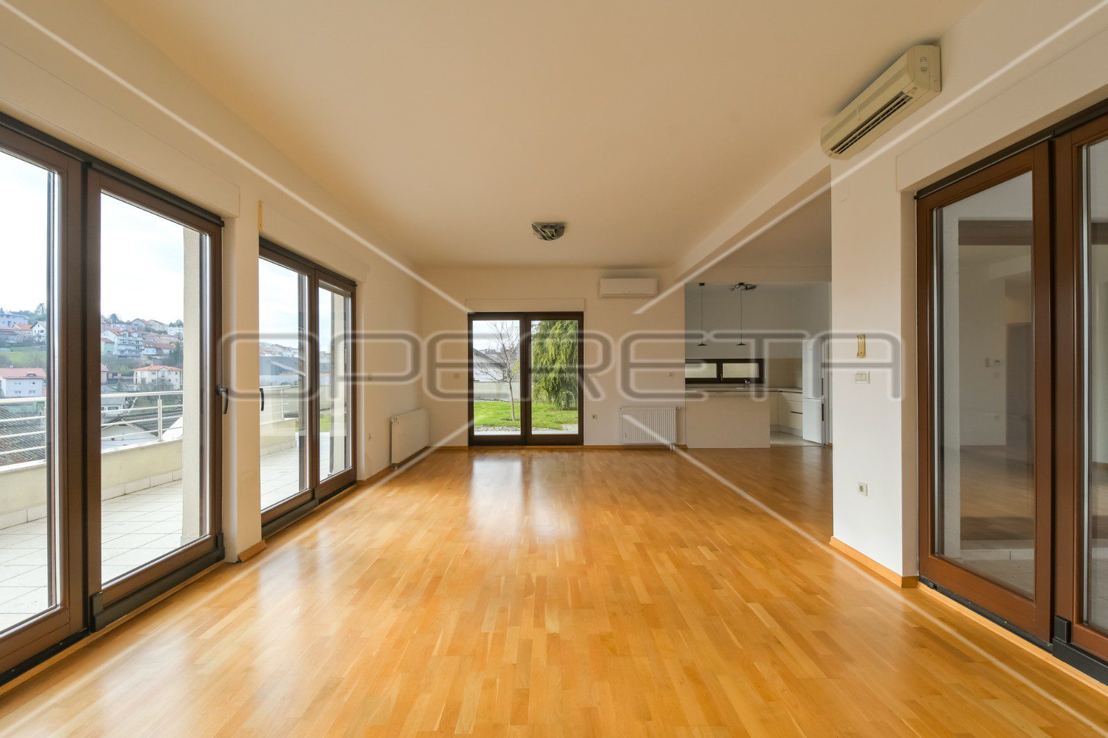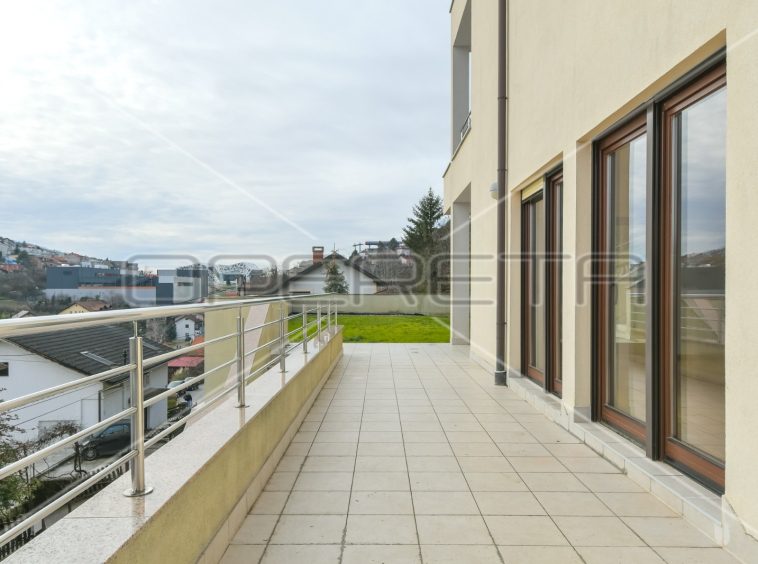 RENT OF 5-ROOM APARTMENT WITH GARAGE, 150 m2. In the Podsljemne part of the city, in a natural and peaceful environment with a beautiful view, an unfurnished apartment is for rent, consisting of 4 bedrooms, 3 bathrooms, a toilet, a kitchen with a dining room and a living room with access to a terrace and a garden. The apartment is surrounded by several balconies and terraces and has its own small garden, garage and one parking space, and is directly accessible by elevator. It is only 6 minutes to the grocery store, the bakery, and the bus station. A very pleasant and bright apartment, suitable for all those looking for a stay in nature, not far from the city.