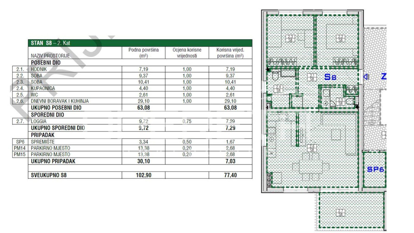 The apartment includes a 3 m² storage room and two parking spaces, each measuring 13 m².