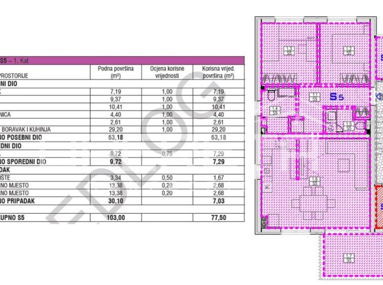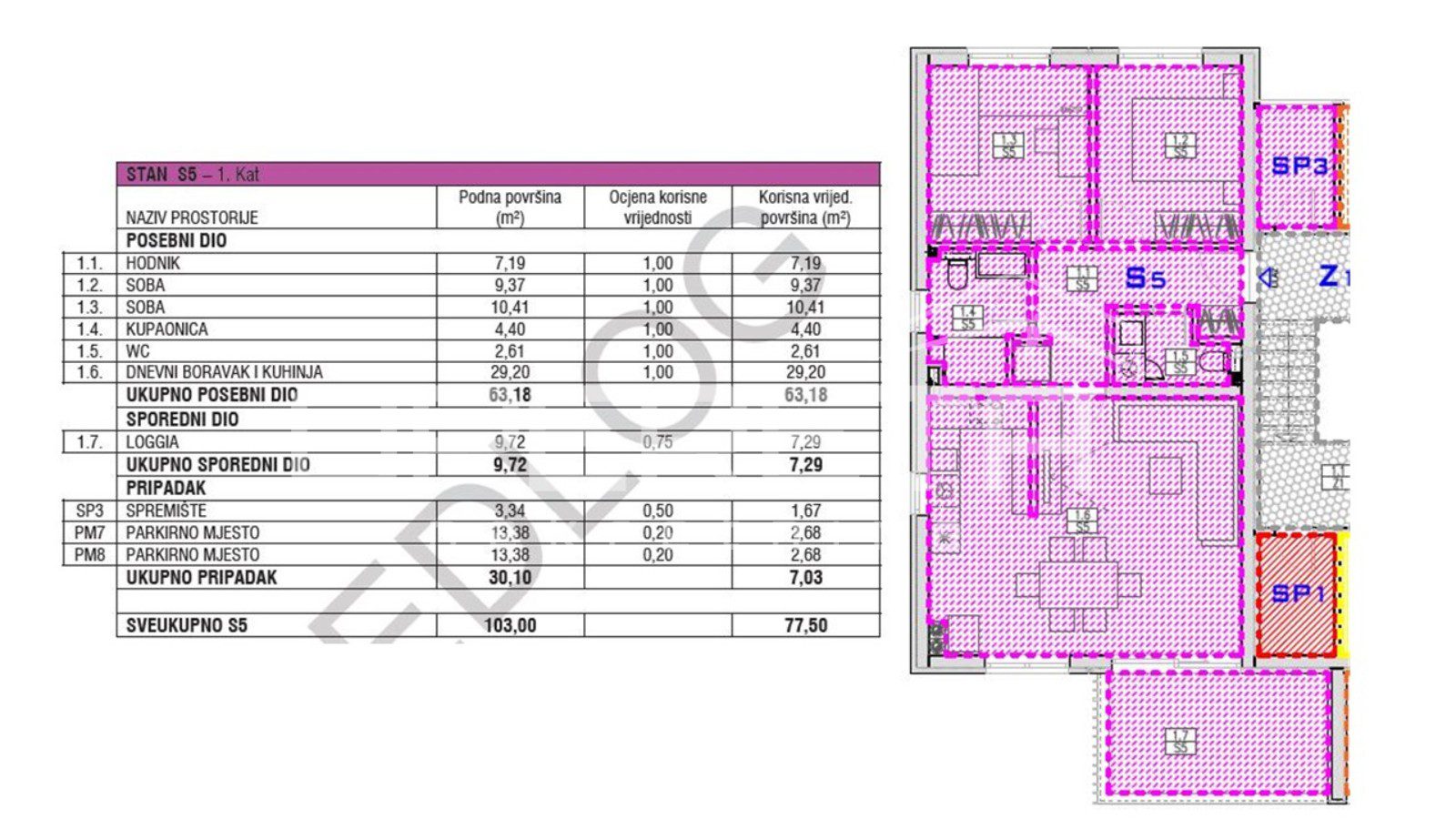 The total gross area of the apartment, including all its parts, amounts to 103 m², while the net usable area is 78 m².