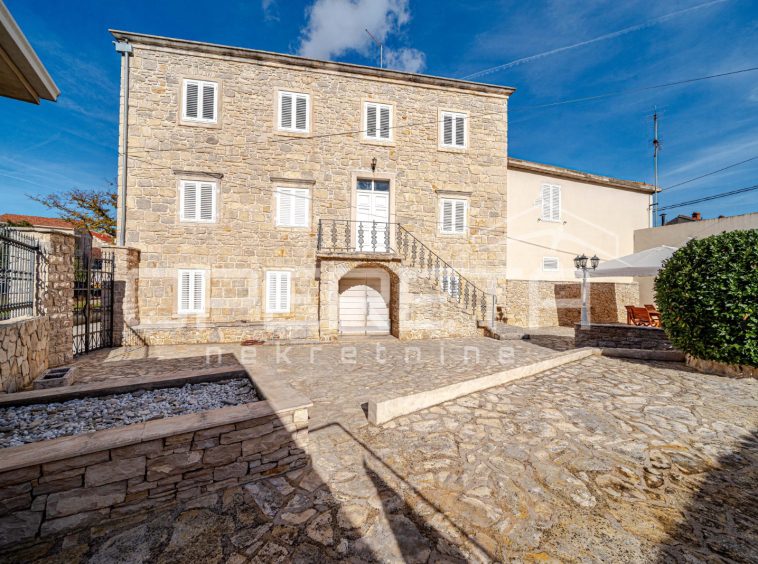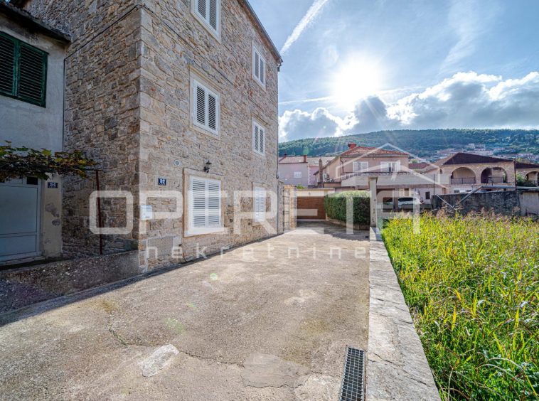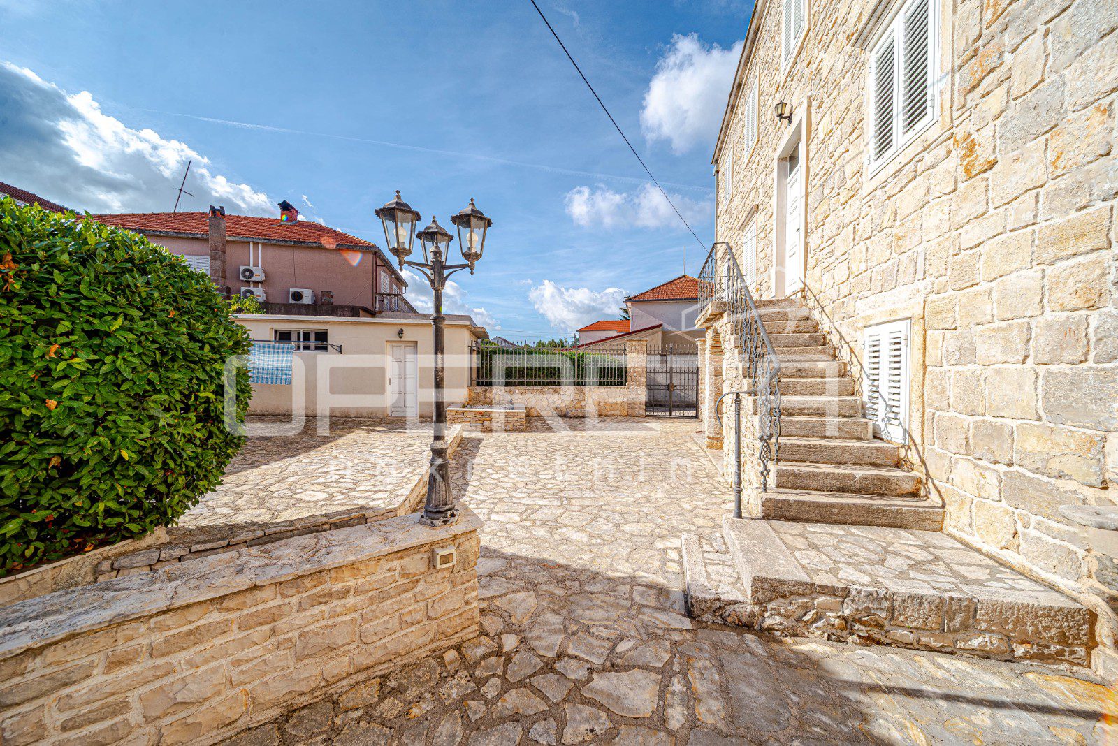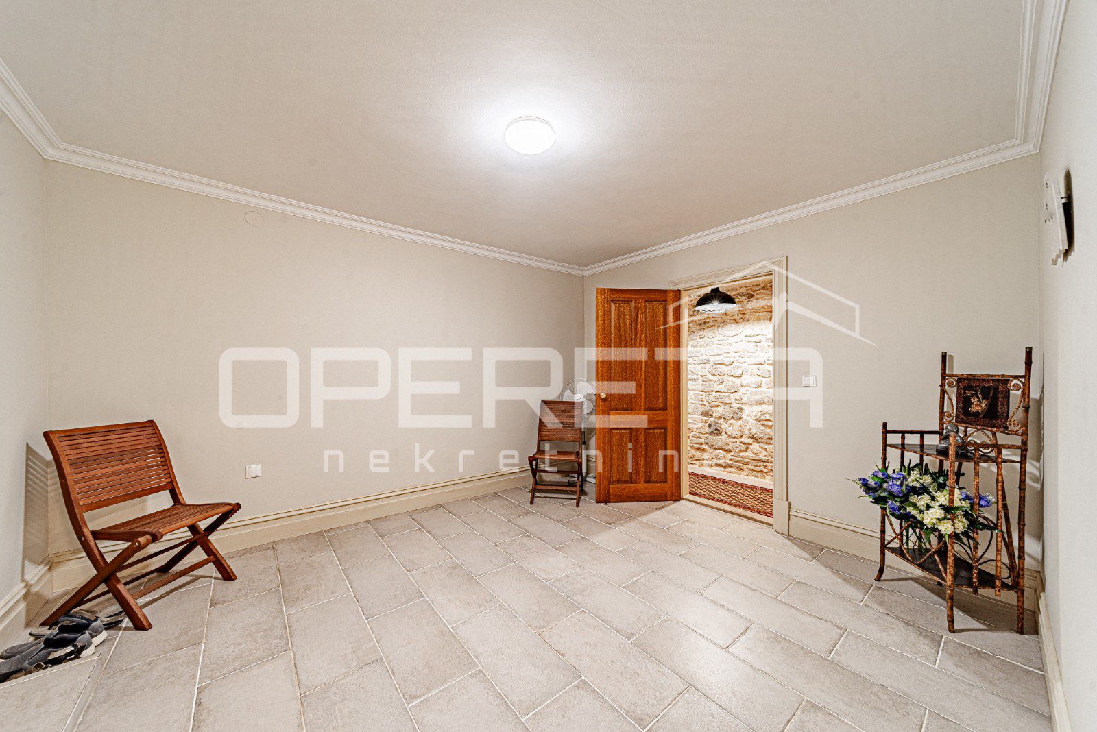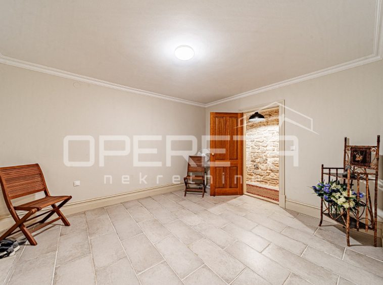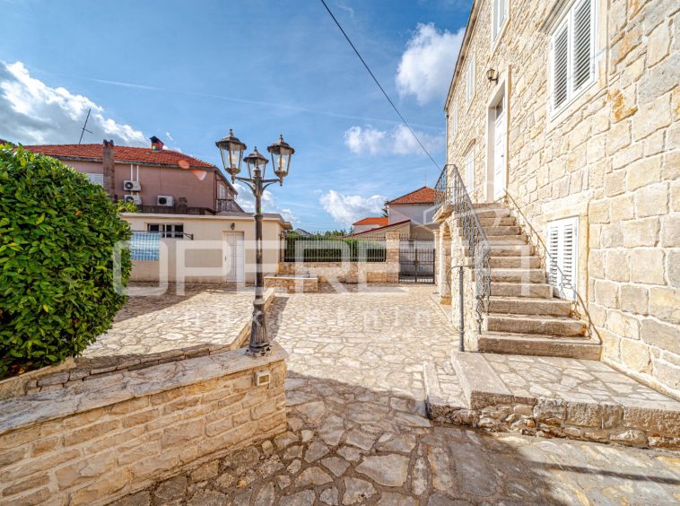 The impressive exterior is fully clad in natural stone, while the spacious courtyard is finished with rustic paving and Mediterranean details that further enhance the distinctive Dalmatian atmosphere. The courtyard also features a 36 m² garage, and its generous size allows for the installation of a pool, jacuzzi, or the creation of an additional lounge zone. Adjacent to the house is a building plot offering the possibility of constructing additional facilities or expanding the parking area.