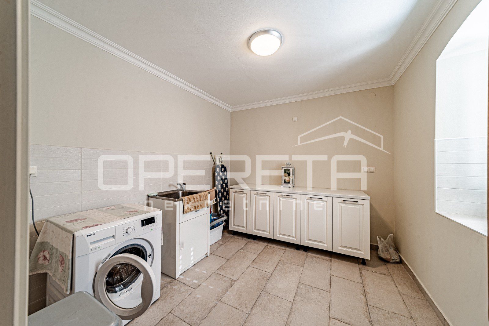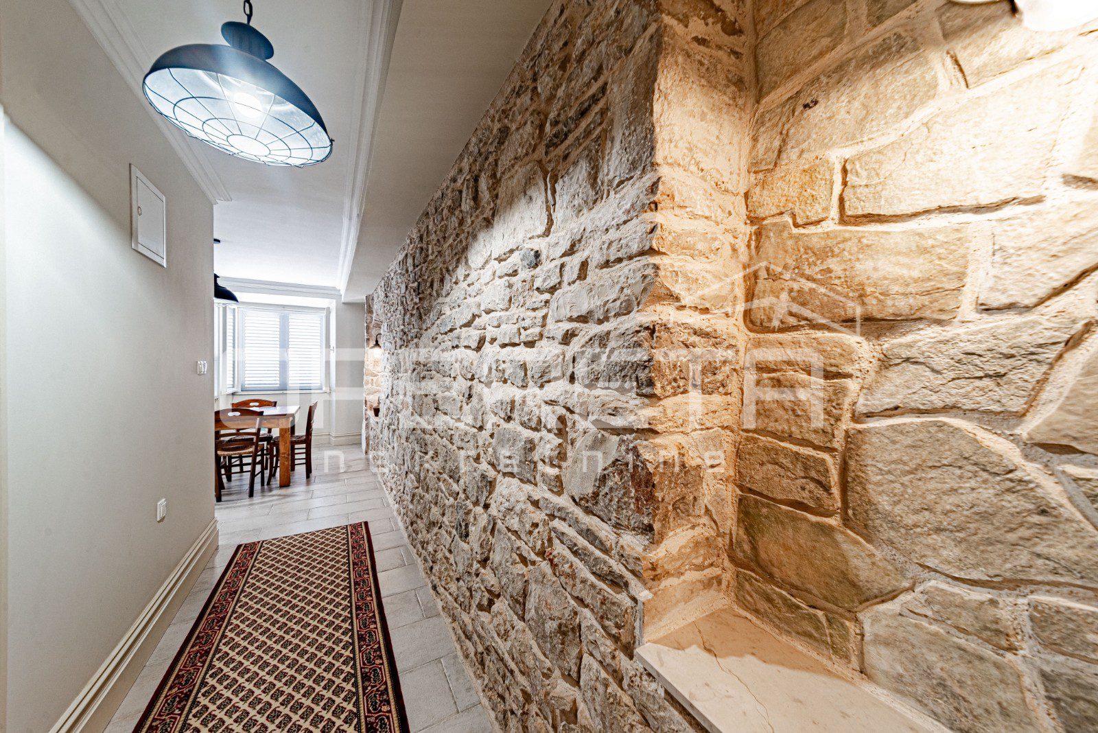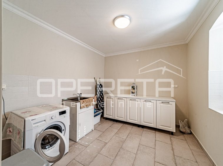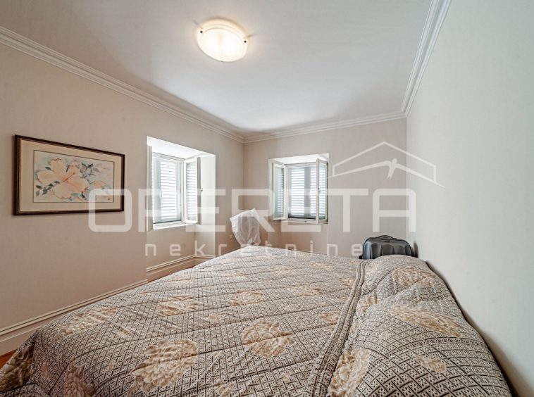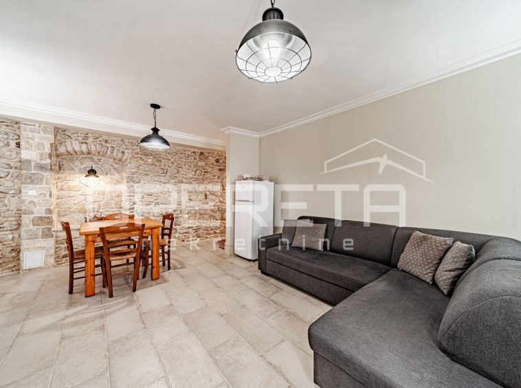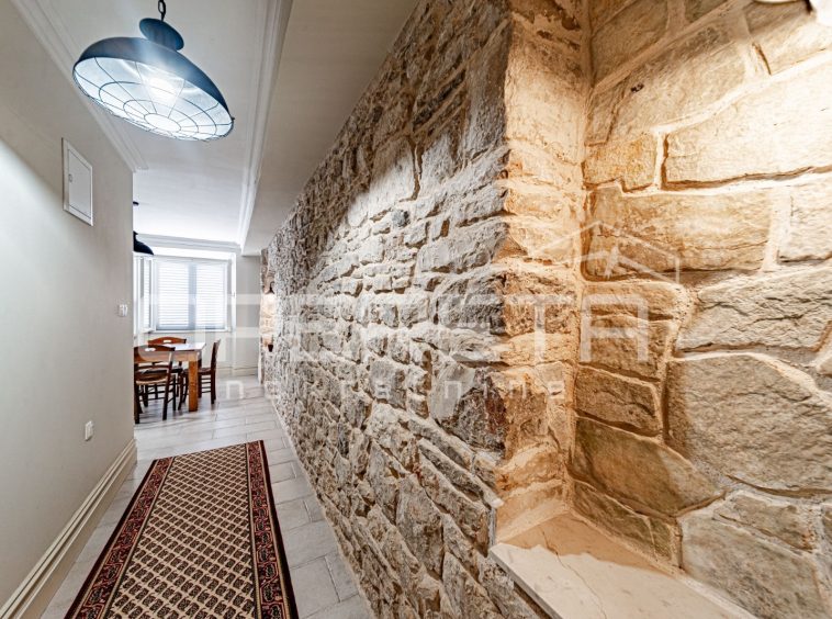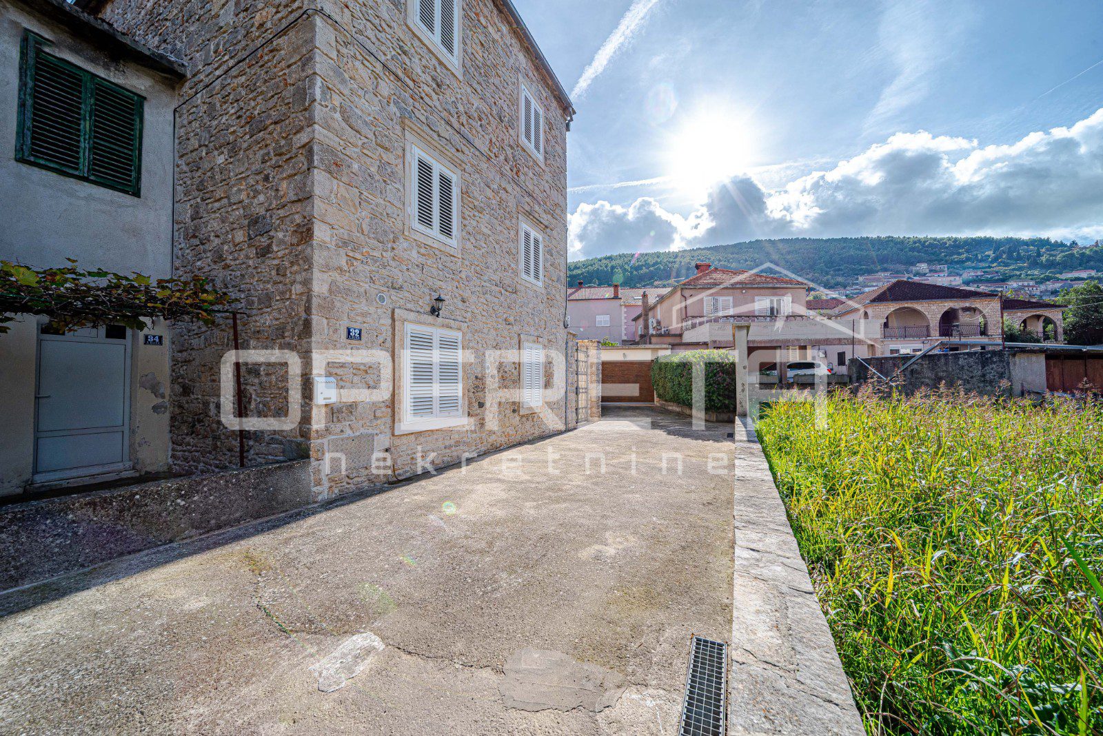 The impressive exterior is fully clad in natural stone, while the spacious courtyard is finished with rustic paving and Mediterranean details that further enhance the distinctive Dalmatian atmosphere. The courtyard also features a 36 m² garage, and its generous size allows for the installation of a pool, jacuzzi, or the creation of an additional lounge zone. Adjacent to the house is a building plot offering the possibility of constructing additional facilities or expanding the parking area.