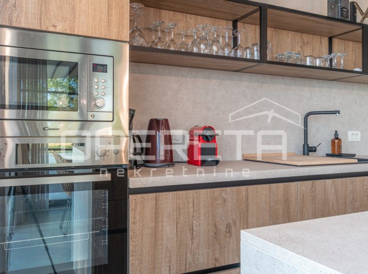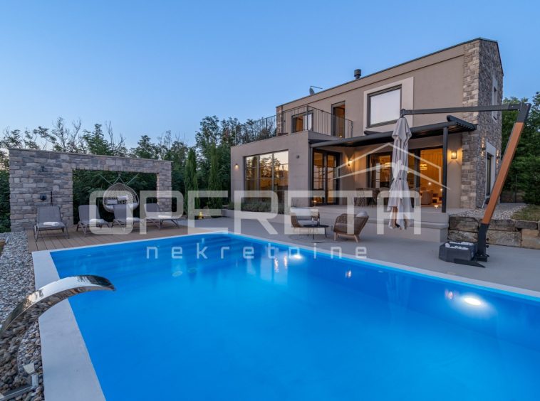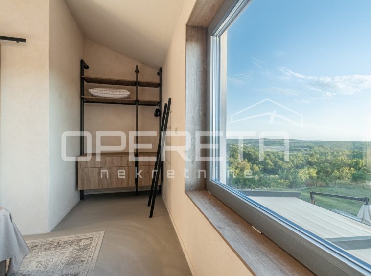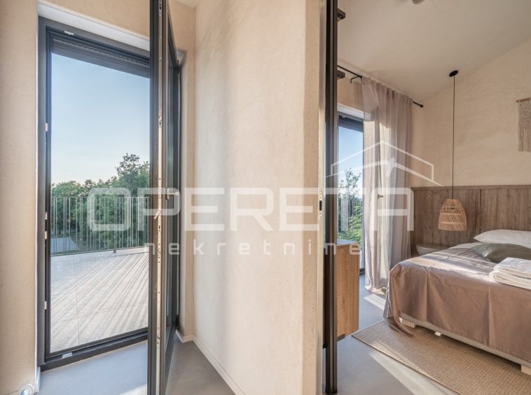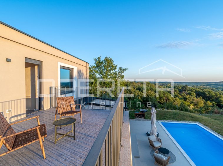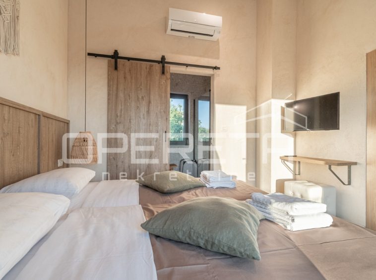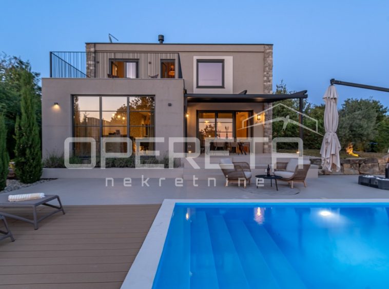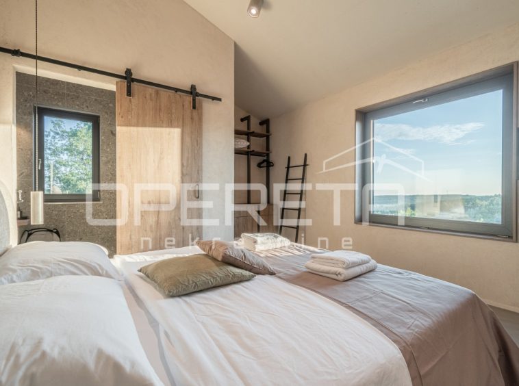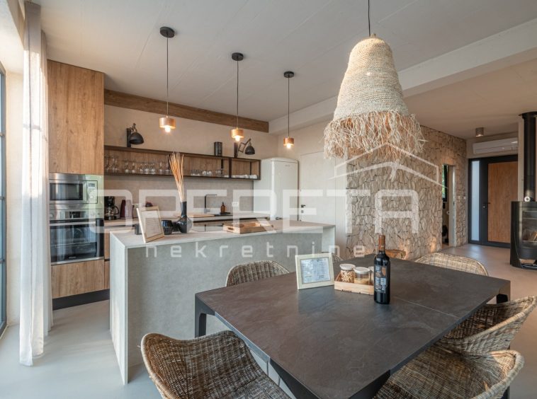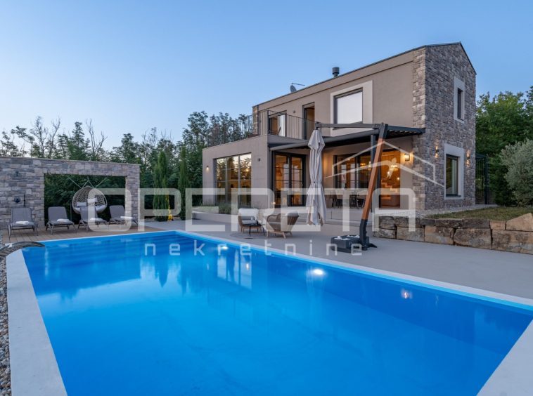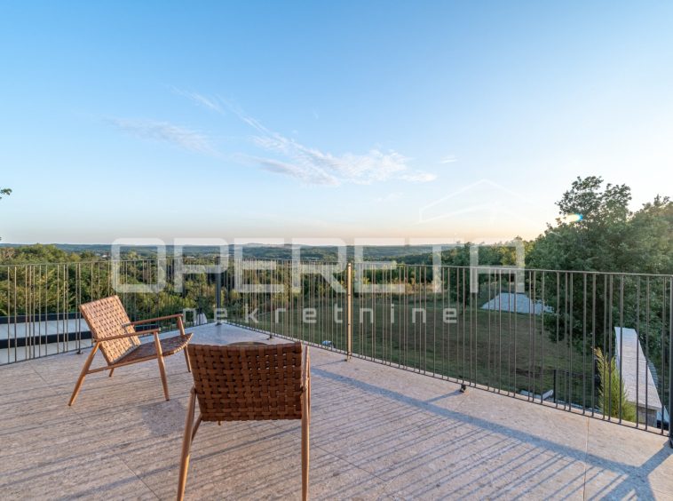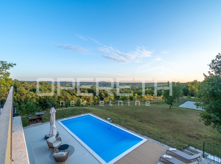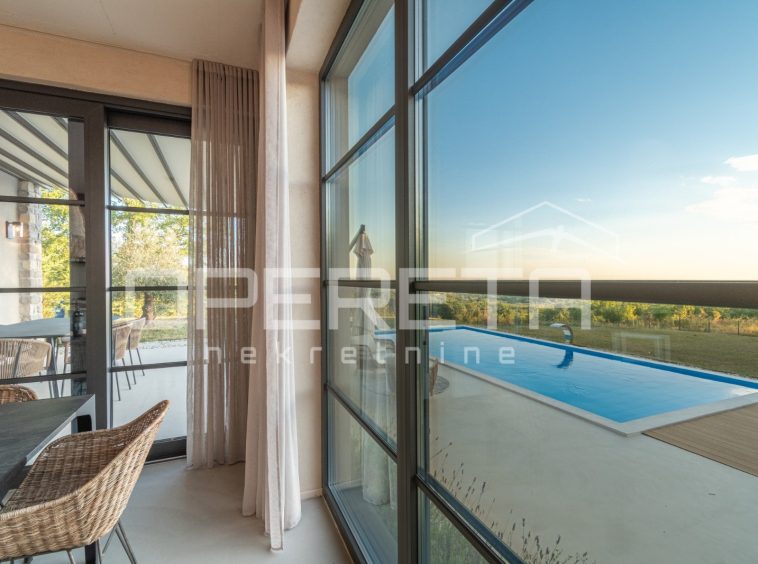 For sale, a newly built and completely refurbished villa with a heated swimming pool and volleyball court on a 2000m² plot in the vicinity of Karojba (10 minutes from Motovun).