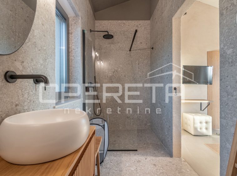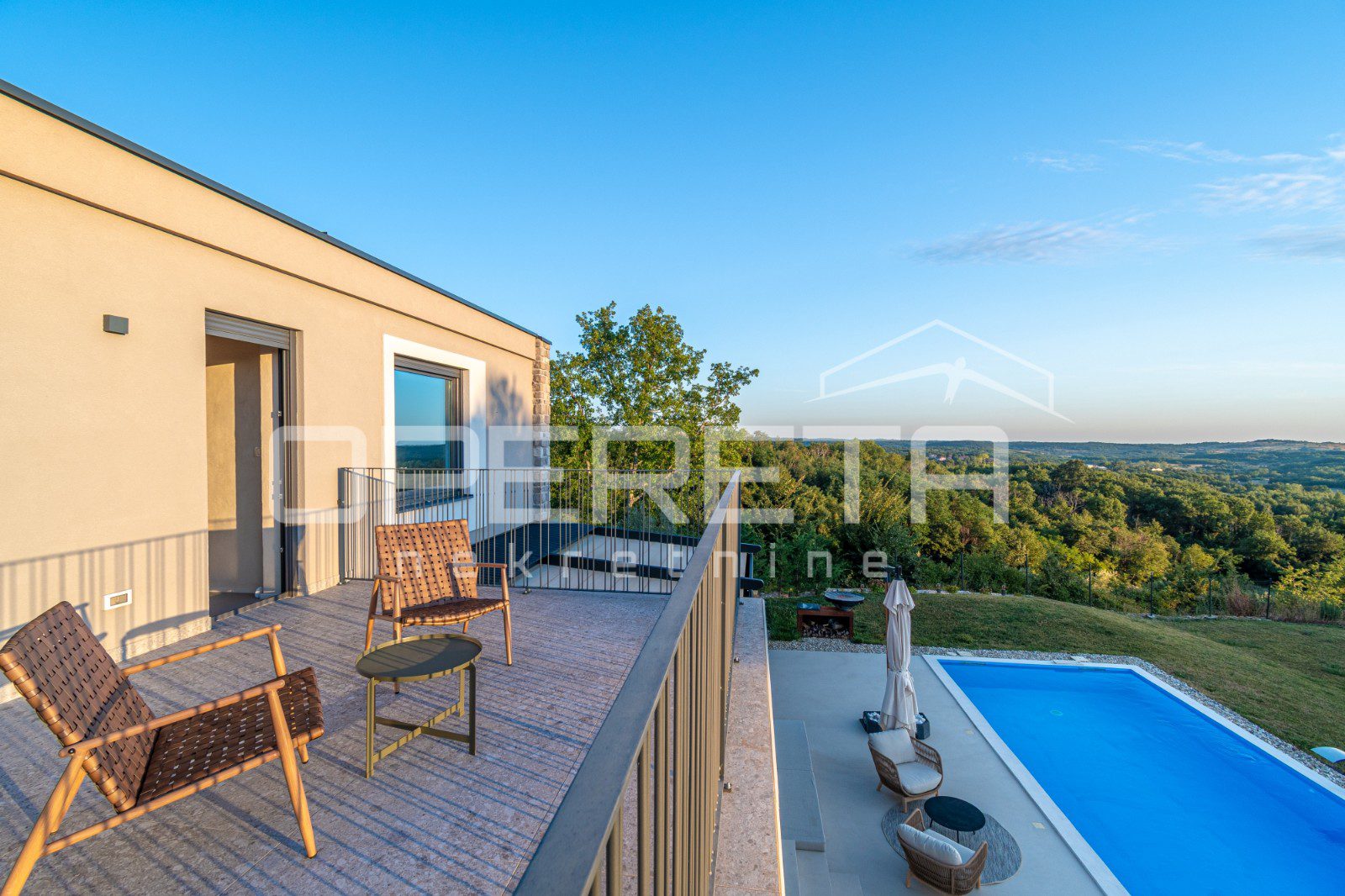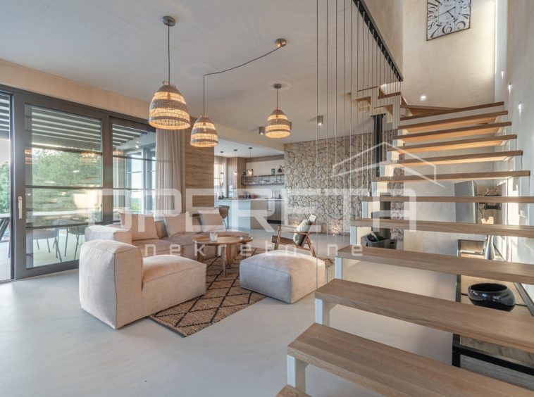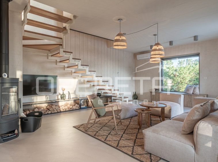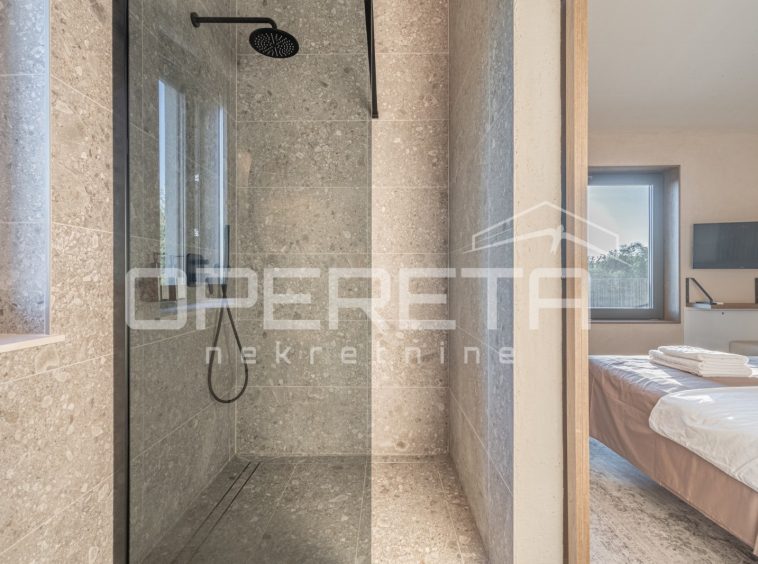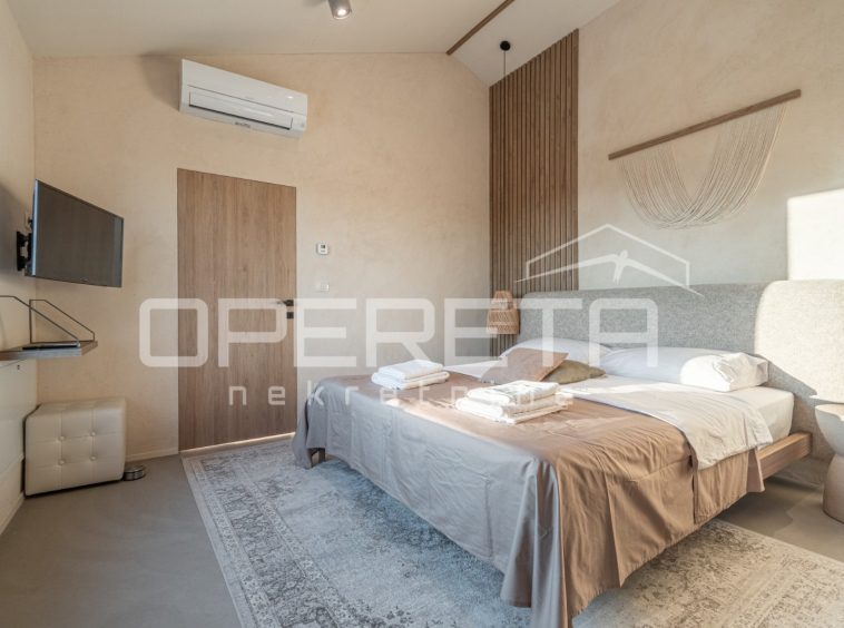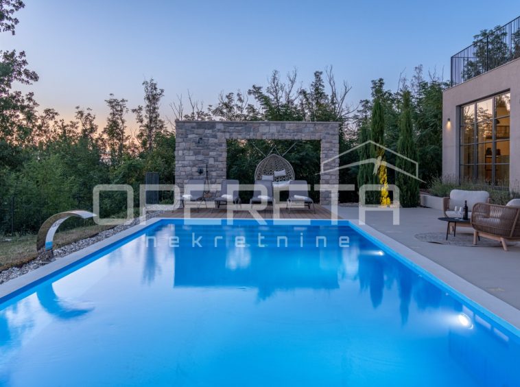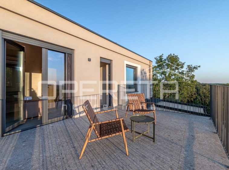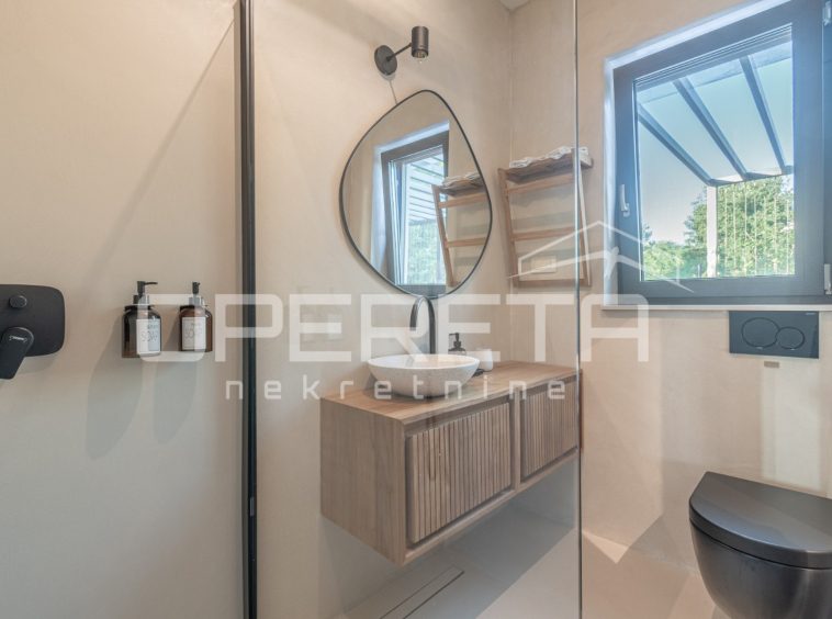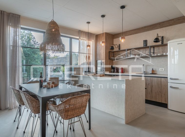 For sale, a newly built and completely refurbished villa with a heated swimming pool and volleyball court on a 2000m² plot in the vicinity of Karojba (10 minutes from Motovun).