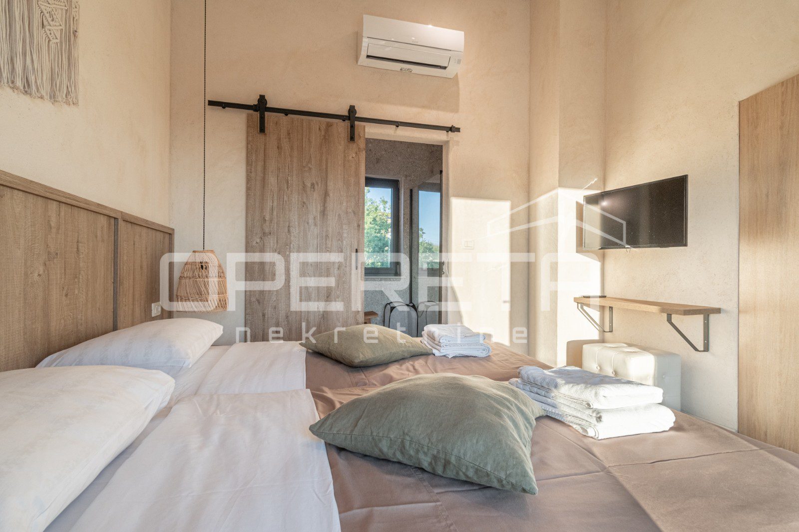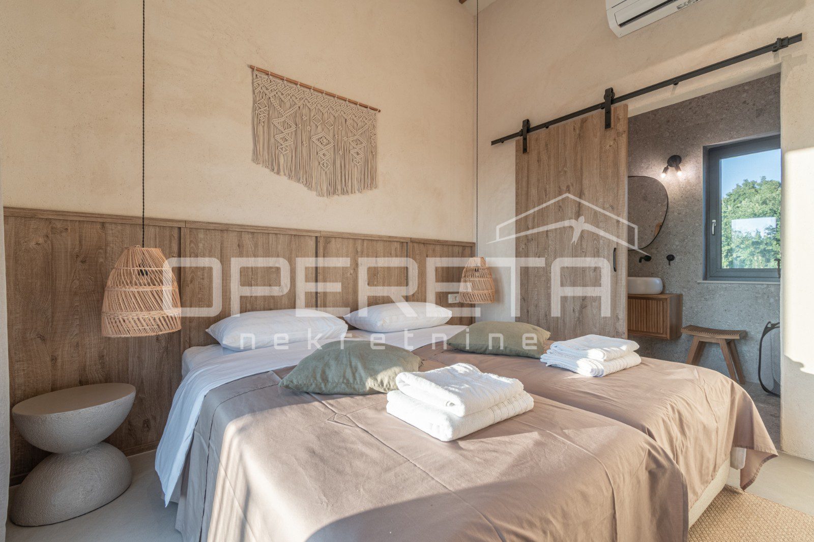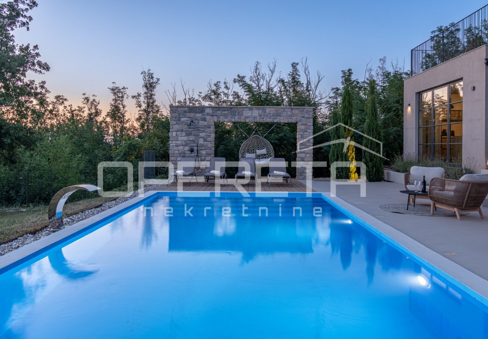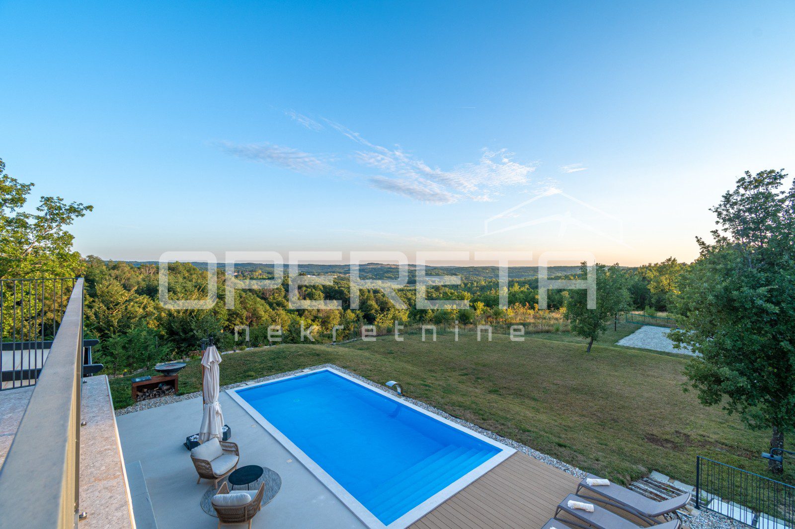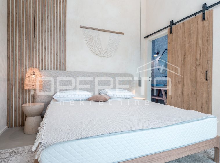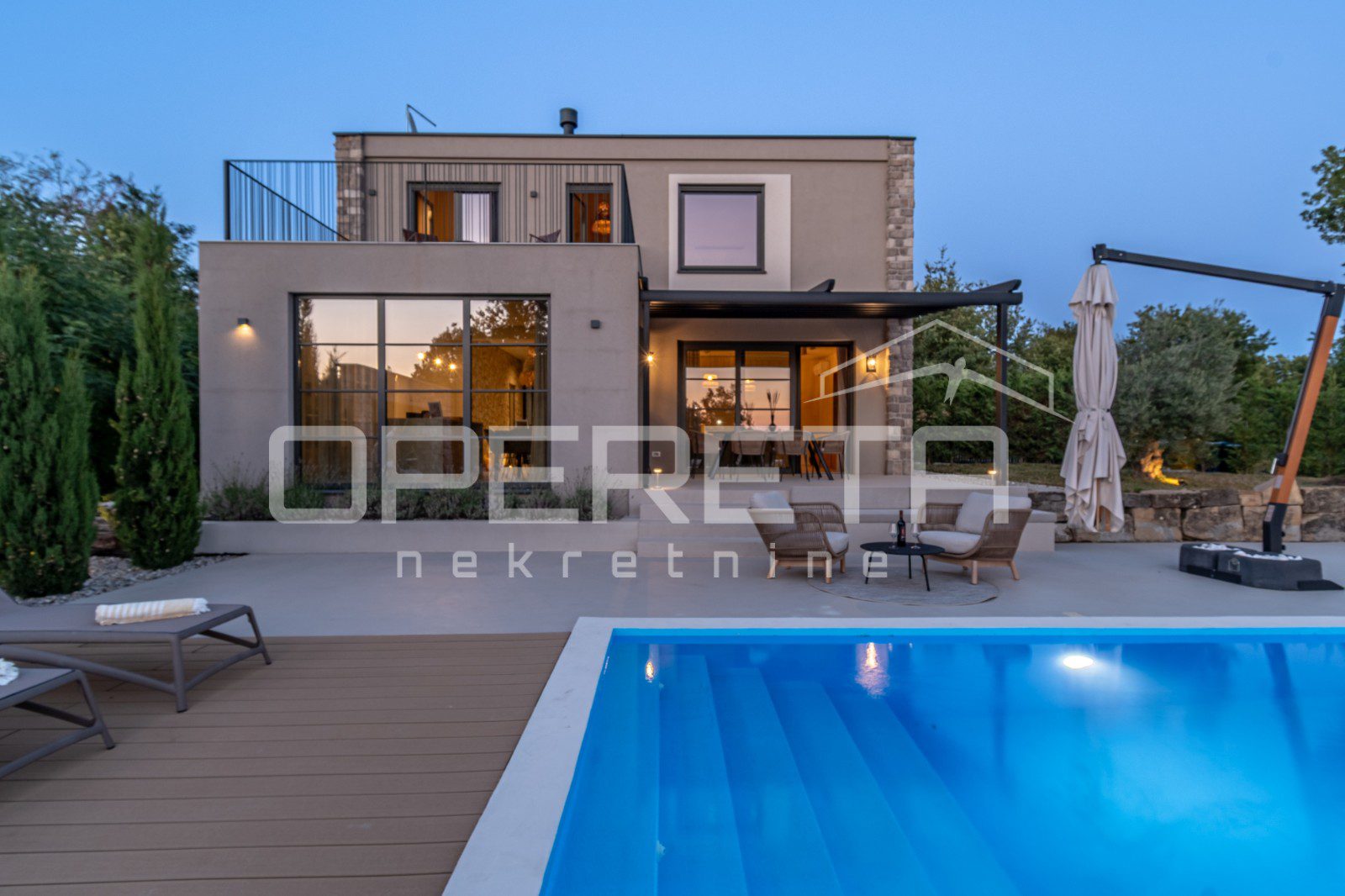 For sale, a newly built and completely refurbished villa with a heated swimming pool and volleyball court on a 2000m² plot in the vicinity of Karojba (10 minutes from Motovun).