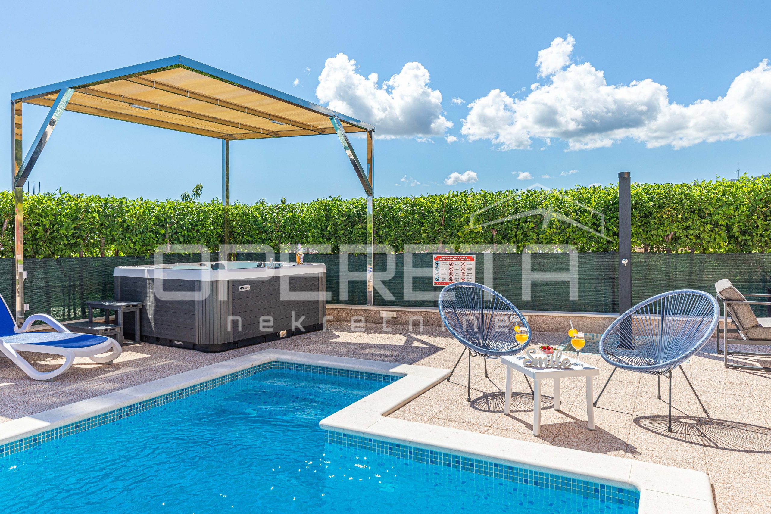 The villa extends over 260 square meters of living space spread over two floors, while the 286 square meter garden offers a fully furnished outdoor space with a spacious and modern swimming pool, sundeck and auxiliary building. It is designed as two separate residential units with separate entrances, which allows for flexibility of use and is an ideal solution for a large family or a tourist rental with a high return on investment.