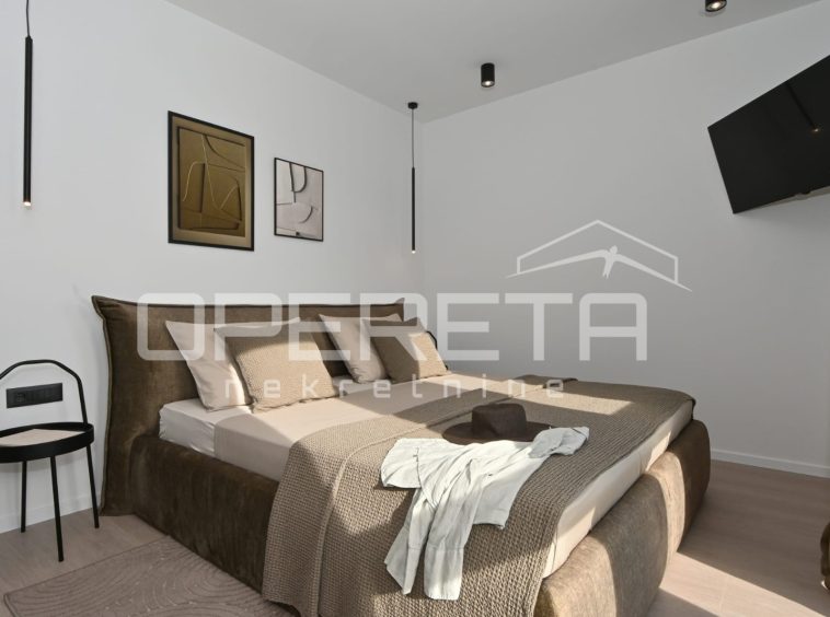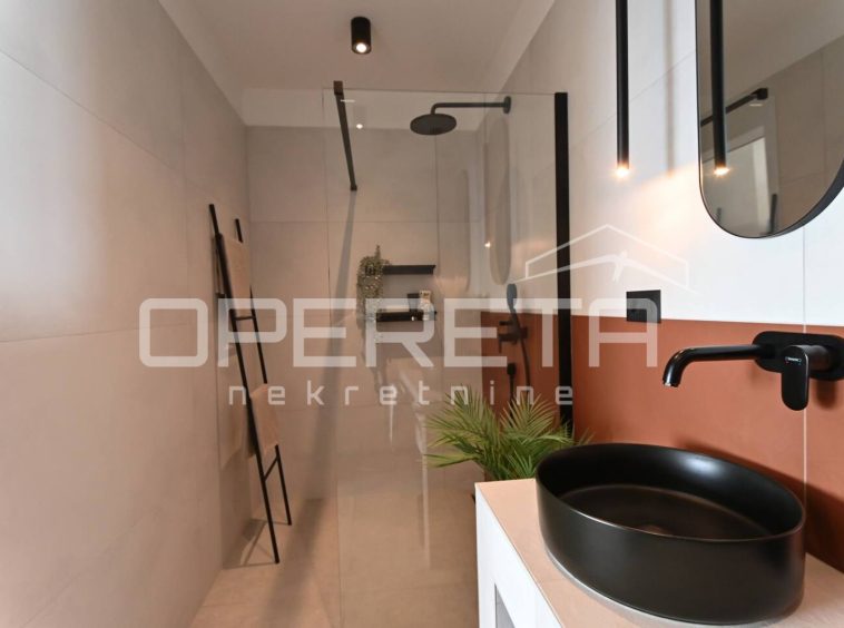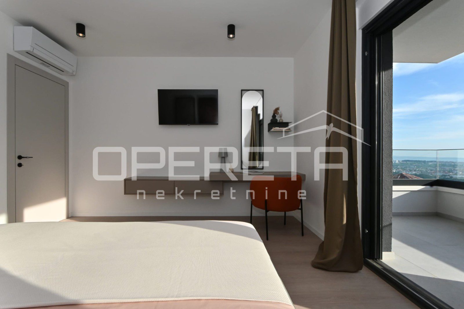 Ground floor – Open-plan living room, dining area, and kitchen with large glass walls providing abundant natural light and spectacular views of the city of Split, the sea, and the islands. The kitchen is equipped with high-quality materials and appliances, while the interior is enhanced with carefully selected natural materials and designer details.