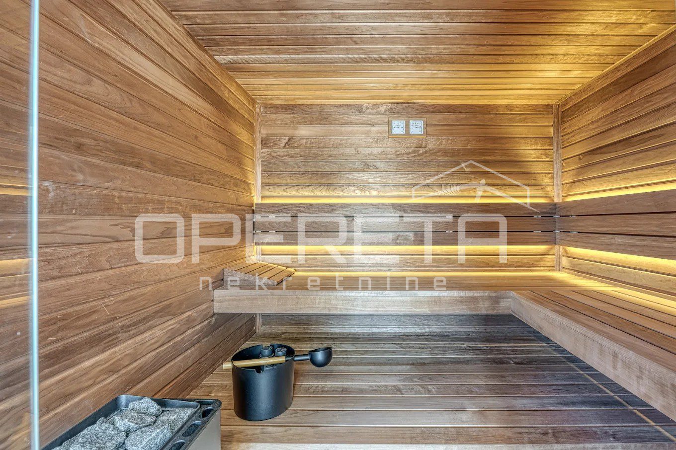 The main house offers four bedrooms and five bathrooms, a spacious living area with a fireplace, and a fully equipped kitchen with an open hearth and direct access to the terrace. A separate guest house provides additional accommodation, including a living area, gallery bedroom, panoramic terrace, and a private spa area with sauna, bathtub, and shower.