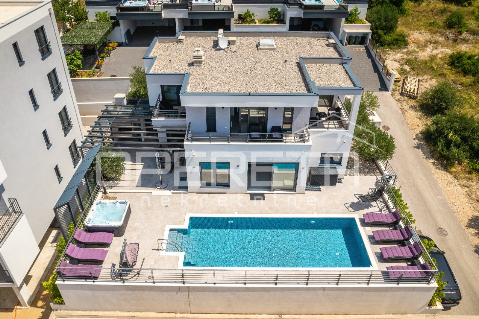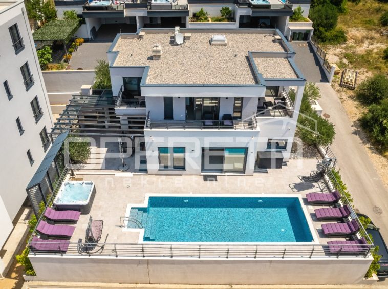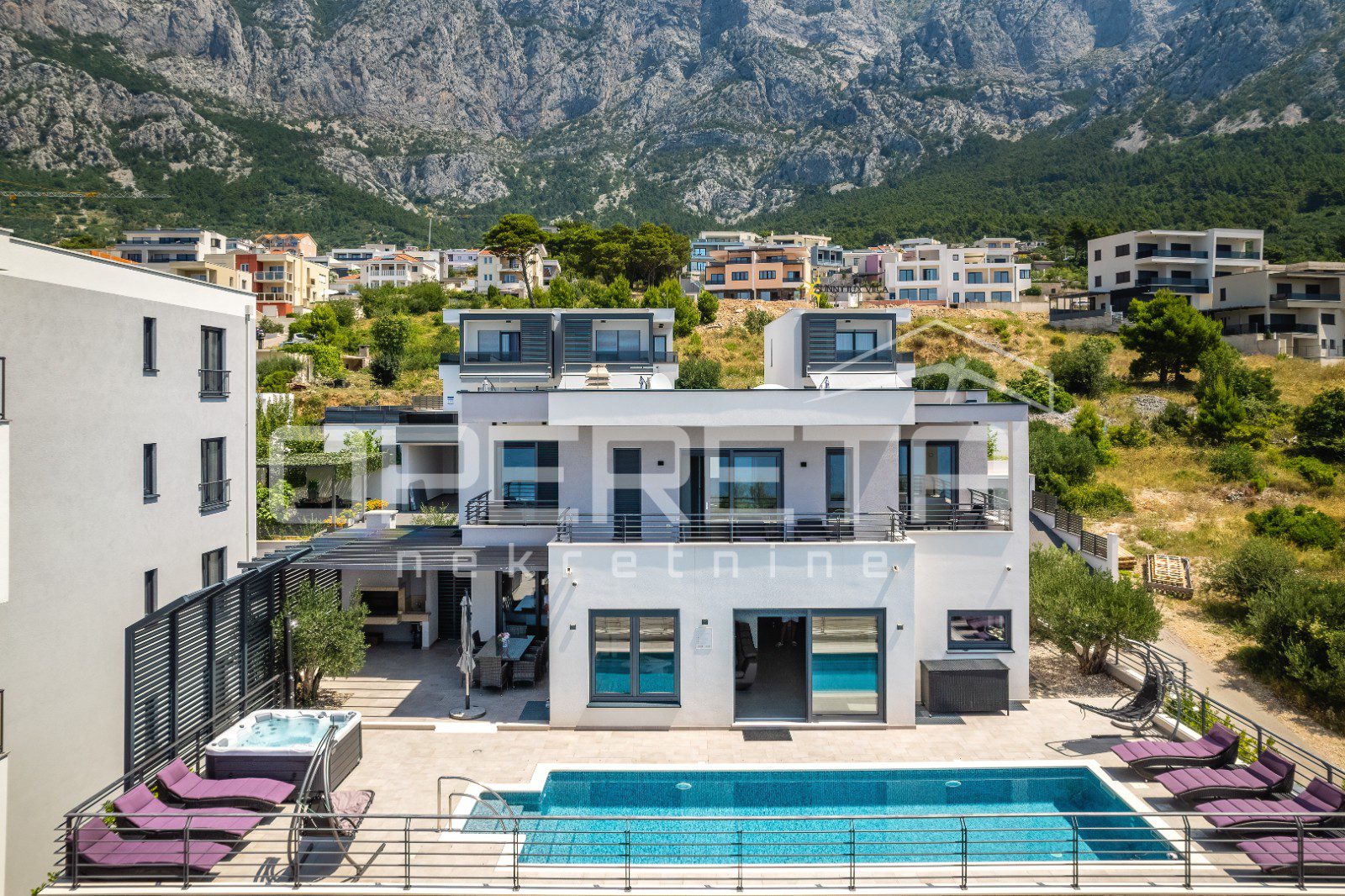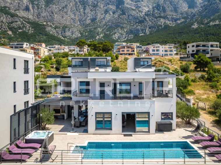 In the very heart of Makarska, on a prestigious location between the sea and the mountains, lies this exceptional luxury villa that blends contemporary design, comfort, and Mediterranean ambience. From the very first moment, it captivates with panoramic views of the sea, the city of Makarska, and Mount Biokovo, creating a unique atmosphere perfect for relaxation and a sophisticated lifestyle.
