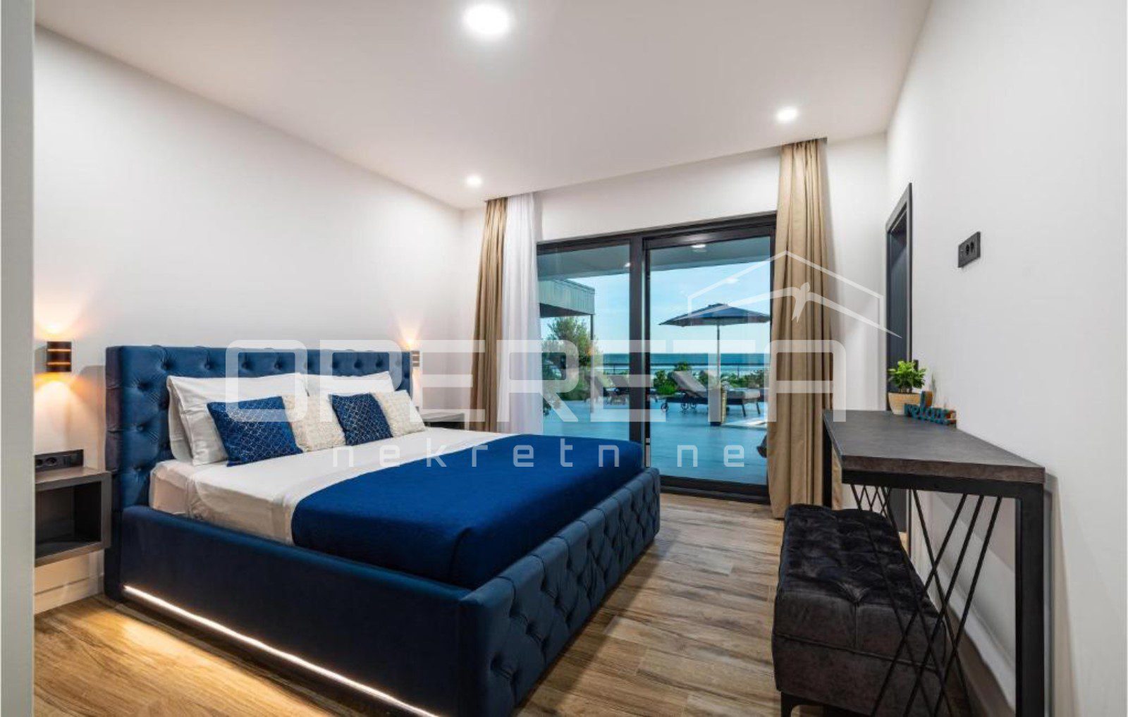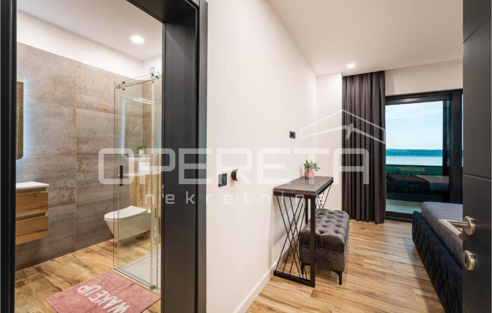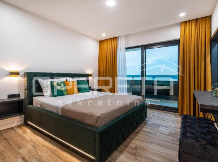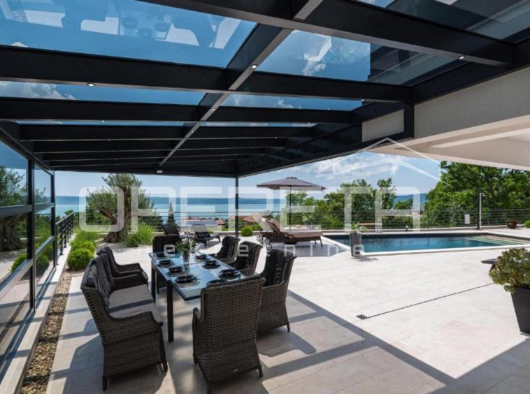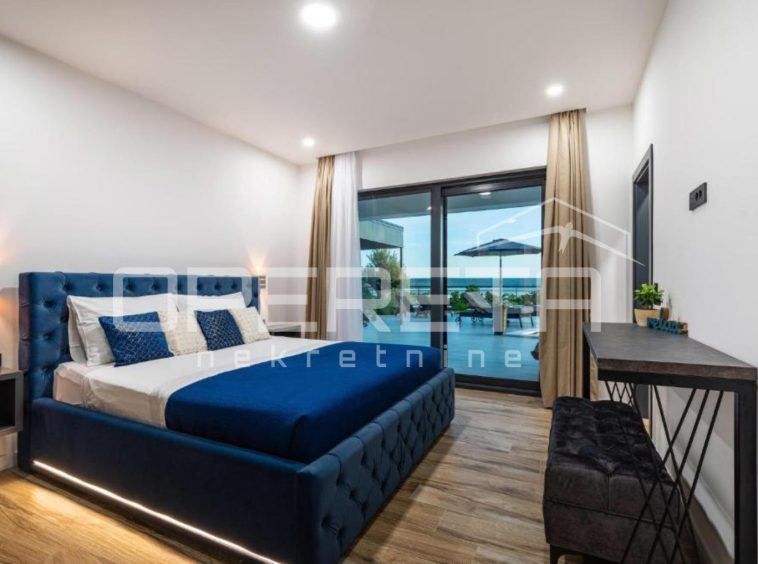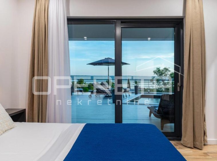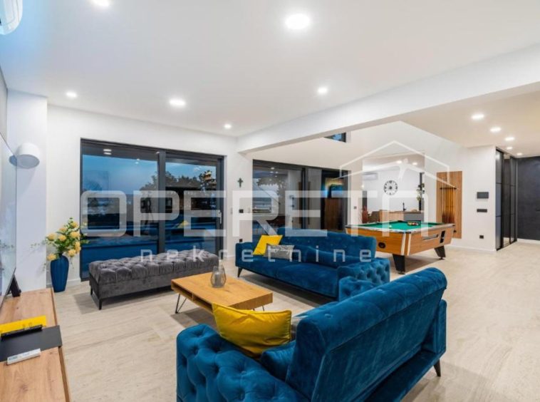 A special feature of this property is the exterior – a unique terrace for relaxation with a dining area and barbecue, a sunbathing deck with loungers, and an outdoor seawater pool of 35 m². From this level, you can enjoy an uninterrupted and stunning sea view.