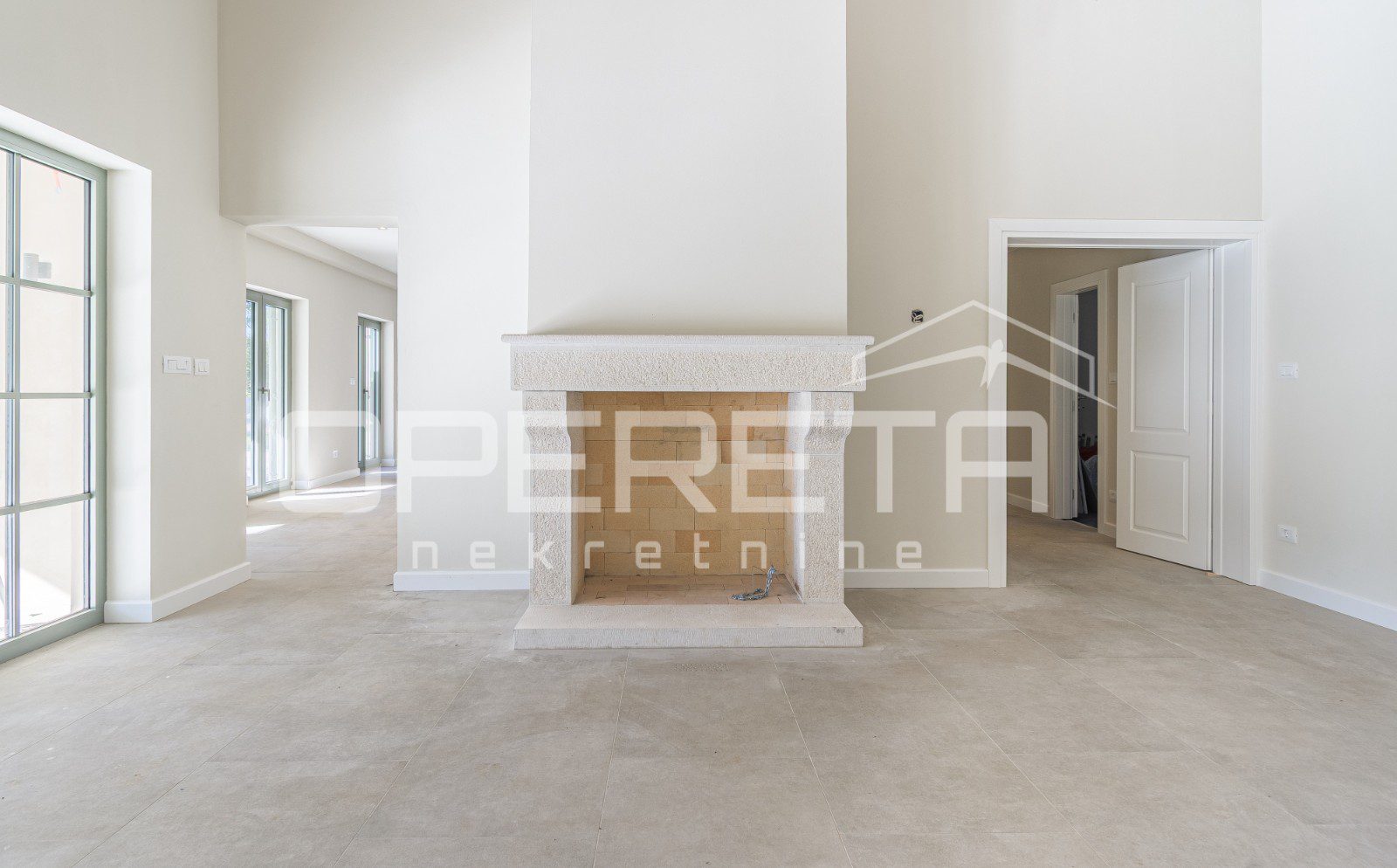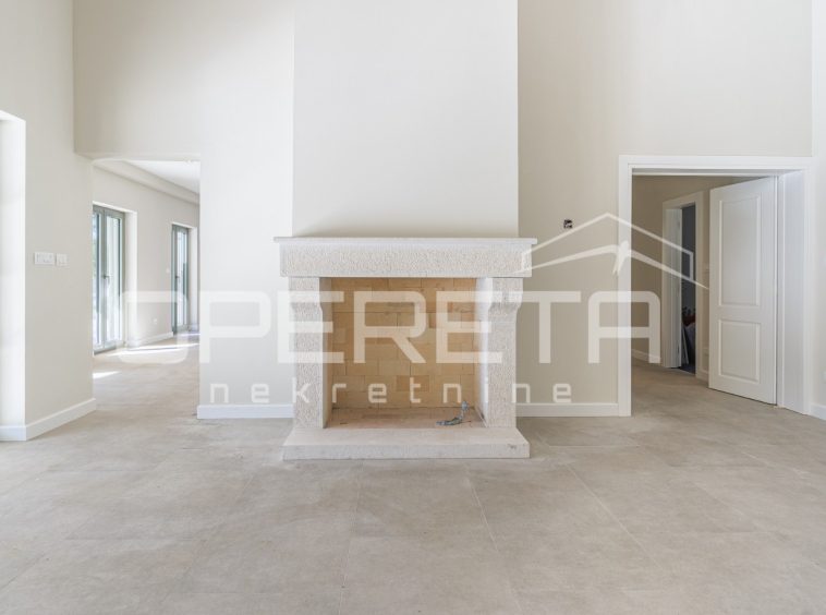The ground floor features an entrance hall, a spacious kitchen with dining area, a living room dominated by a beautiful fireplace, a guest WC, and one bedroom with its own bathroom. Each room on the ground floor has direct access to the covered terrace, expansive sundecks, and the pool, creating a perfect blend of indoor and outdoor living.