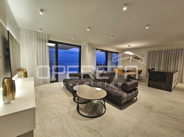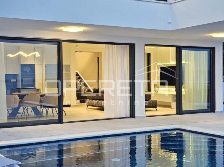 On the ground level is a garage separated by the glass window from the gym and spa area. Climbing the impressive marble stairs, we enter the living room on the upper ground floor – organized as an open concept with light coming from the spacious glass windows. There is also the main entrance through an elegant front door – the layout accommodates an ultra-modern kitchen with dining area, spacious living room, a toilet, and a double bedroom with bathroom. Through the large glass walls, the living room extends to the connected to the carefully designed outside area – a terrace and 40-square meter large cooled/heated swimming pool, a sun deck, a barbecue area, as well as lounge area. A beautiful garden enriched with Mediterranean plants surrounds the house, making it ideal for fun, socializing, and relaxation.