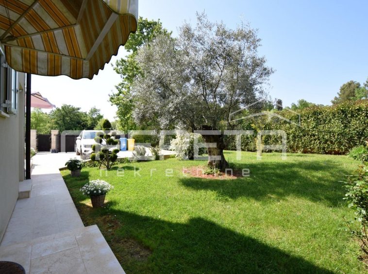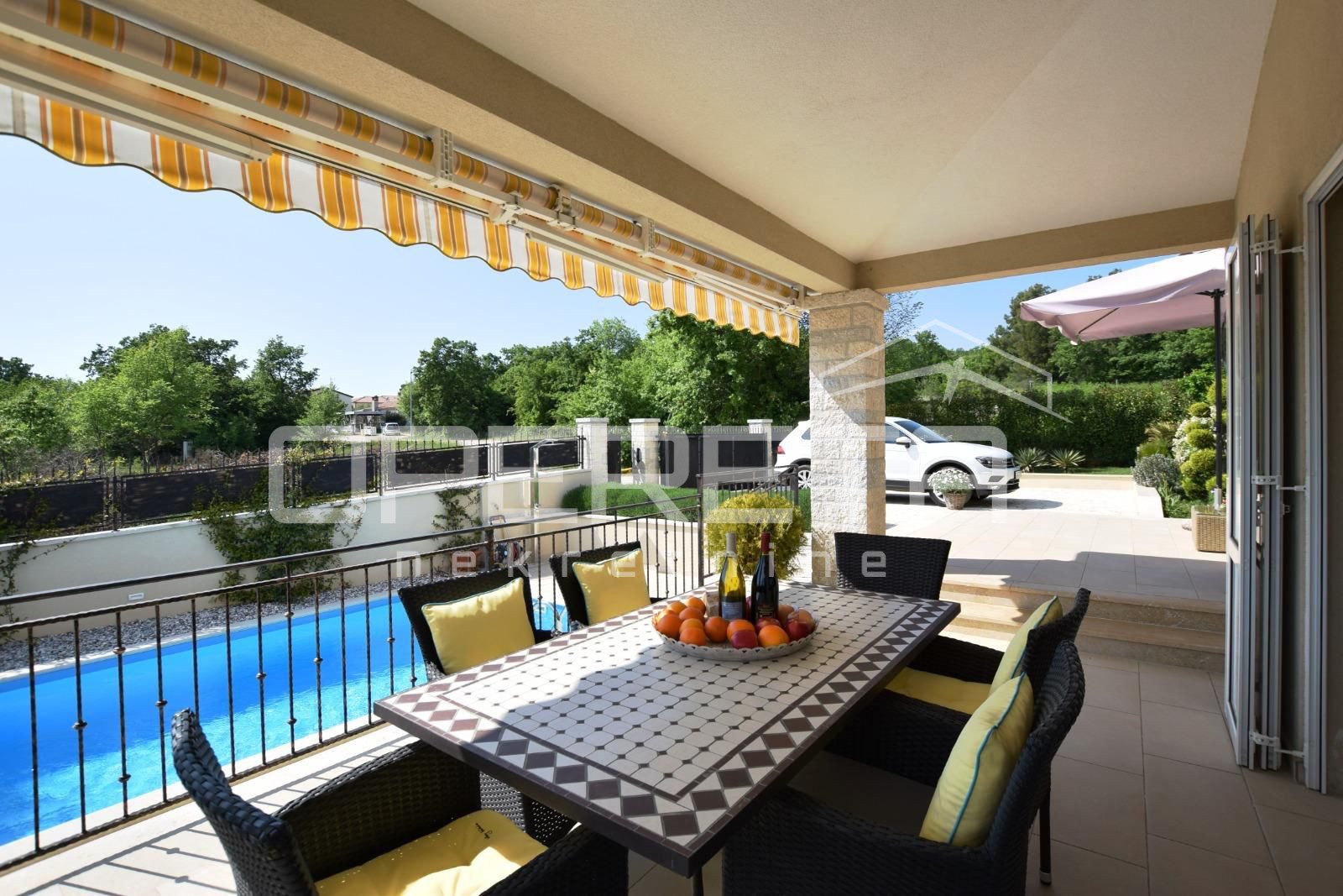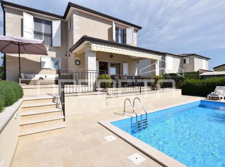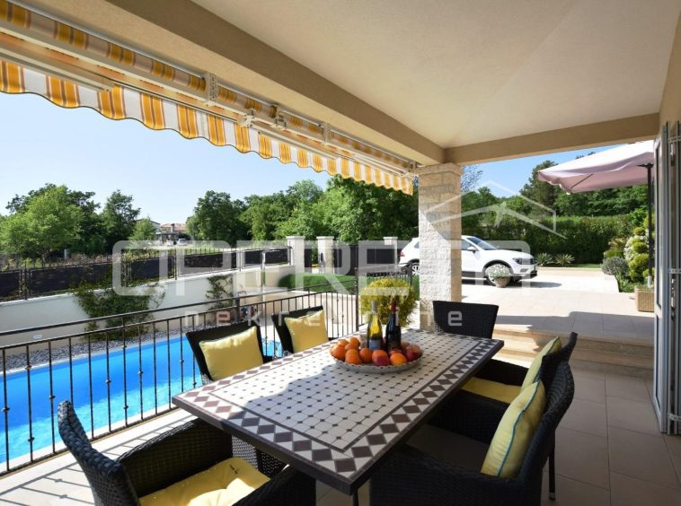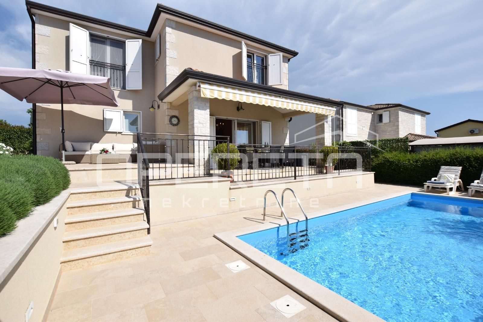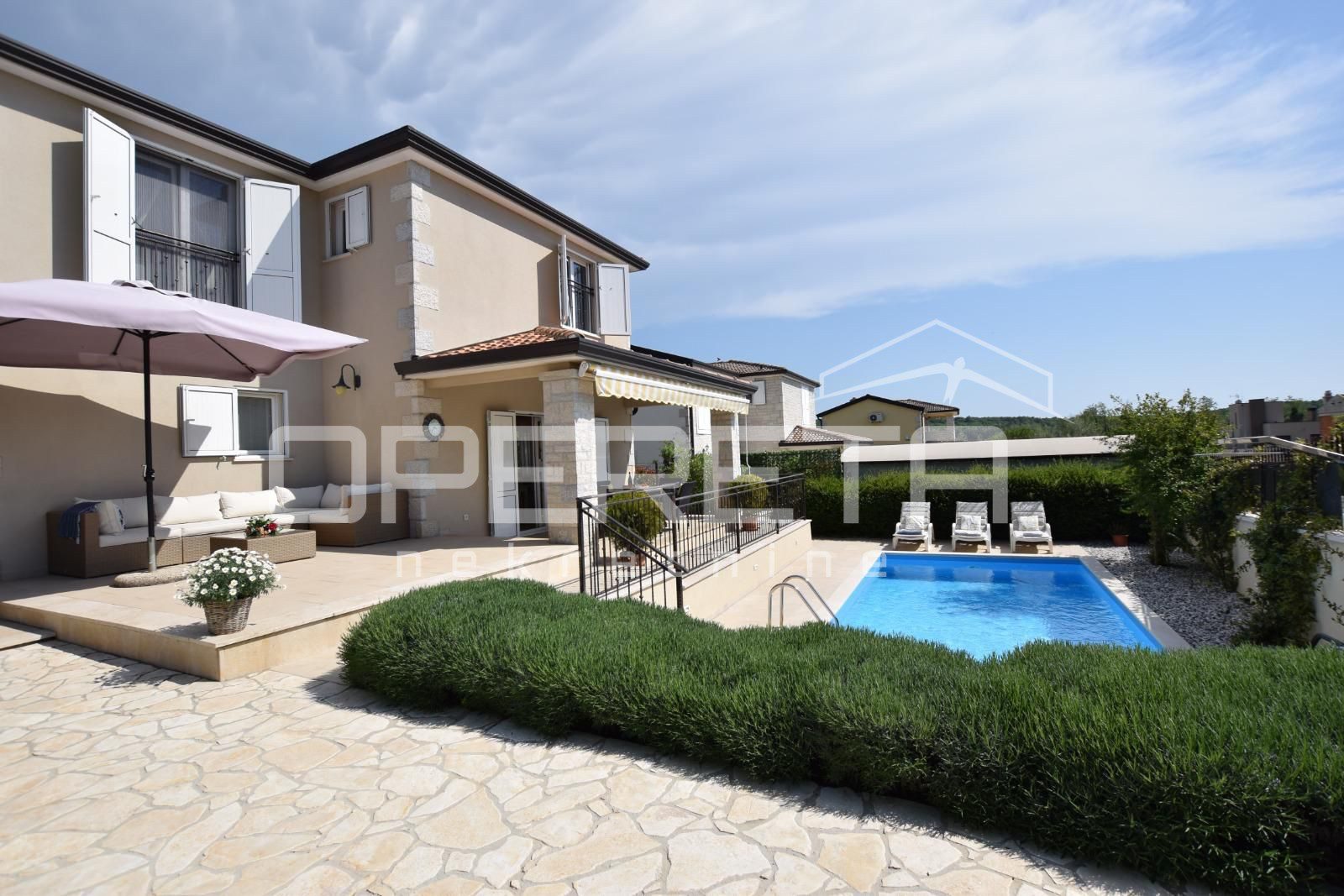 Heating is provided by a heat pump-driven underfloor heating system, along with additional air conditioning units for temperature regulation. The beautifully arranged courtyard features a 24 m² swimming pool with a sunbathing area and a well-maintained garden. The nearest beaches are only 4–5 km away, and the center of Poreč can be reached in about 10 minutes by car.
