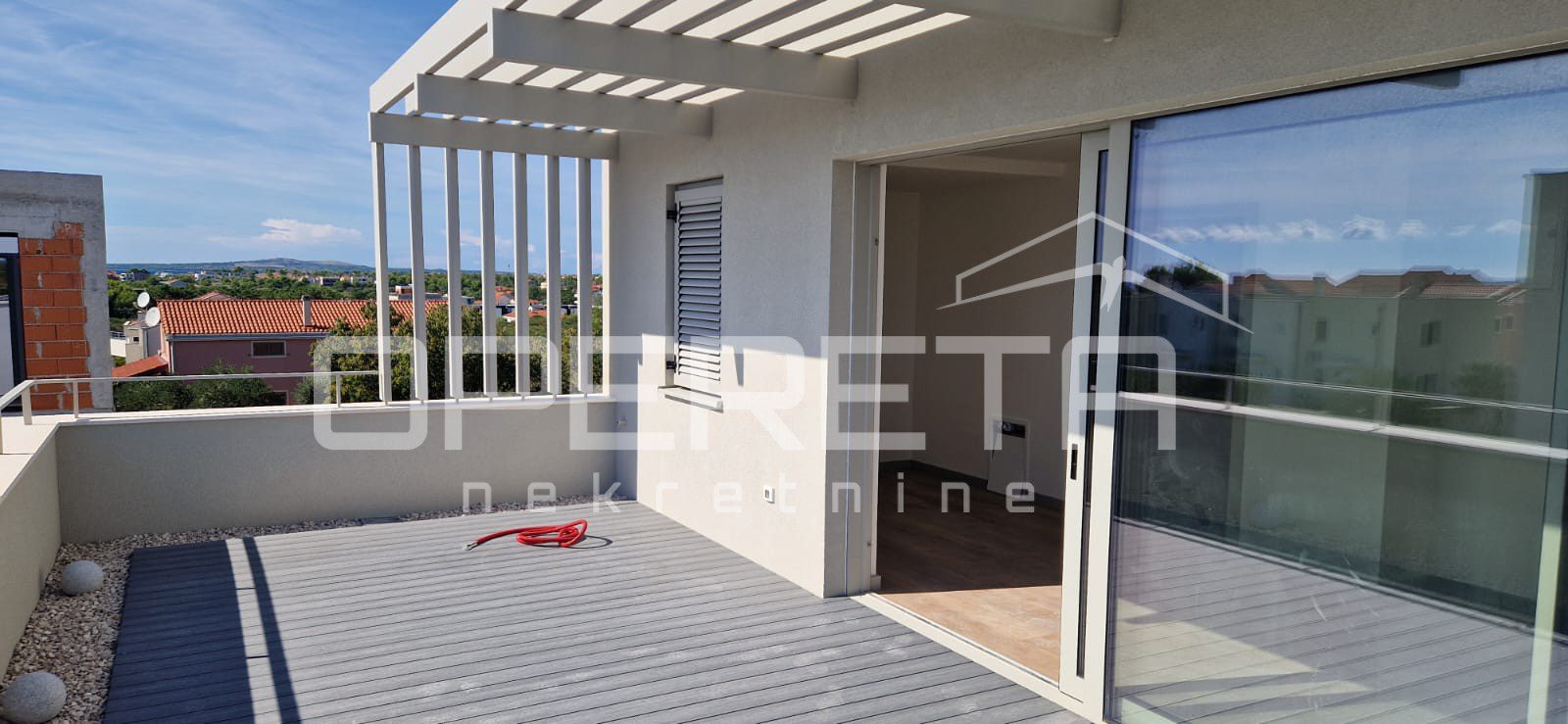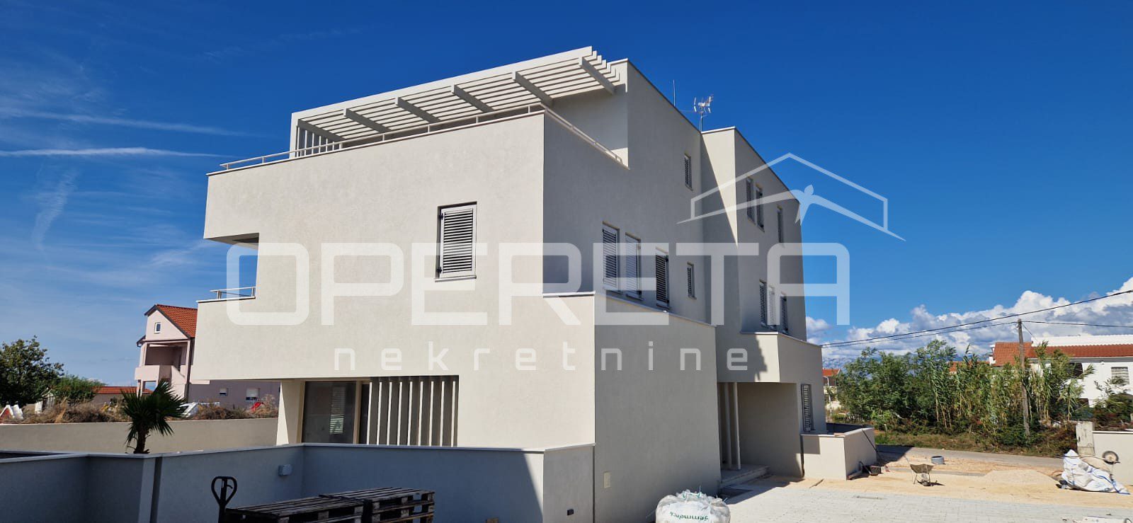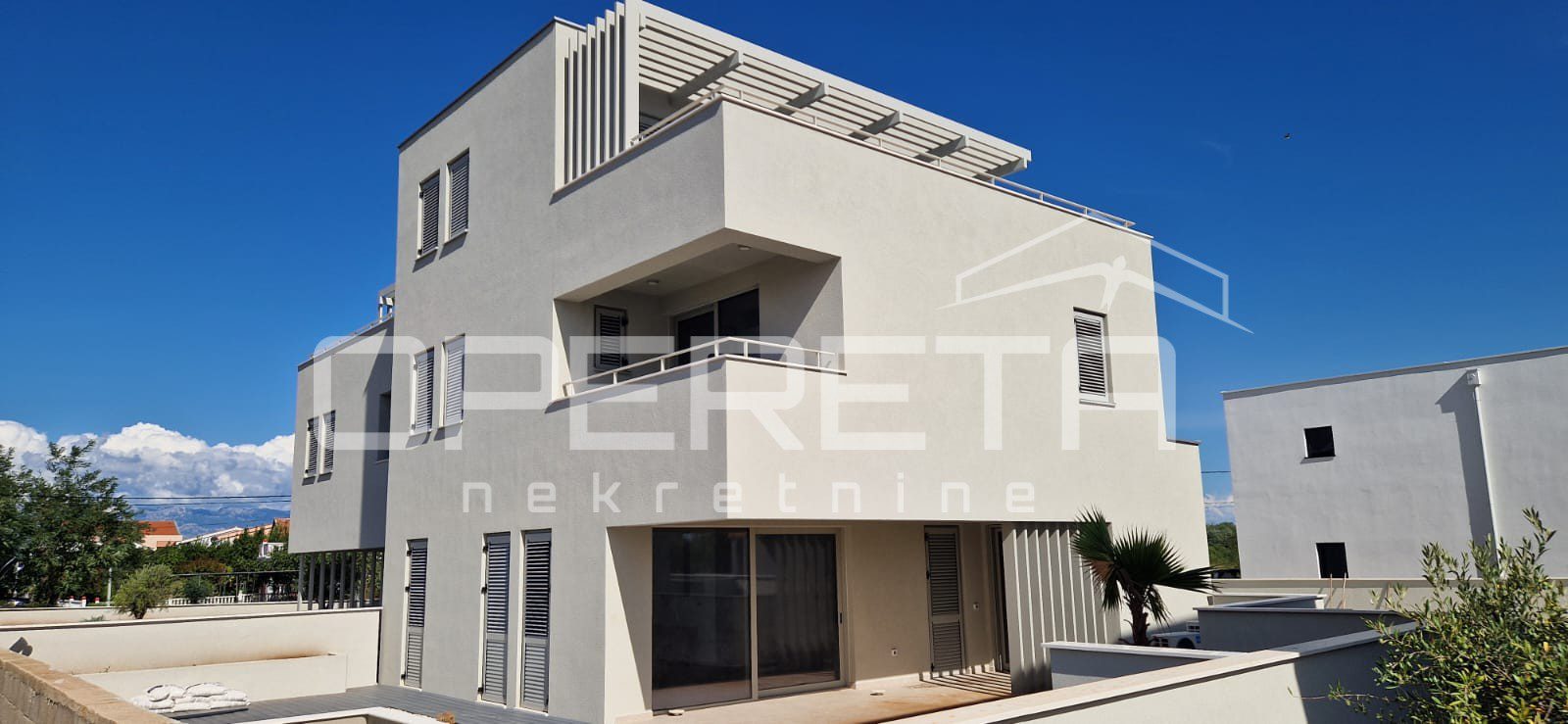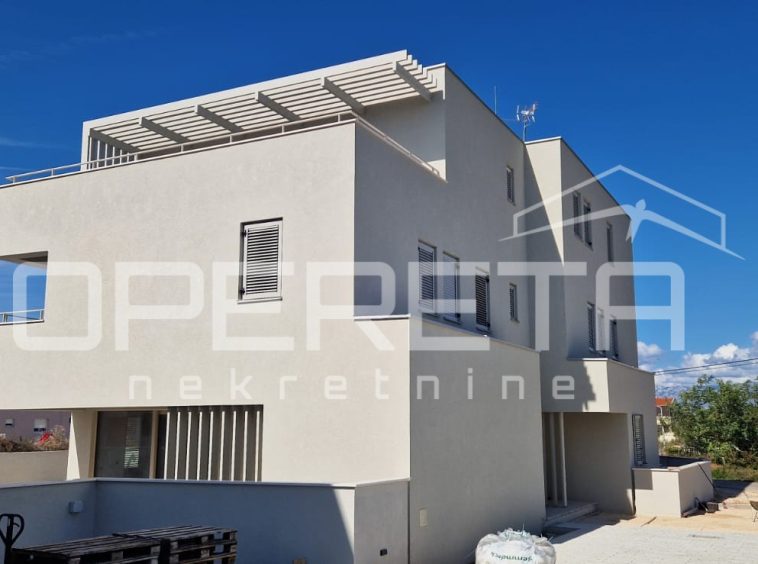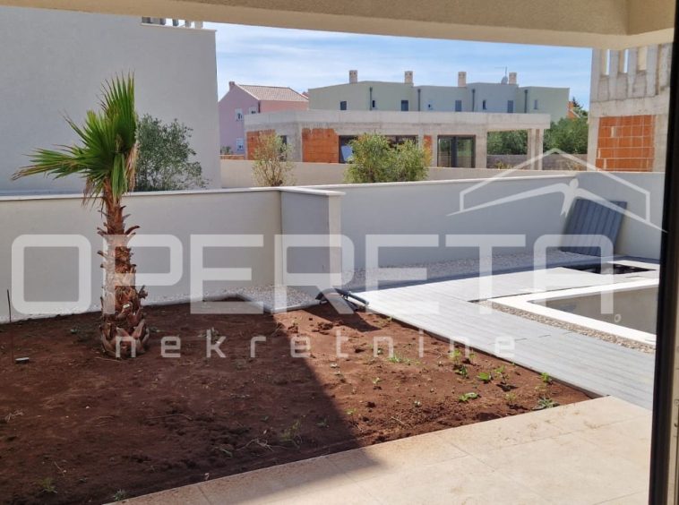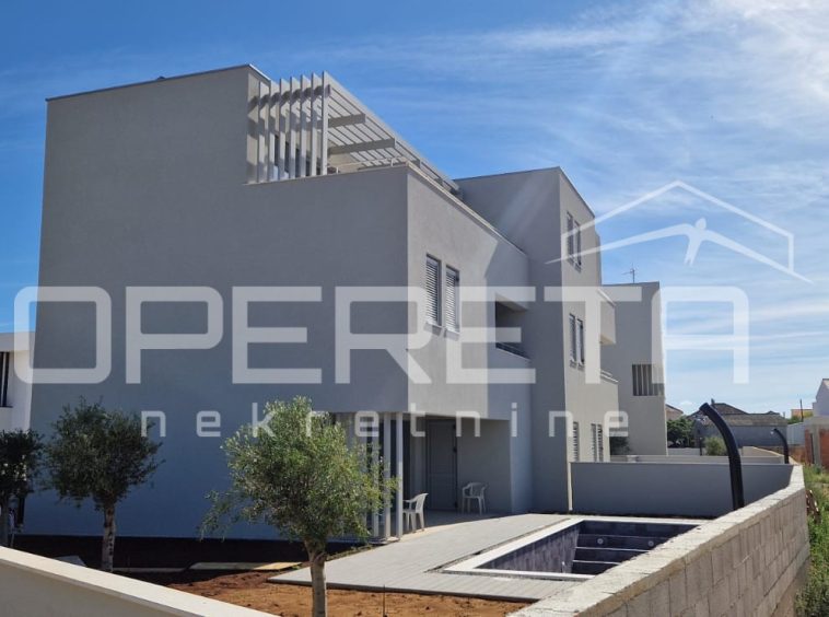 In the Mletak area, near Privlaka, a newly built luxury semi-detached house with a pool is for sale. The property is located in a quiet and secluded part of the settlement, close to several sandy beaches for which Mletak is known, just 500 m from the sea.
