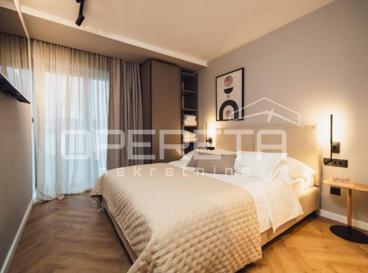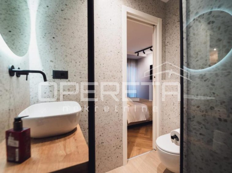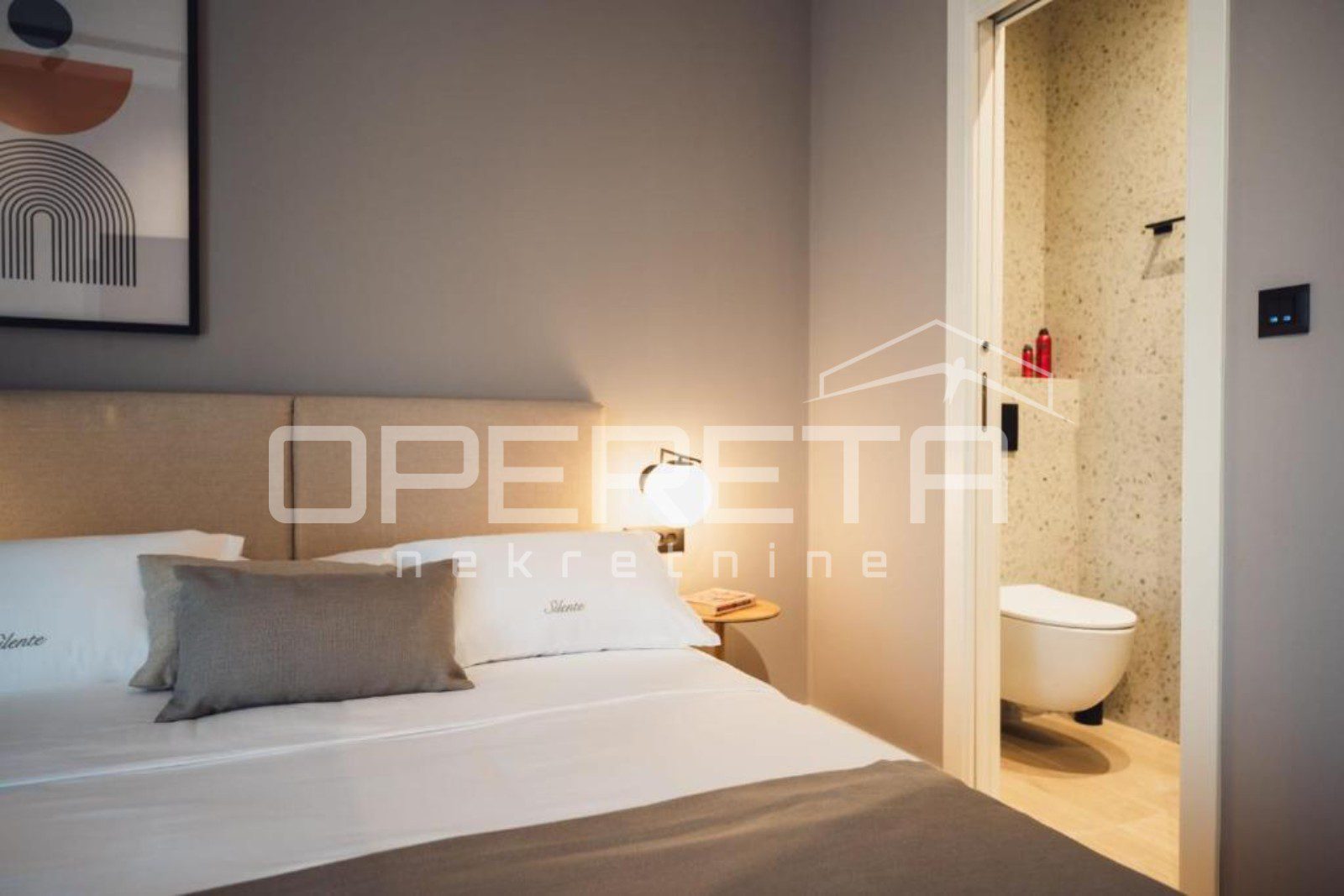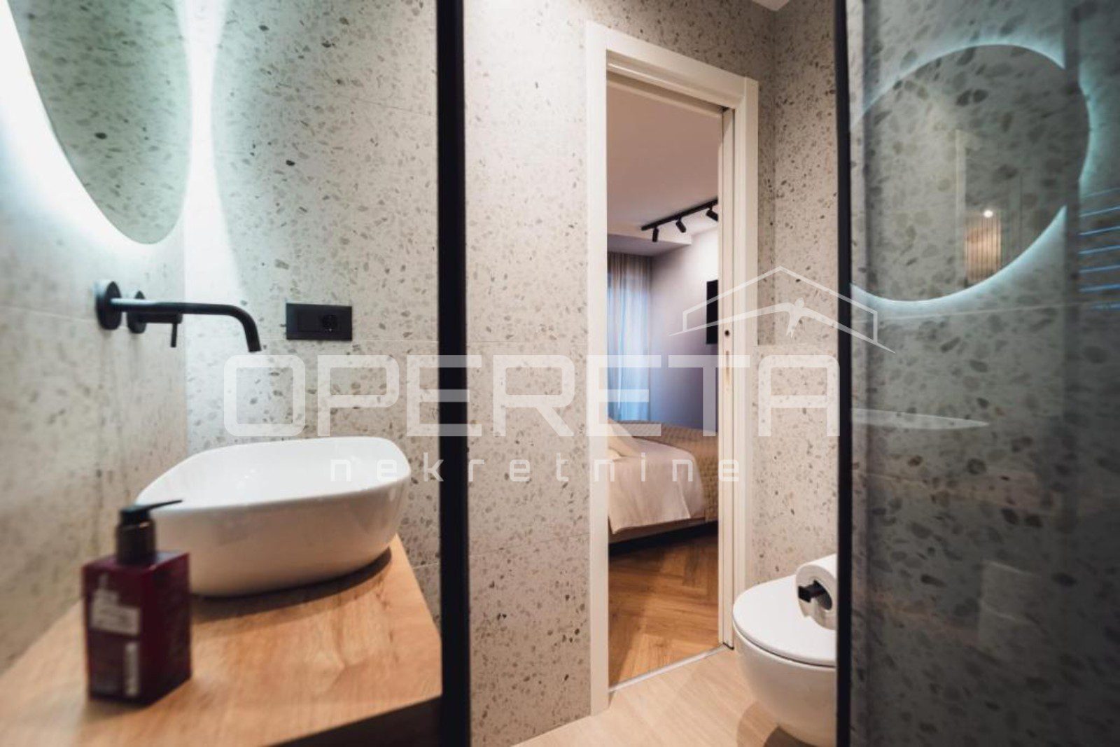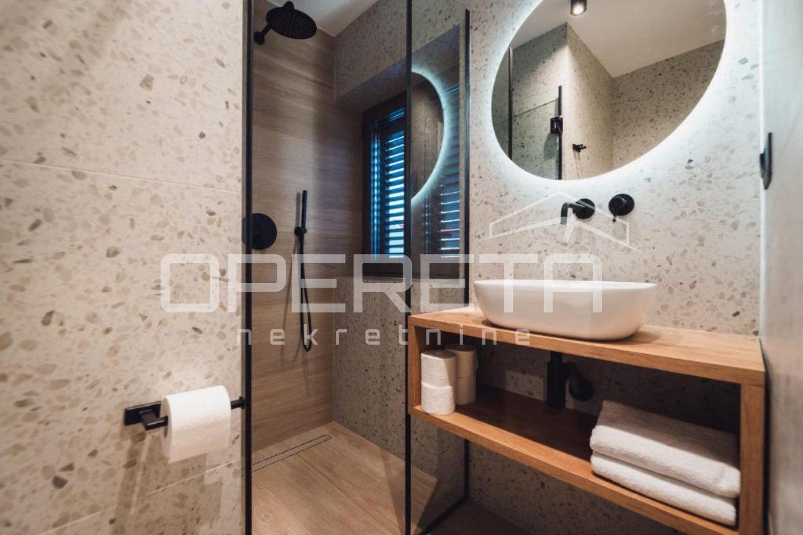 On the ground floor there is a spacious apartment of about 70 m². The open plan kitchen, dining and living area creates a bright and welcoming space that extends onto a covered terrace, perfect for morning coffee or evening gatherings. The apartment features two bedrooms, each with its own bathroom, ensuring complete comfort and privacy.