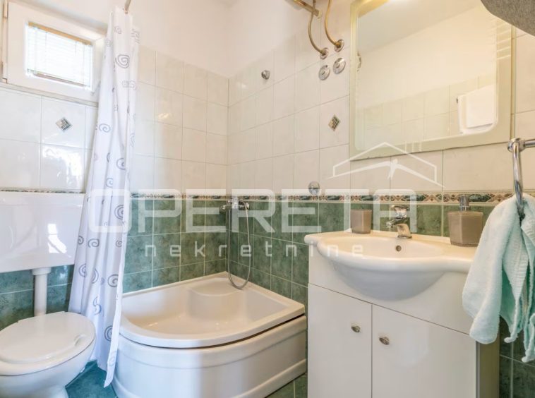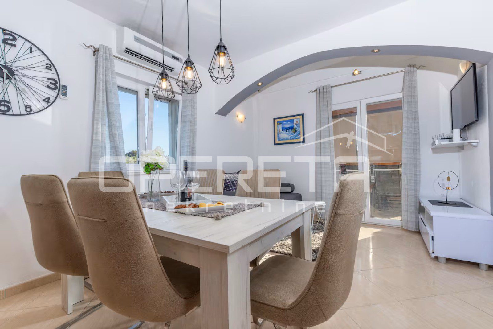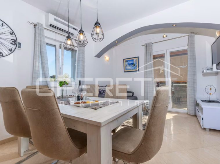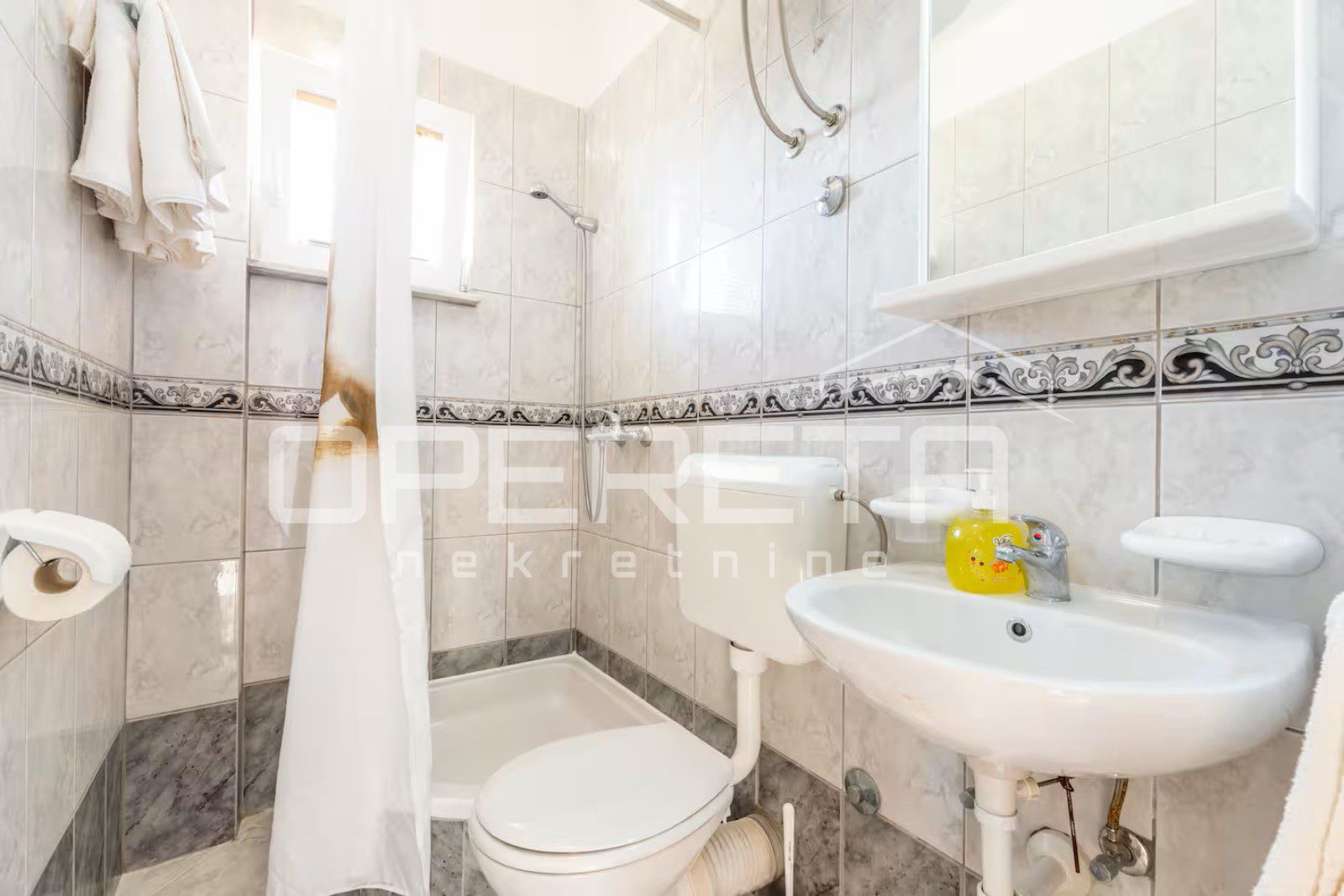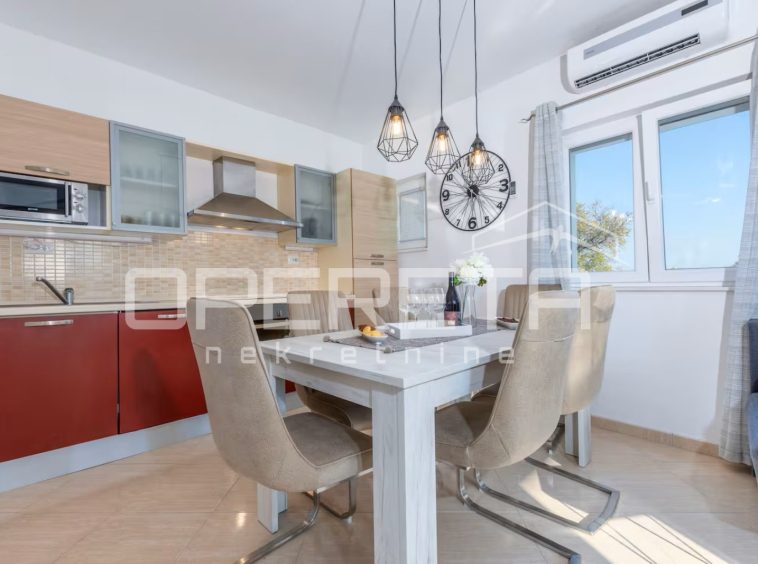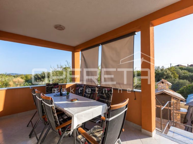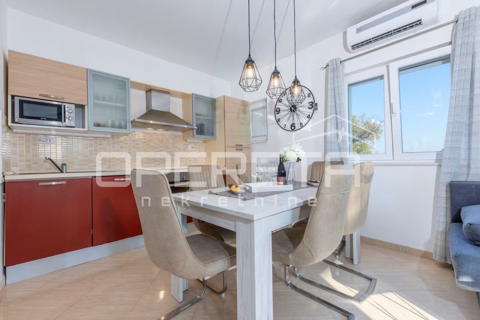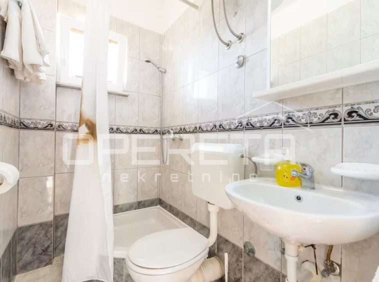 External stairs lead to the first floor, where there is a spacious apartment with two bedrooms, one of which has a private bathroom, an additional separate bathroom, and a comfortable living area connected to the kitchen and dining room. The living room opens onto a large covered terrace, ideal for relaxation and enjoying warm Dalmatian evenings. On the second floor, there are two additional studio apartments, each with a living area, kitchen and dining space, bathroom, and a private terrace offering a beautiful sea view.