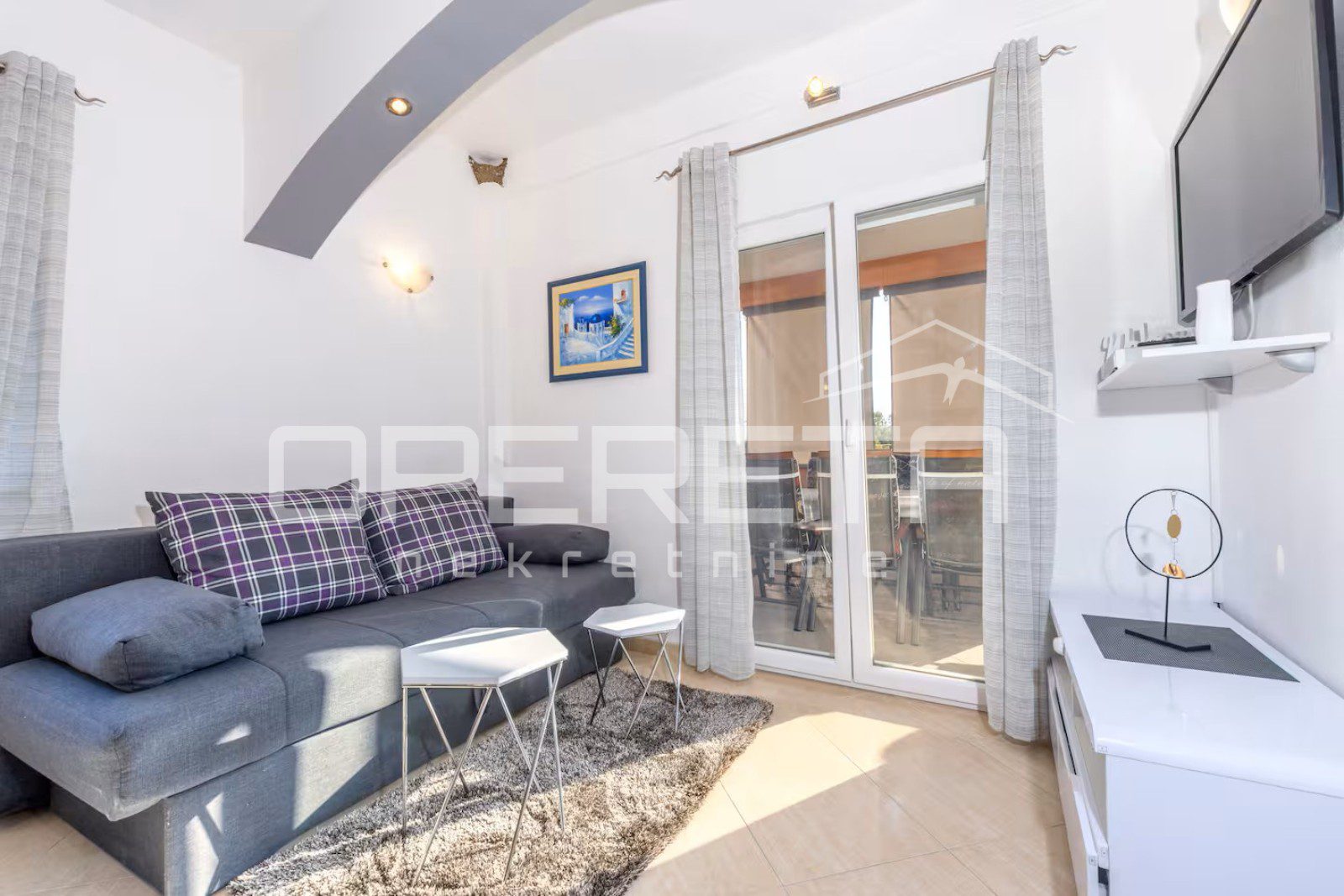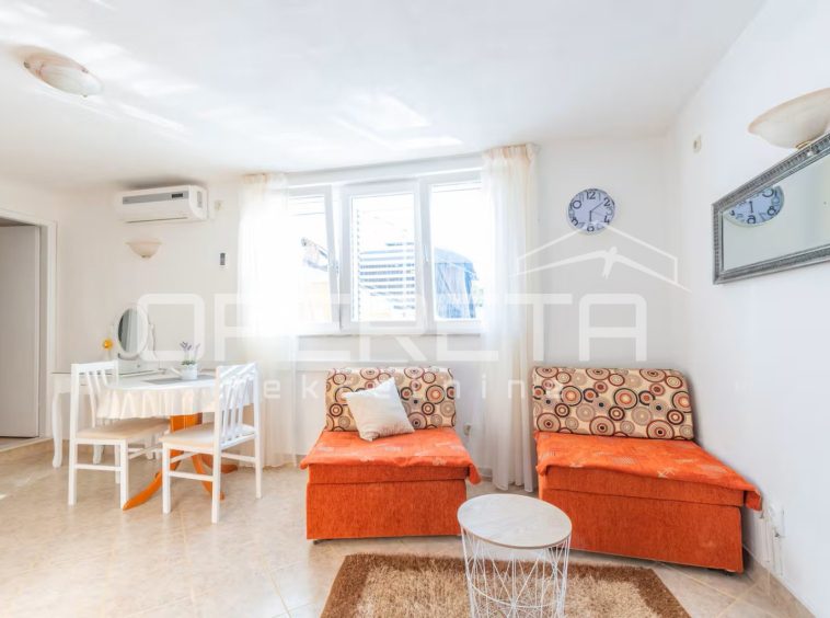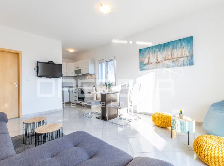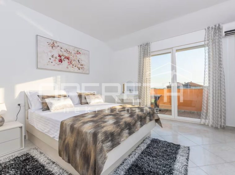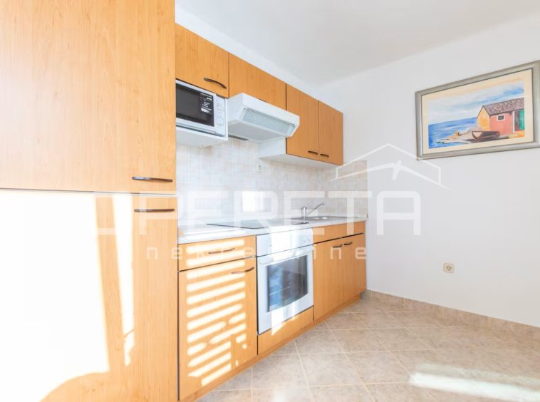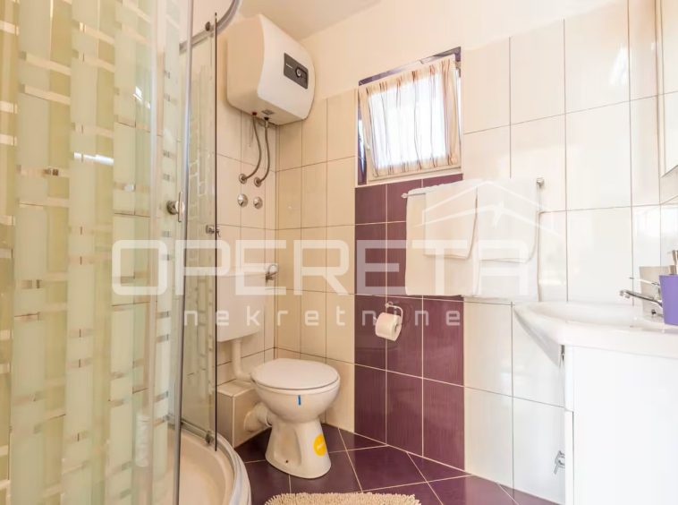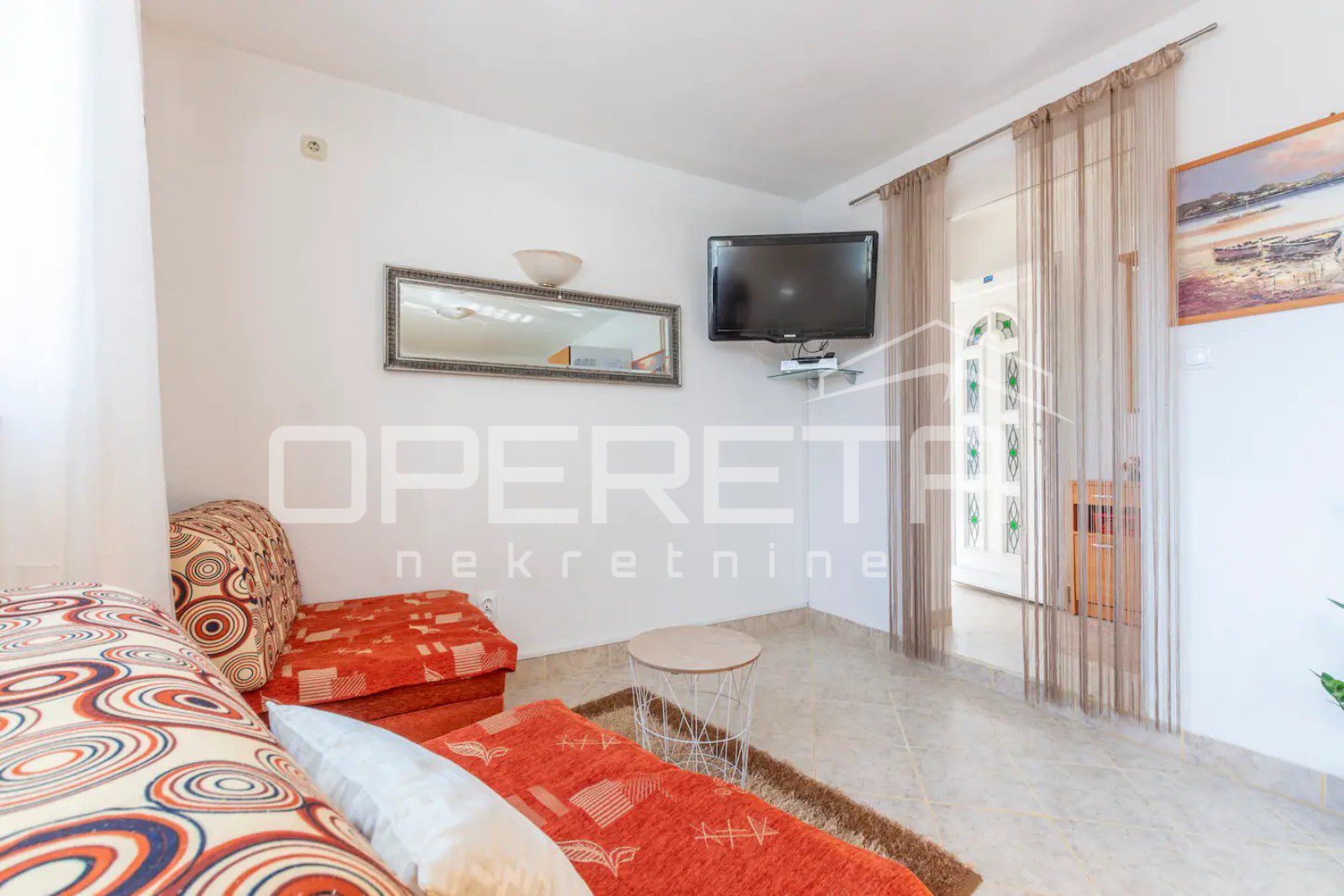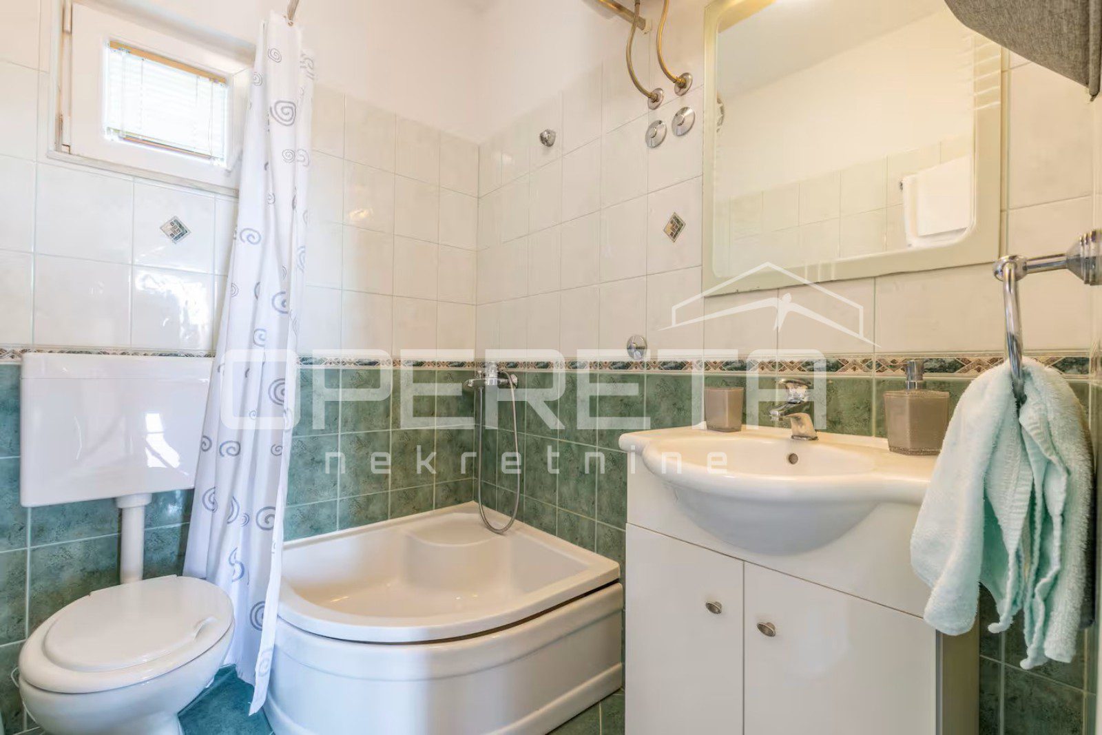 External stairs lead to the first floor, where there is a spacious apartment with two bedrooms, one of which has a private bathroom, an additional separate bathroom, and a comfortable living area connected to the kitchen and dining room. The living room opens onto a large covered terrace, ideal for relaxation and enjoying warm Dalmatian evenings. On the second floor, there are two additional studio apartments, each with a living area, kitchen and dining space, bathroom, and a private terrace offering a beautiful sea view.