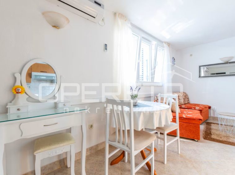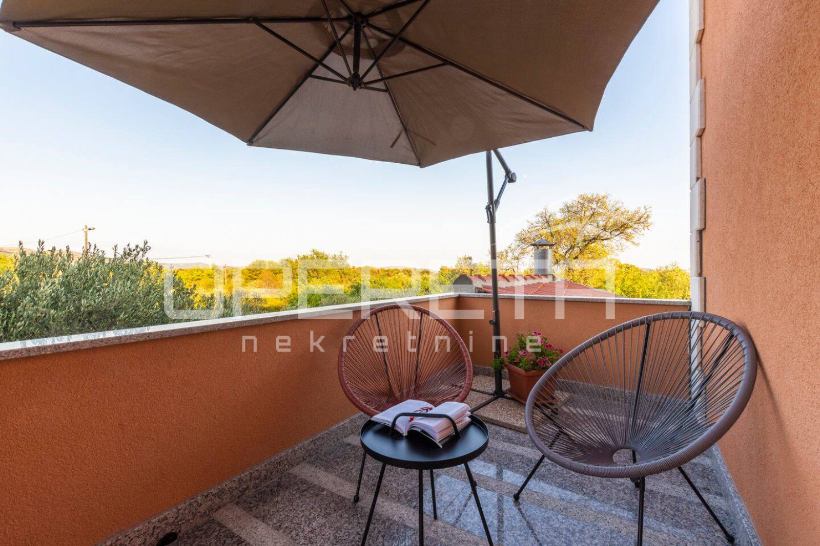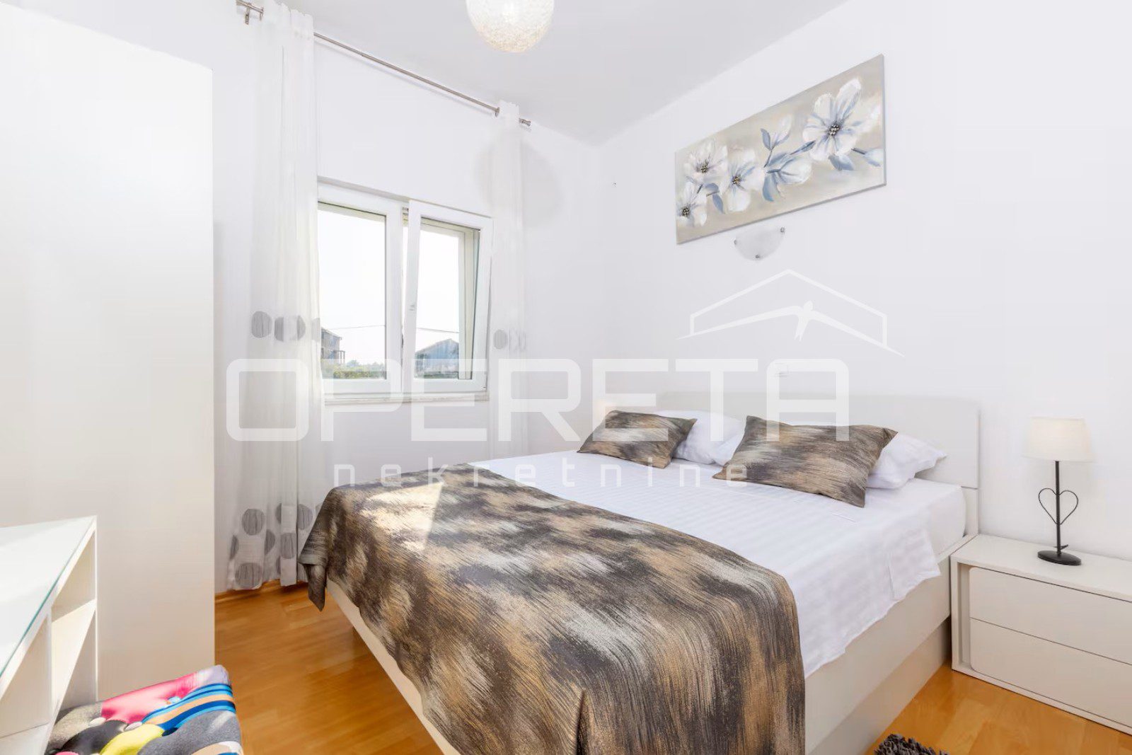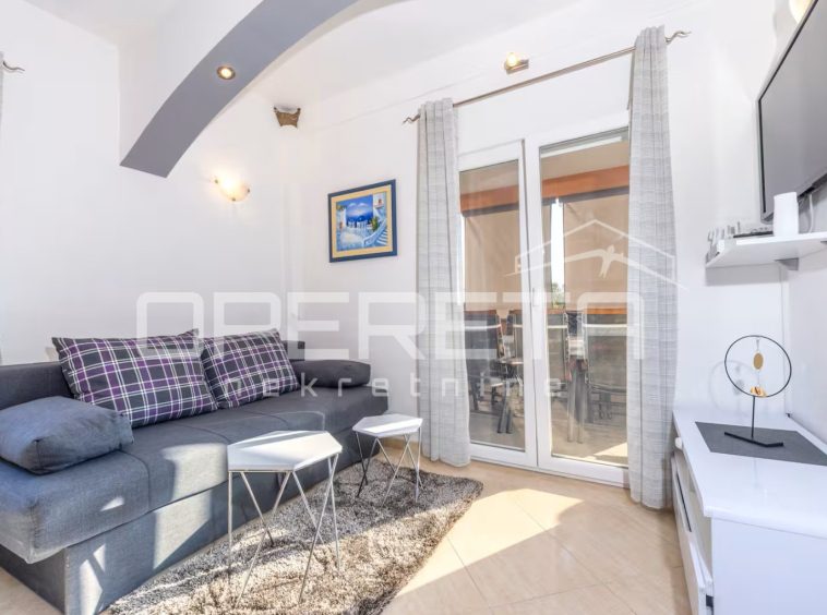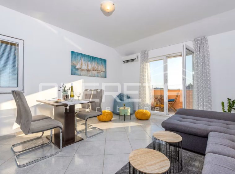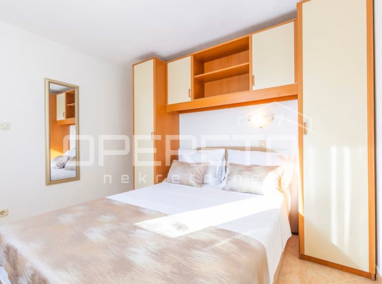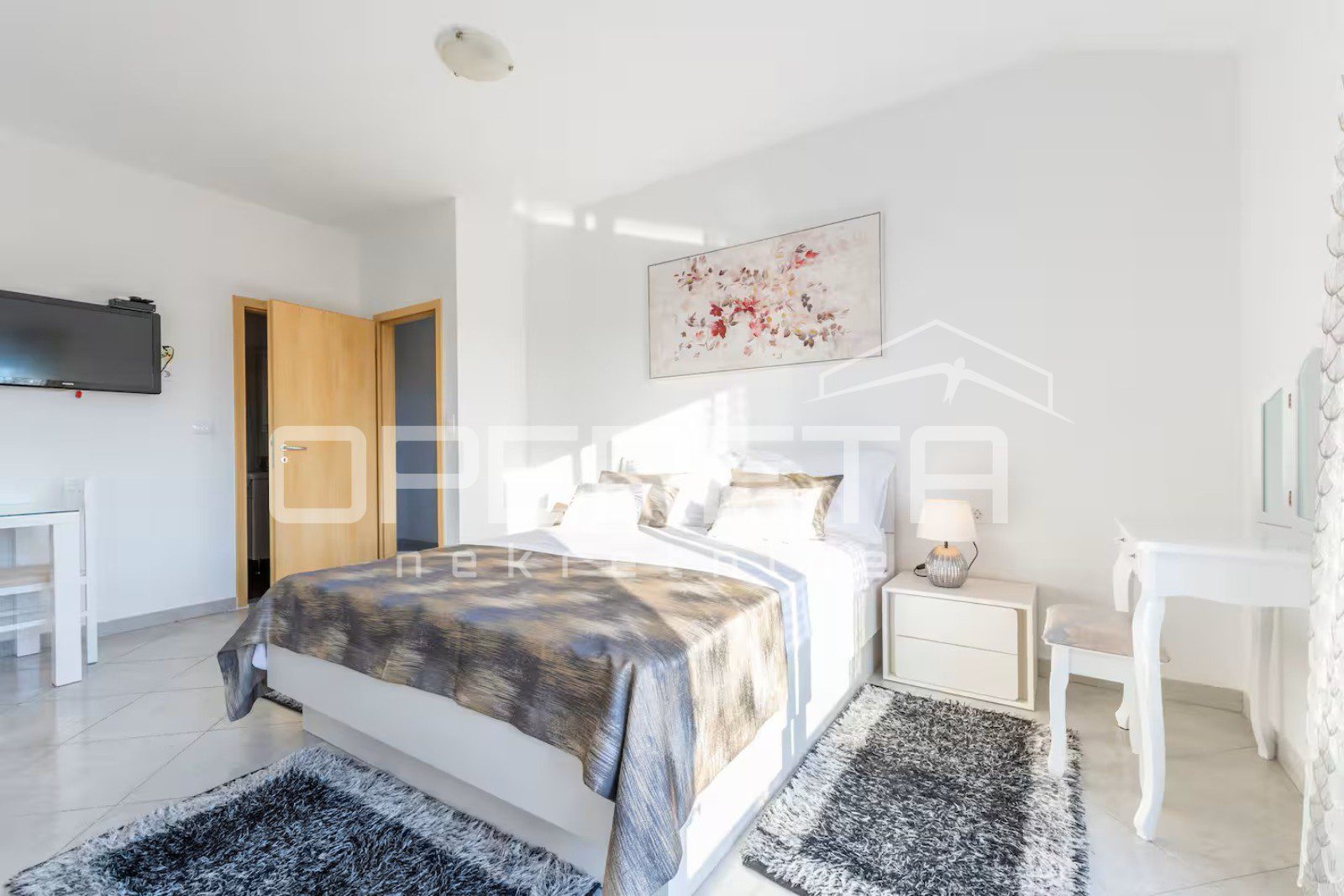 External stairs lead to the first floor, where there is a spacious apartment with two bedrooms, one of which has a private bathroom, an additional separate bathroom, and a comfortable living area connected to the kitchen and dining room. The living room opens onto a large covered terrace, ideal for relaxation and enjoying warm Dalmatian evenings. On the second floor, there are two additional studio apartments, each with a living area, kitchen and dining space, bathroom, and a private terrace offering a beautiful sea view.