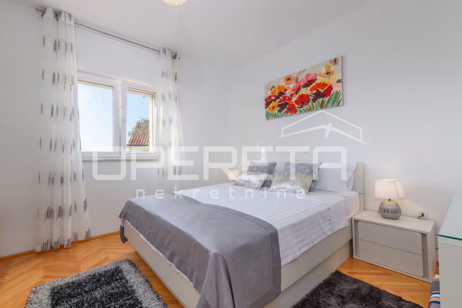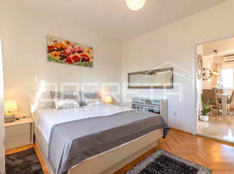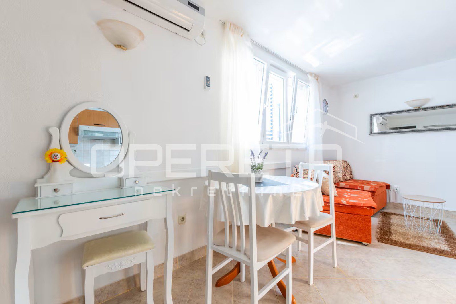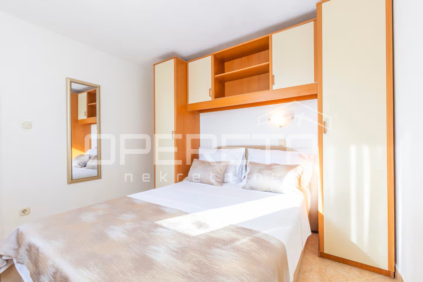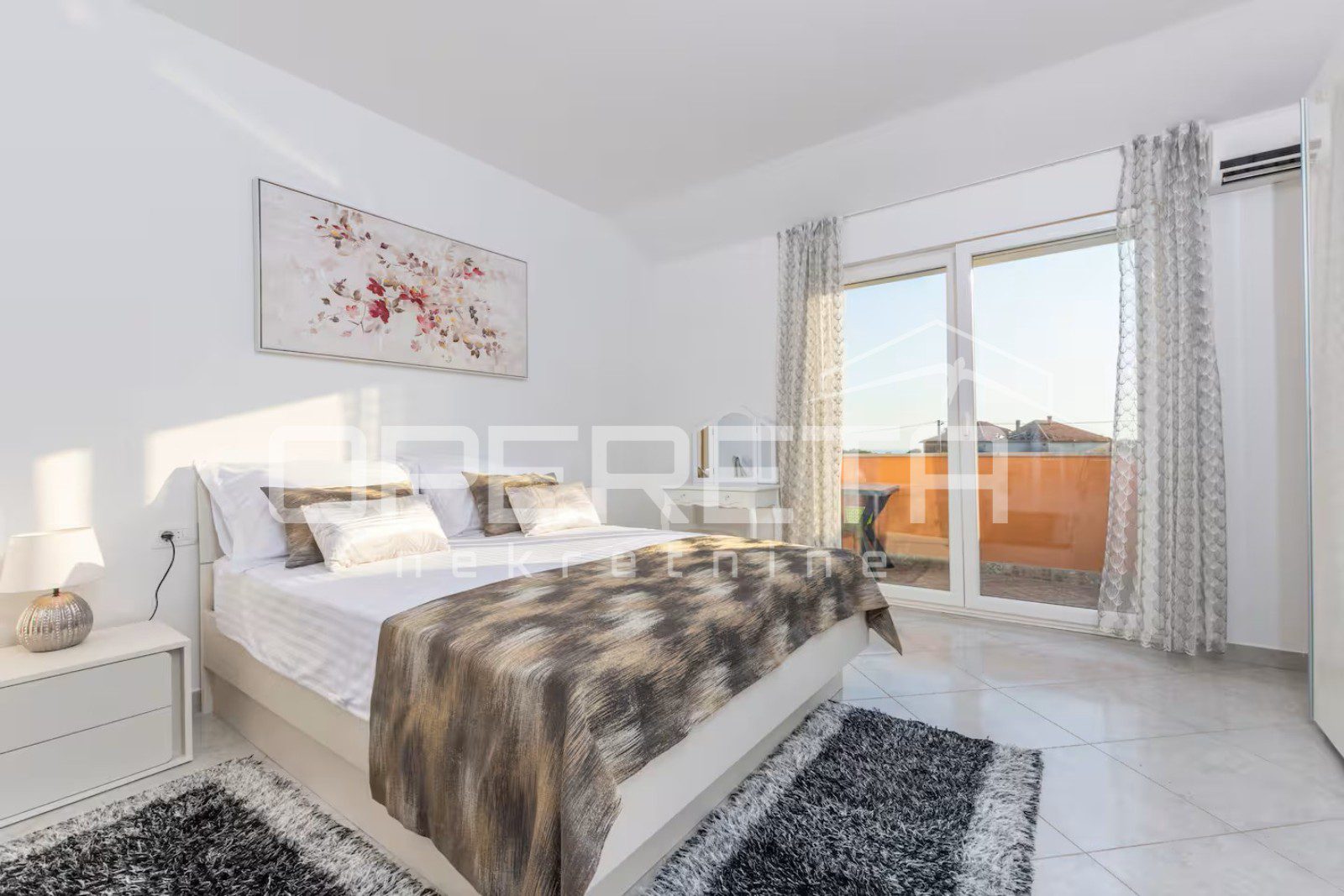 External stairs lead to the first floor, where there is a spacious apartment with two bedrooms, one of which has a private bathroom, an additional separate bathroom, and a comfortable living area connected to the kitchen and dining room. The living room opens onto a large covered terrace, ideal for relaxation and enjoying warm Dalmatian evenings. On the second floor, there are two additional studio apartments, each with a living area, kitchen and dining space, bathroom, and a private terrace offering a beautiful sea view.