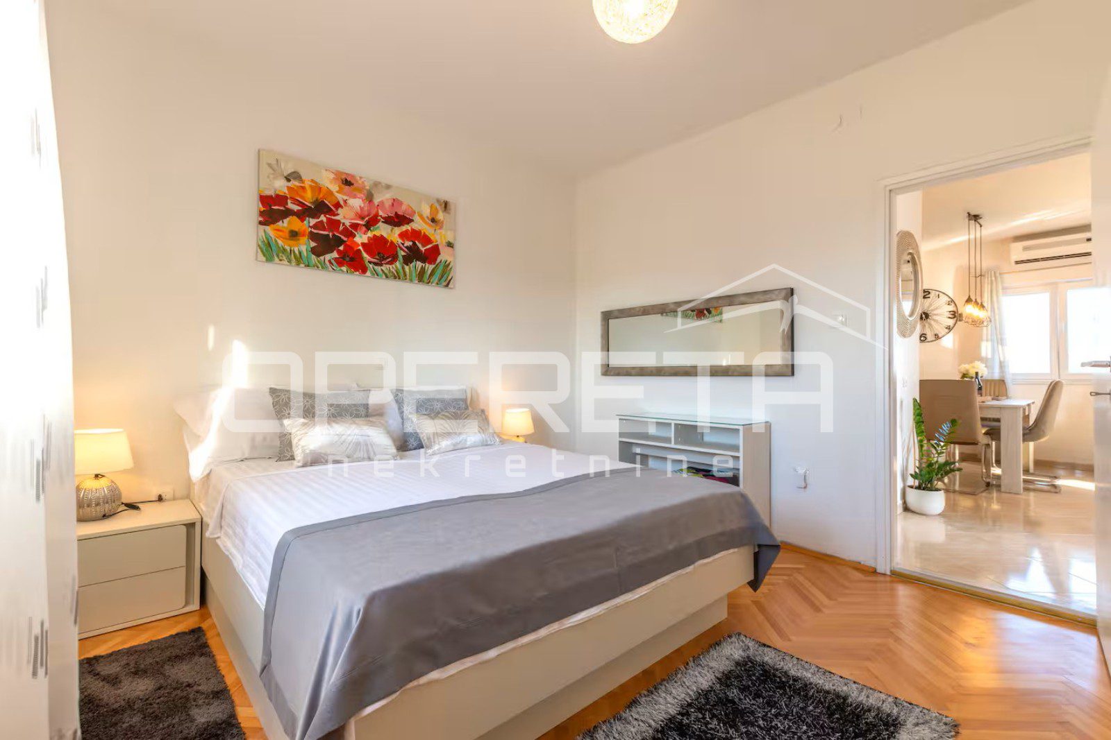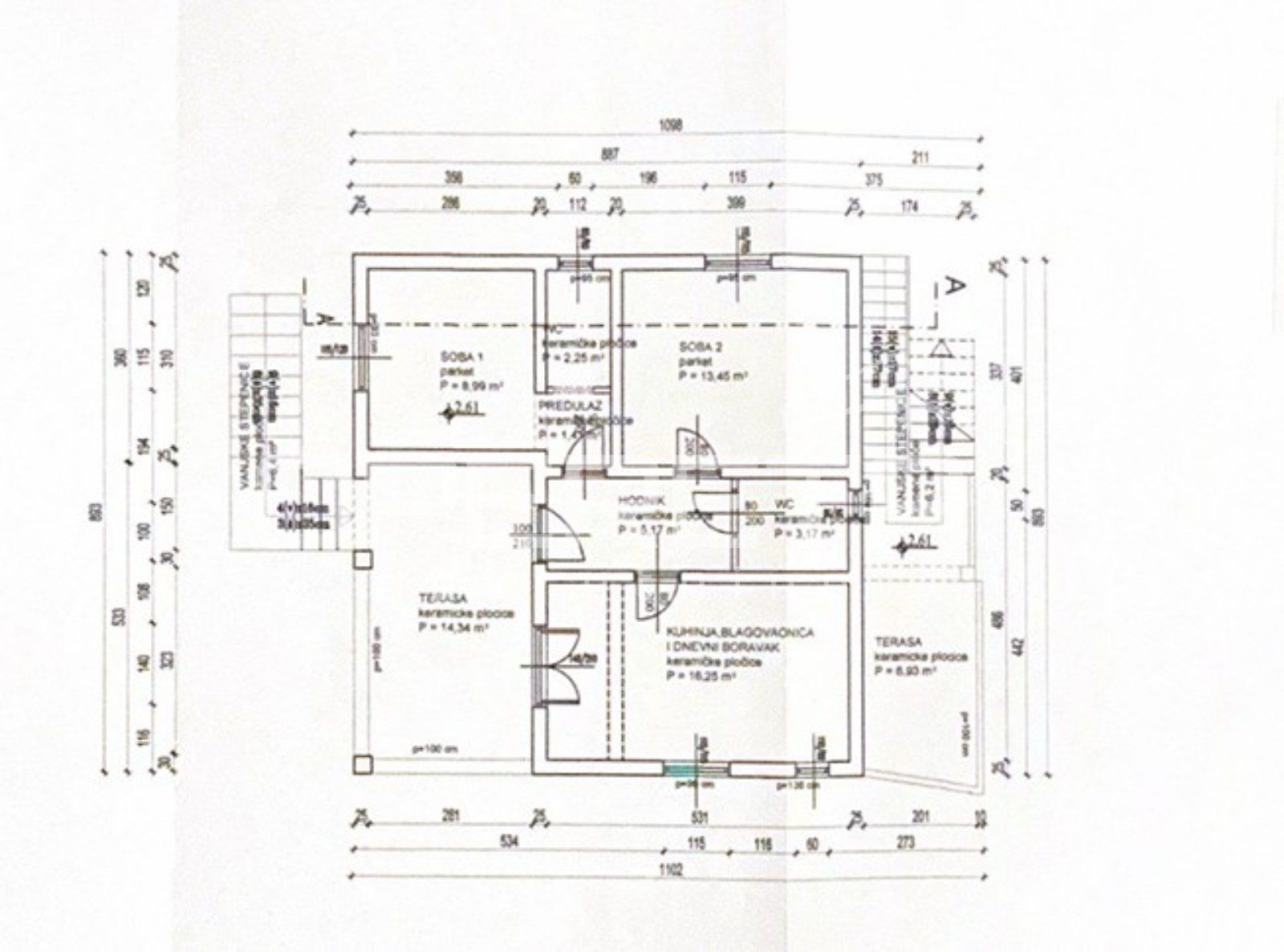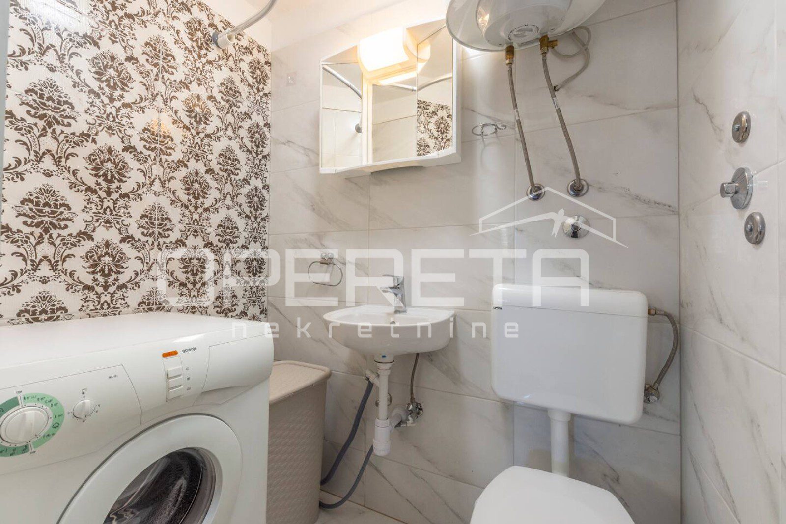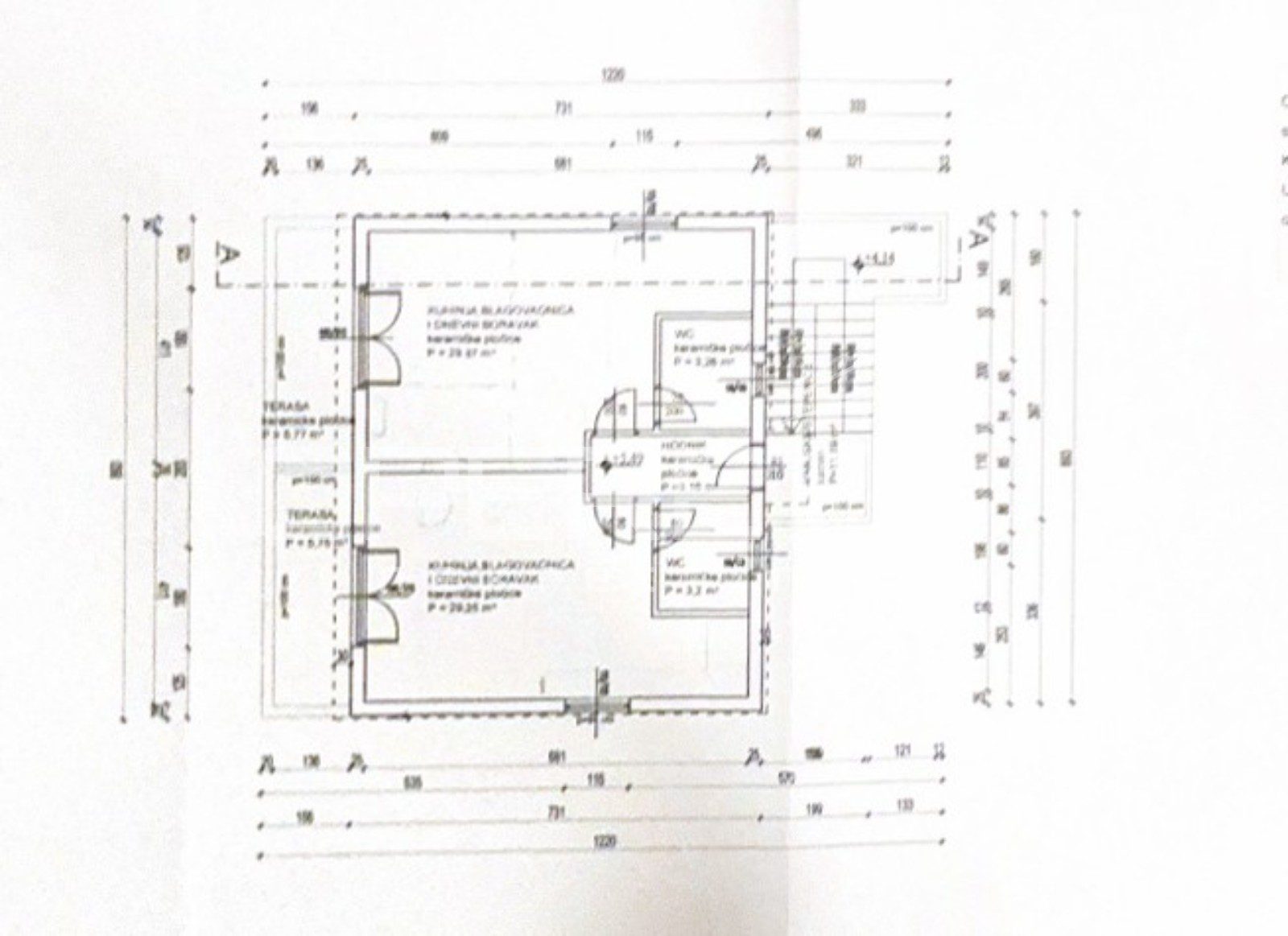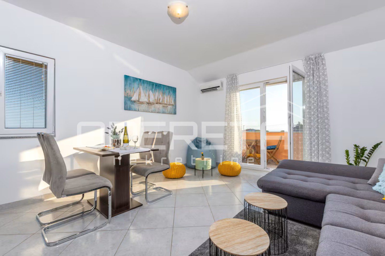 External stairs lead to the first floor, where there is a spacious apartment with two bedrooms, one of which has a private bathroom, an additional separate bathroom, and a comfortable living area connected to the kitchen and dining room. The living room opens onto a large covered terrace, ideal for relaxation and enjoying warm Dalmatian evenings. On the second floor, there are two additional studio apartments, each with a living area, kitchen and dining space, bathroom, and a private terrace offering a beautiful sea view.