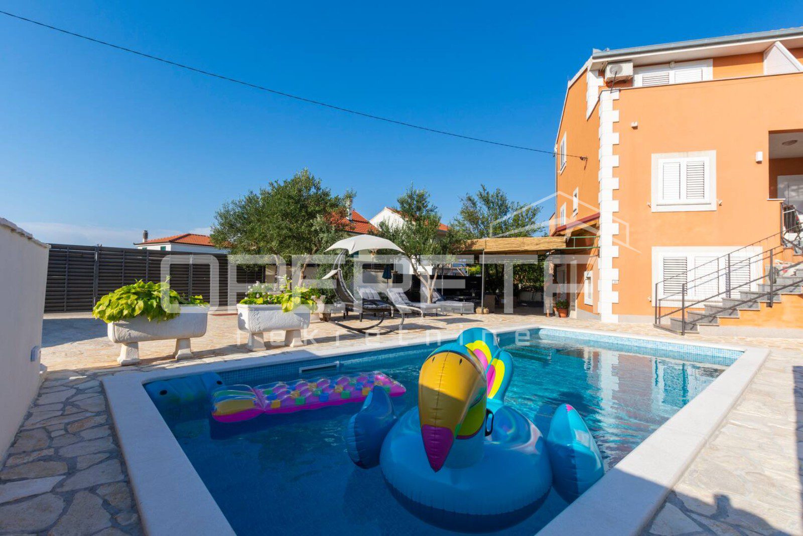 The outdoor area features a landscaped garden, a spacious swimming pool, and a sunbathing area, creating an authentic Mediterranean atmosphere and added luxury. The house includes a total of six parking spaces. The microlocation is highly favorable—situated in a quiet and peaceful environment, yet only 500 meters from the sea.
