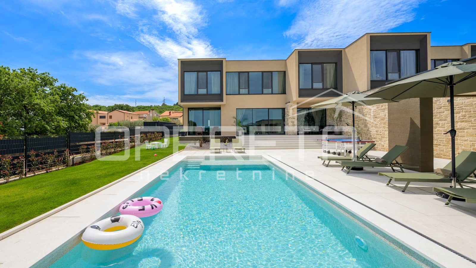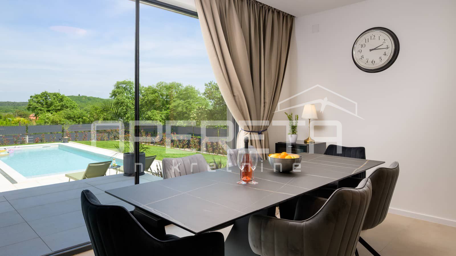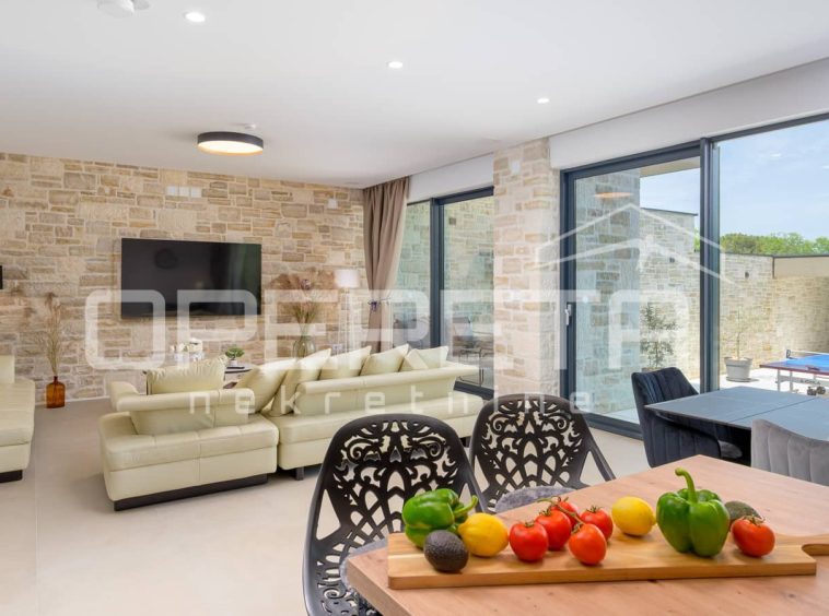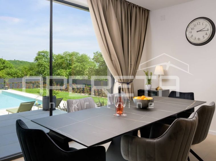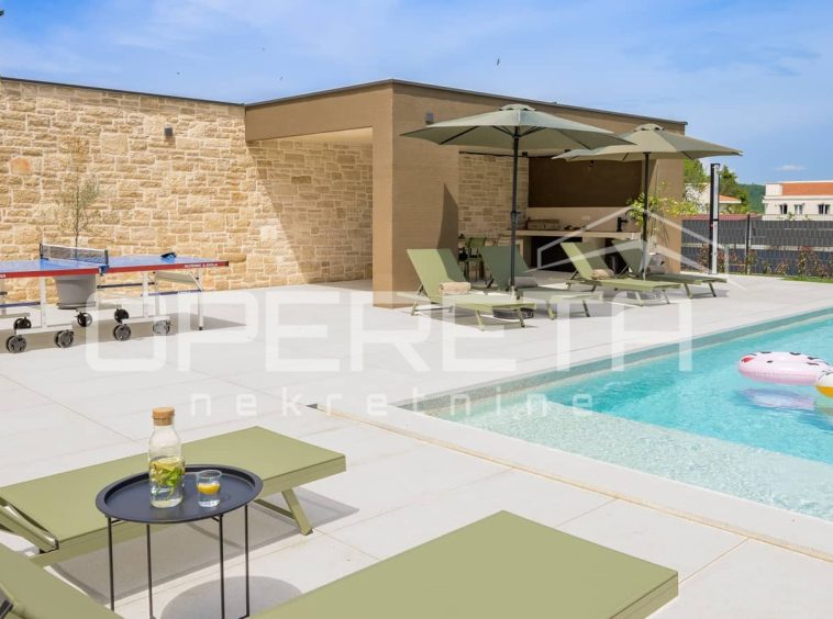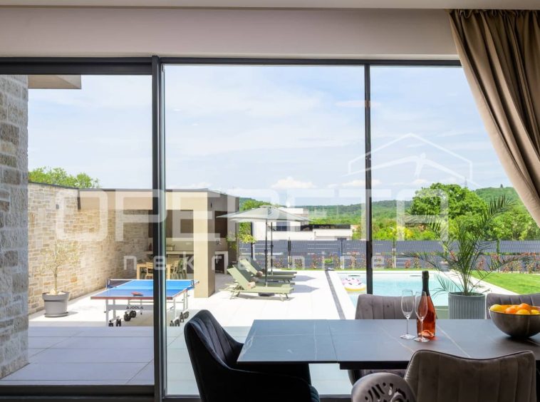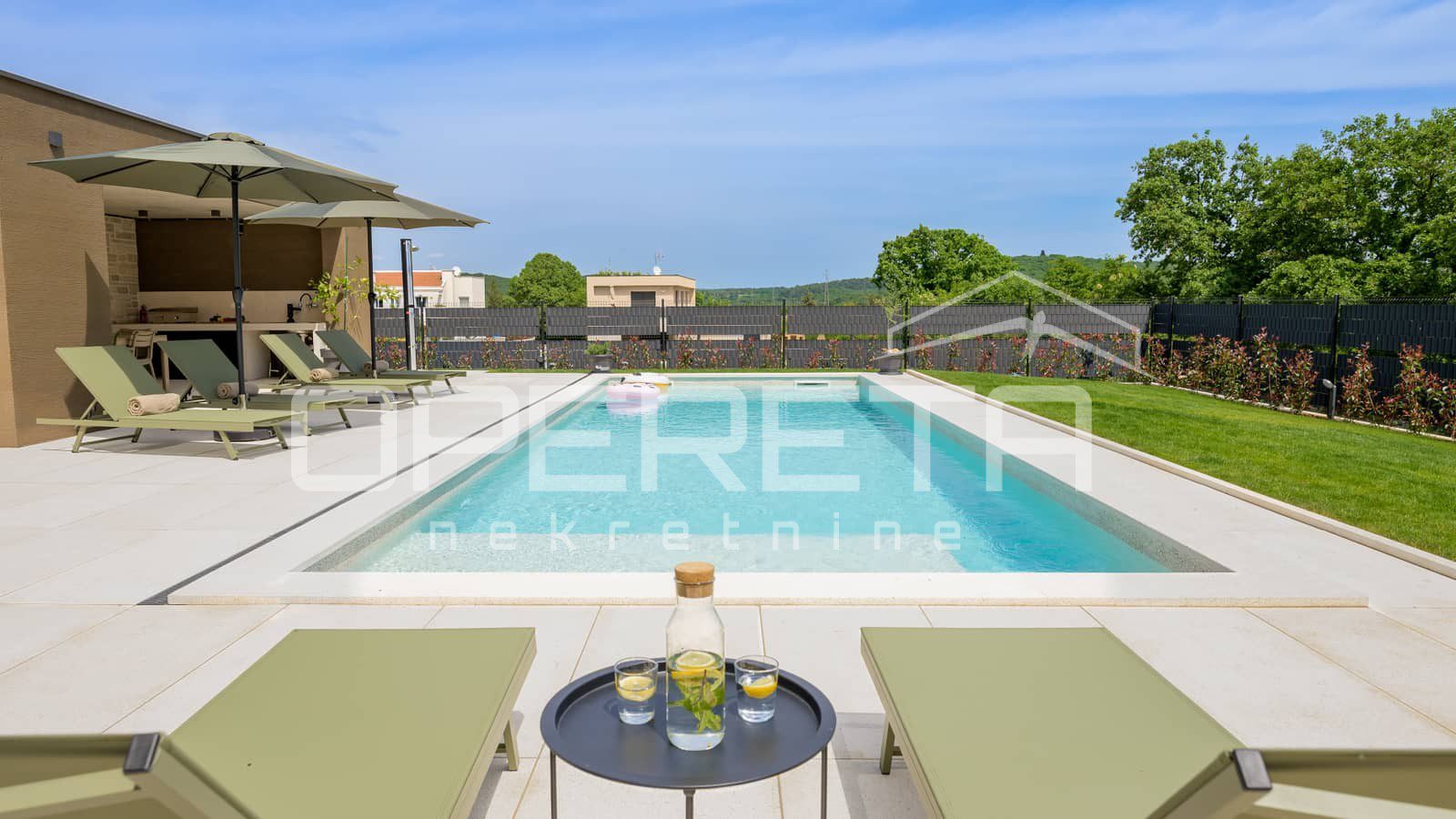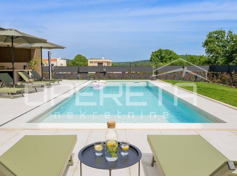 Just outside Rovinj, in the peaceful village of Rovinjsko Selo, this modern and luxuriously furnished villa is available for rent. Surrounded by an authentic Istrian setting, the villa offers tranquility, complete privacy, and a stay immersed in nature, while still being close to all essential amenities.