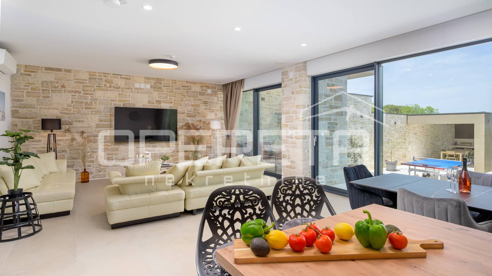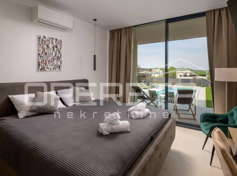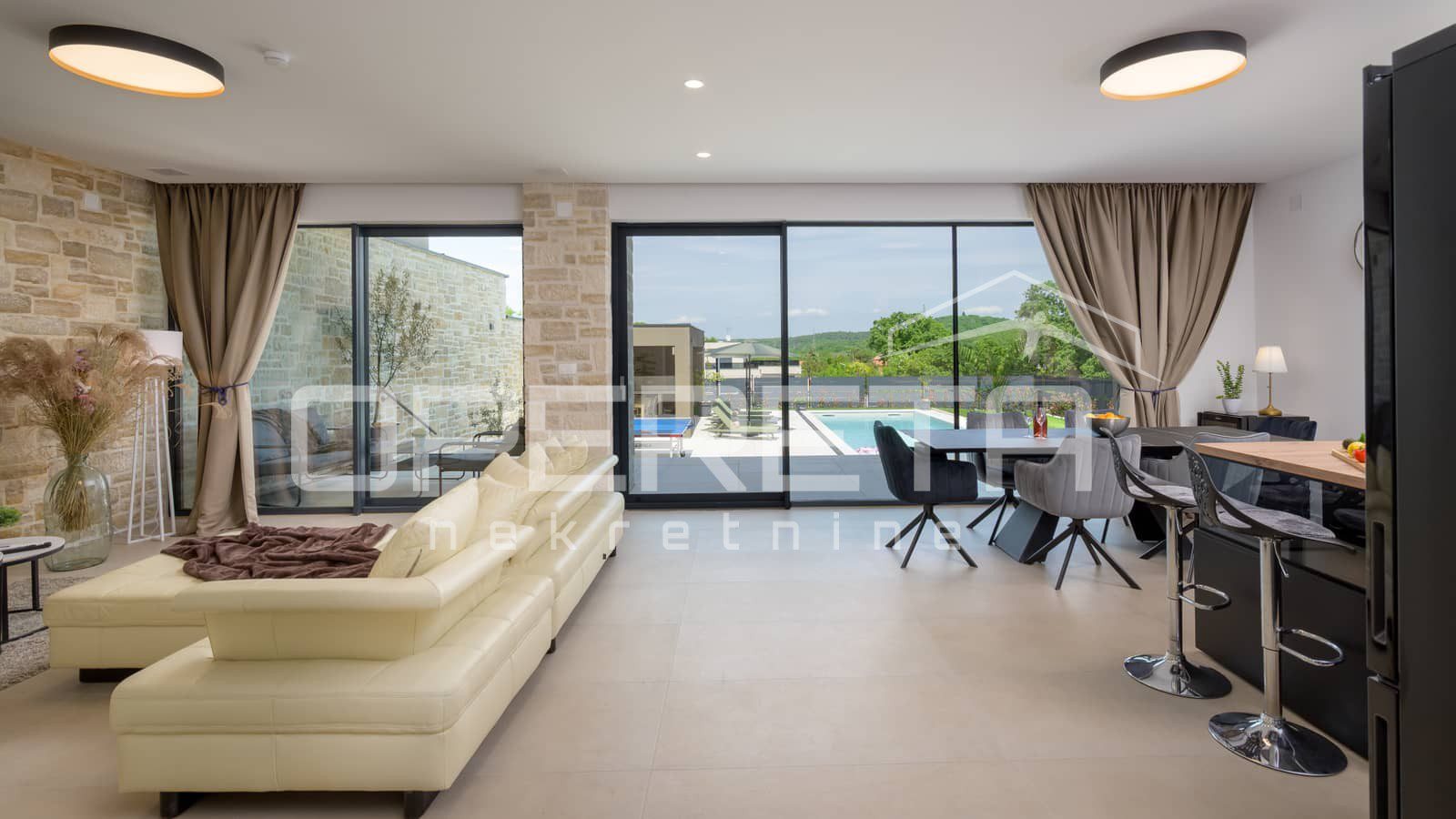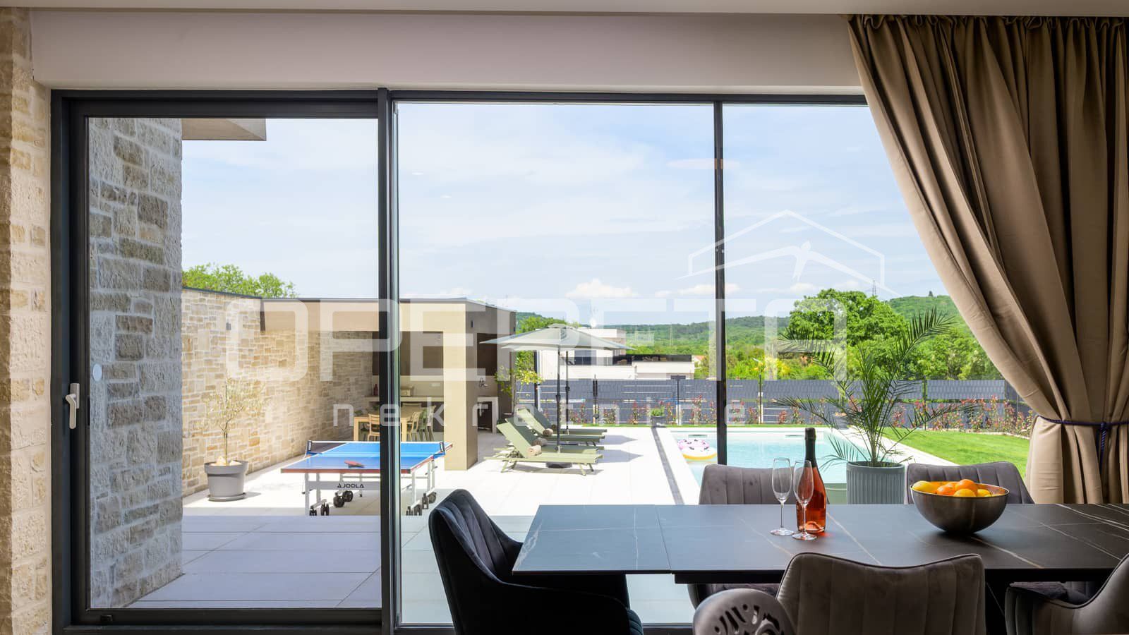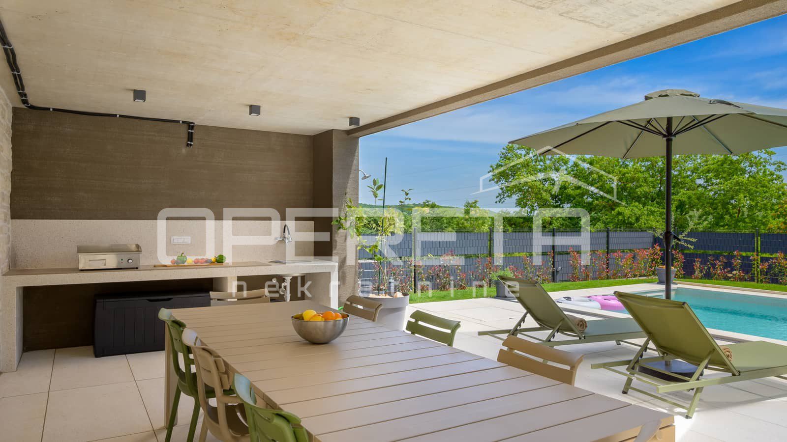 Just outside Rovinj, in the peaceful village of Rovinjsko Selo, this modern and luxuriously furnished villa is available for rent. Surrounded by an authentic Istrian setting, the villa offers tranquility, complete privacy, and a stay immersed in nature, while still being close to all essential amenities.