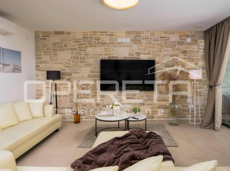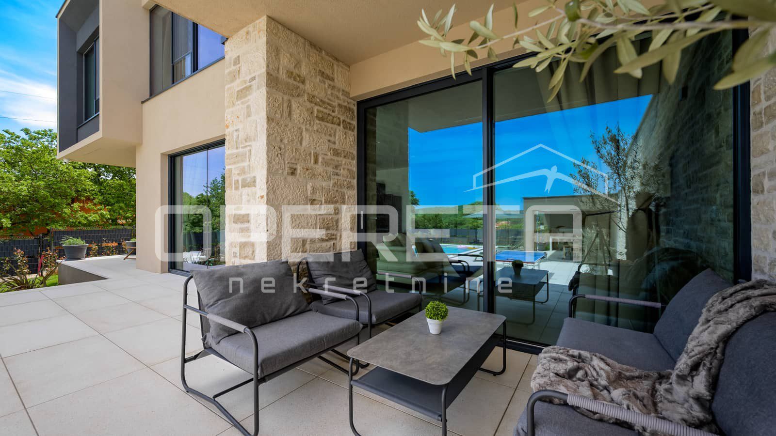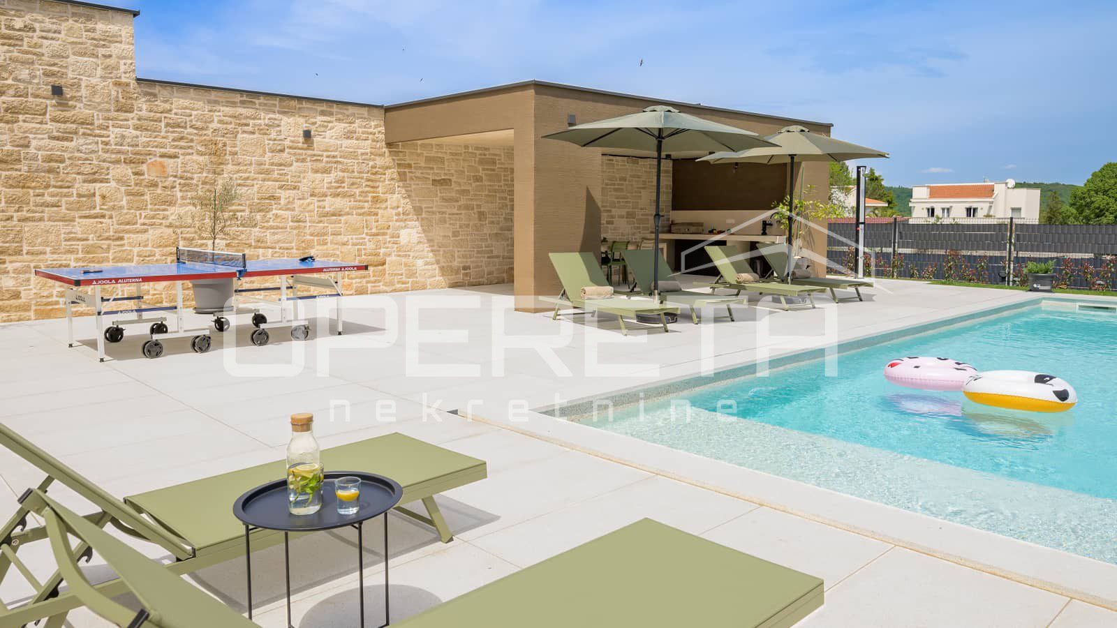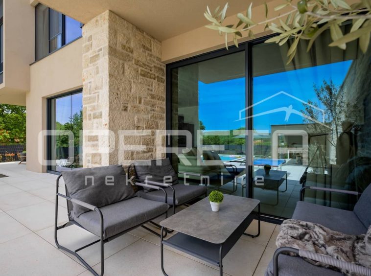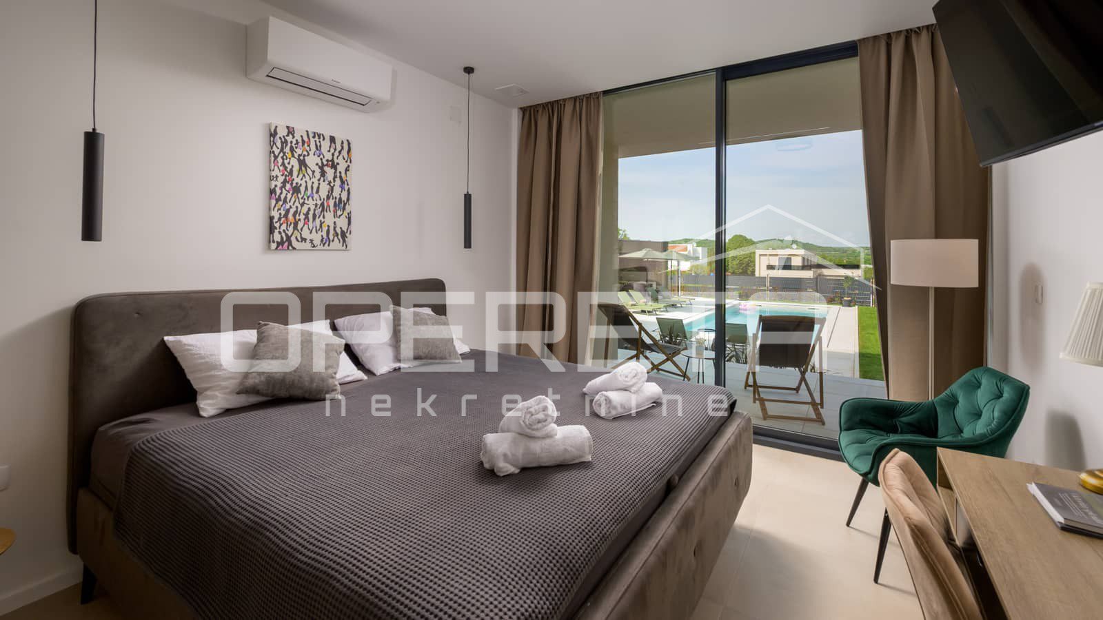 Just outside Rovinj, in the peaceful village of Rovinjsko Selo, this modern and luxuriously furnished villa is available for rent. Surrounded by an authentic Istrian setting, the villa offers tranquility, complete privacy, and a stay immersed in nature, while still being close to all essential amenities.