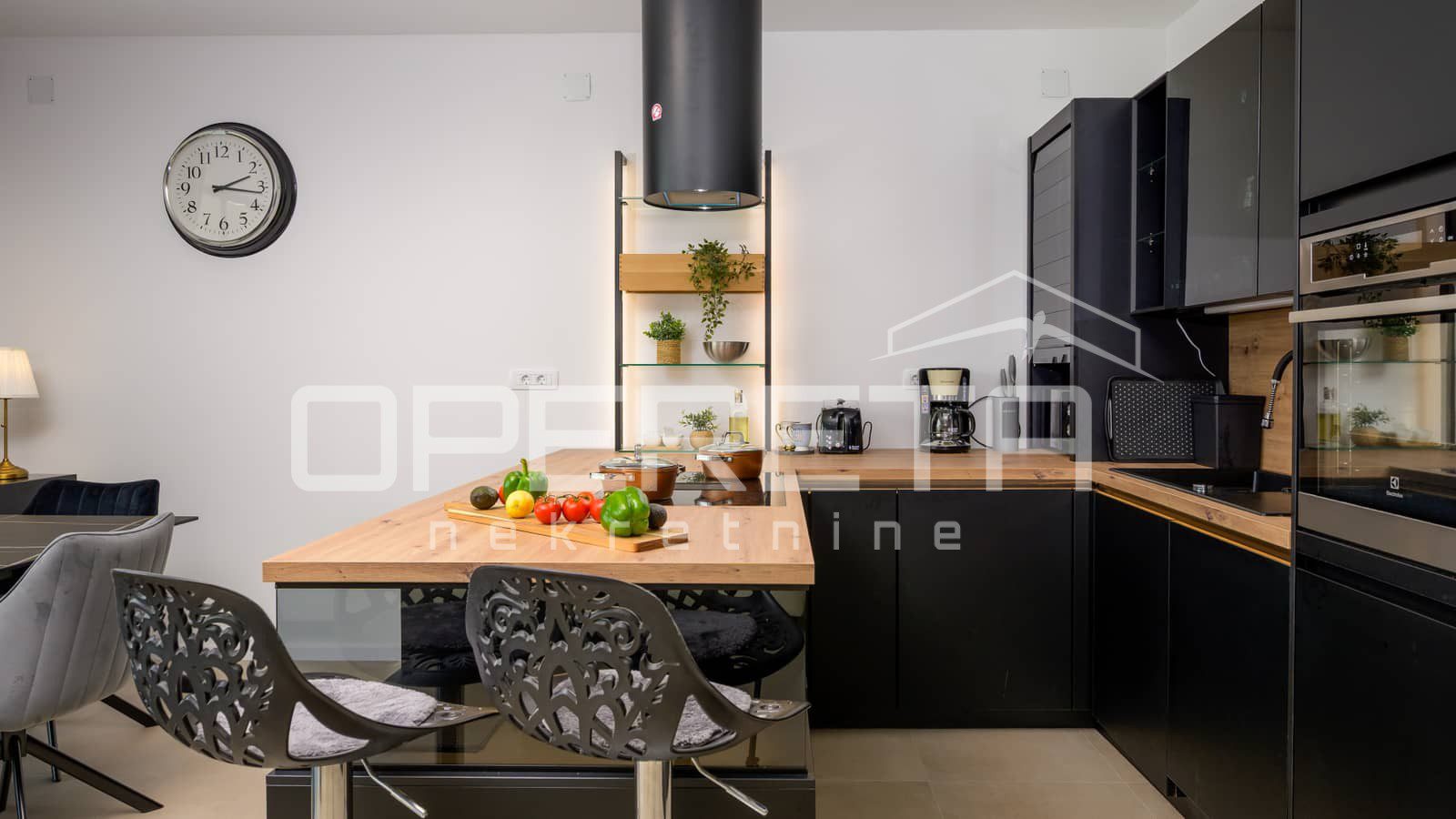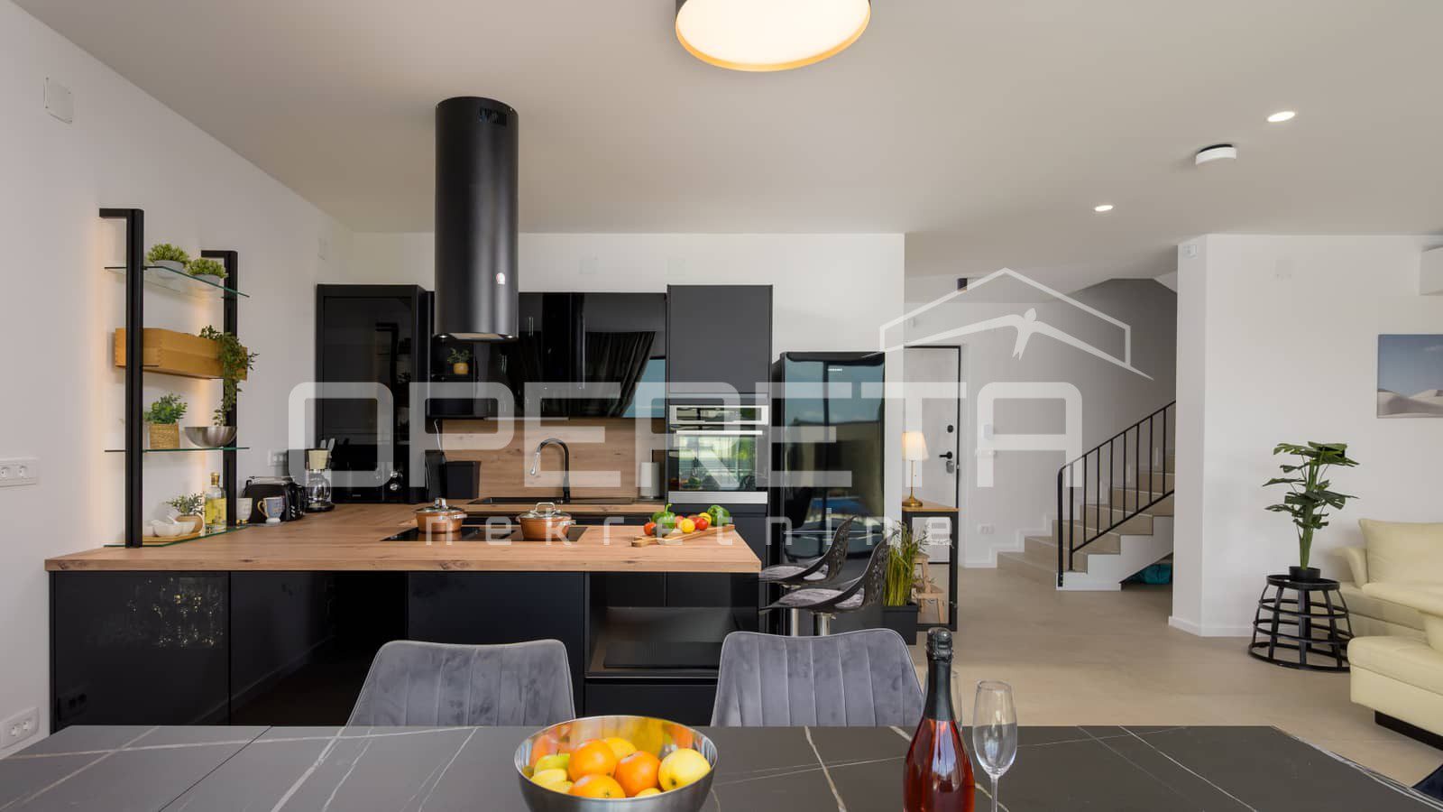 Special attention has been paid to interior design and high-quality fittings. The villa is equipped with electric underfloor heating, controlled via Wi-Fi, and air conditioning in all rooms. All bedrooms have oversized king-size beds (2×2.10 m). Safety features include an alarm system, video surveillance, security doors, and smoke detectors. The villa is also prepared for the installation of solar panels and an EV charger.