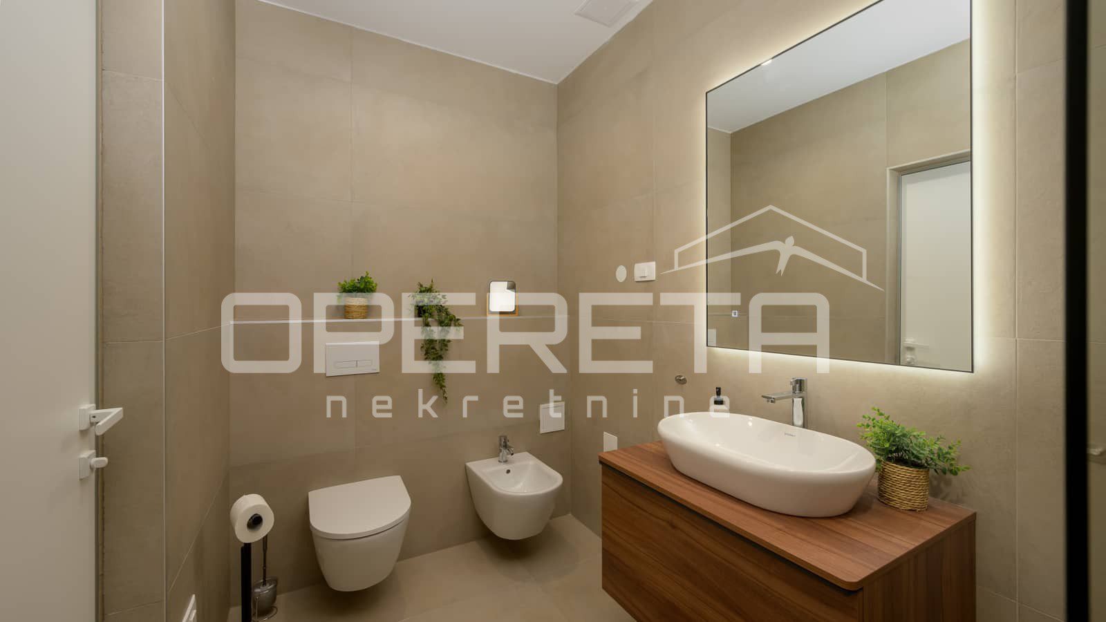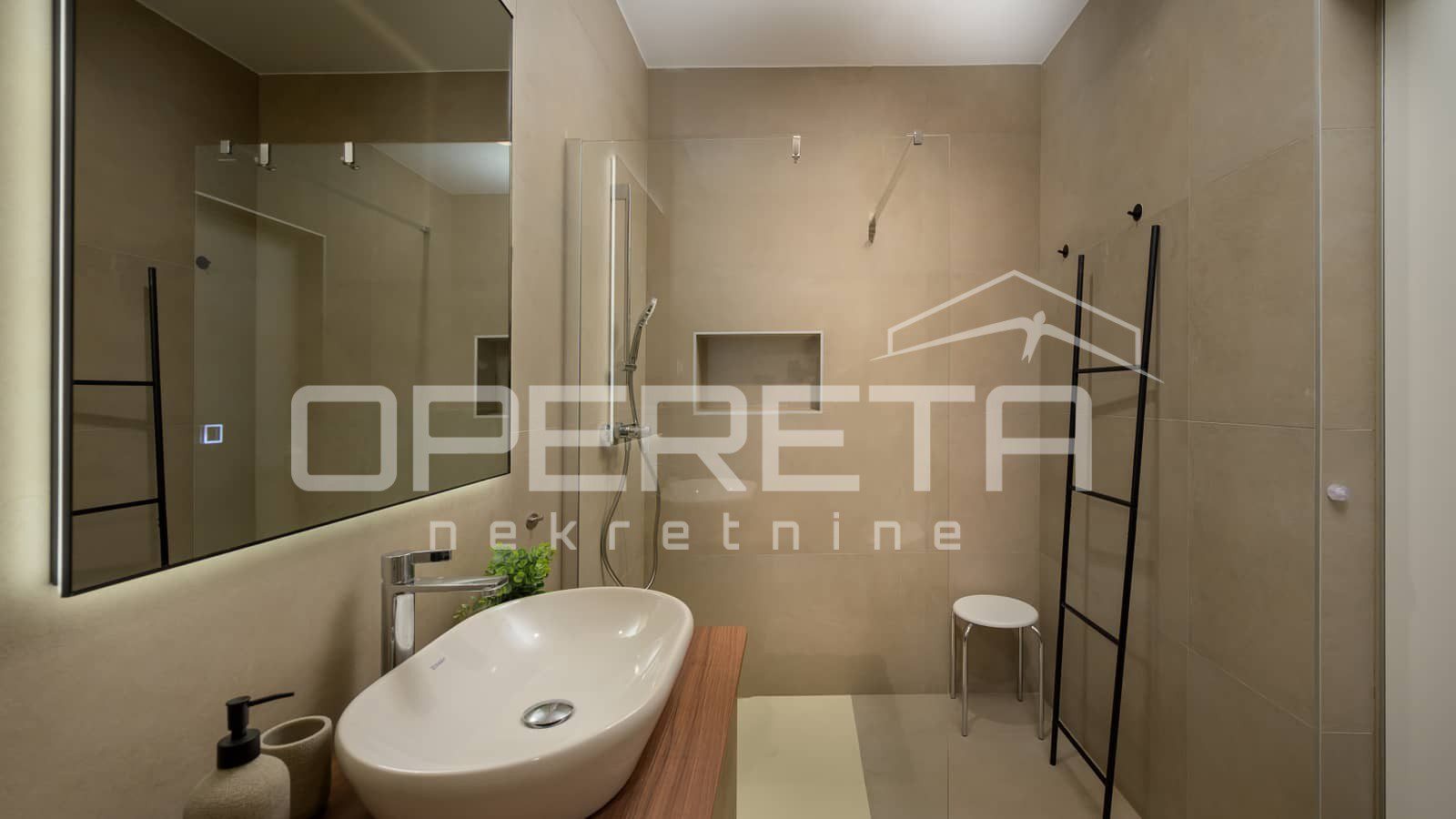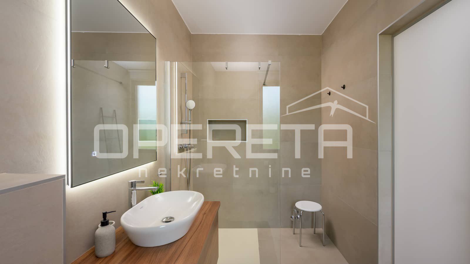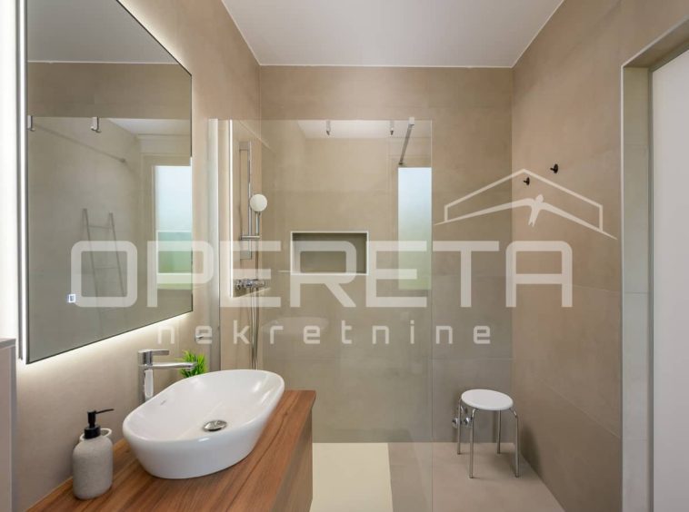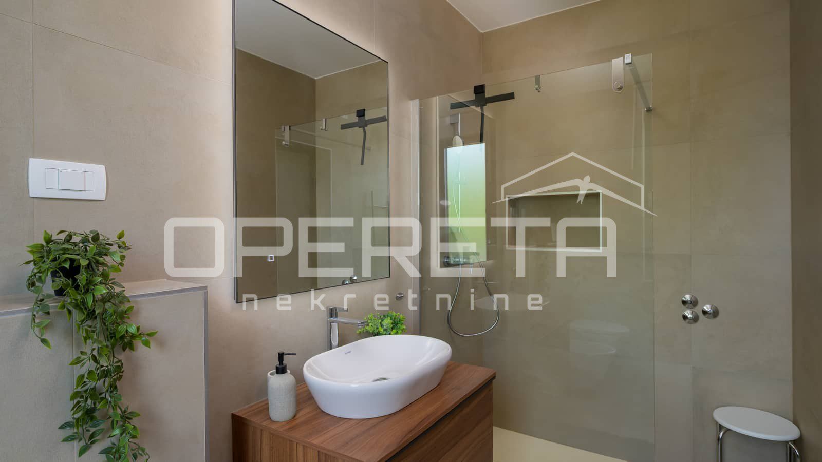 The outdoor area offers everything for complete comfort and enjoyment – a 48 m² swimming pool with a salt electrolysis system, an outdoor shower, and a covered summer kitchen of 26 m². The landscaped garden is equipped with an automatic irrigation system, and the villa includes two covered parking spaces.