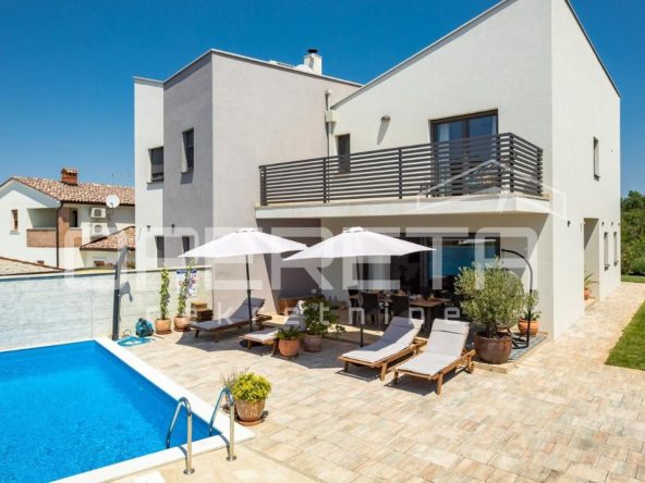 Brand new villa, with seaview and walking distance to the beach in Istria. This villa is located within a luxury tourist resort with the largest rooftop swimming pool in Istria, proximity of golf courses, spa, restaurants, etc. Some of the villas type 3, southern entrance with elevator are still available such as no 35. They consist of BASEMENT (staircase, hallway, tavern, wine cellar, toilet, playroom, elevator, storage), GROUND FLOOR (staircase, entrance and hallway, studio room, bathroom, equipment room, kitchen and garage), 1st FLOOR (staircase, hallway, laundry room, two bedrooms and two bathrooms – outdoor area: terrace and covered terrace), 2nd FLOOR (kitchen with dining room and living room, toilet, bedroom and bathroom – outdoor area: terrace). The price includes furniture and equipment, does not include VAT. Return on investment – tourist rental possible.