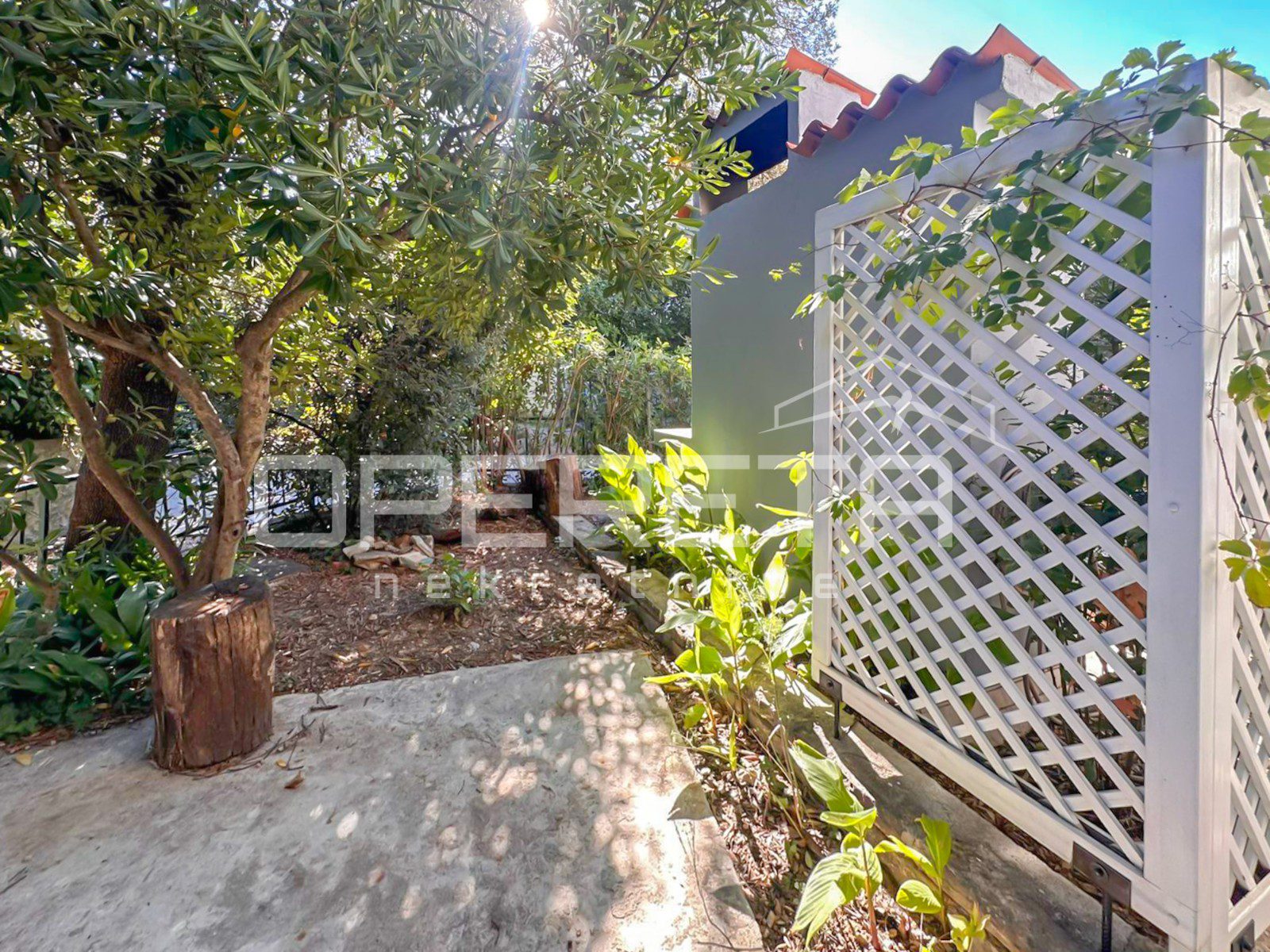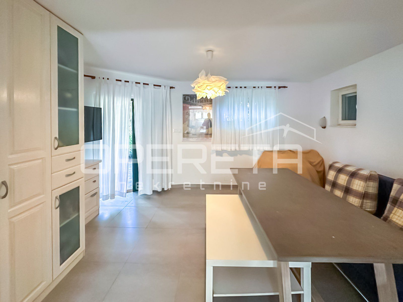 The ground-floor unit on the west side features a pleasant outdoor area with a covered terrace of 17 m², a small garden, a yard with a stone barbecue, and a cellar, with a total area of 126 m². The interior includes a living room with kitchen, one bedroom, and a bathroom, totaling 43 m².