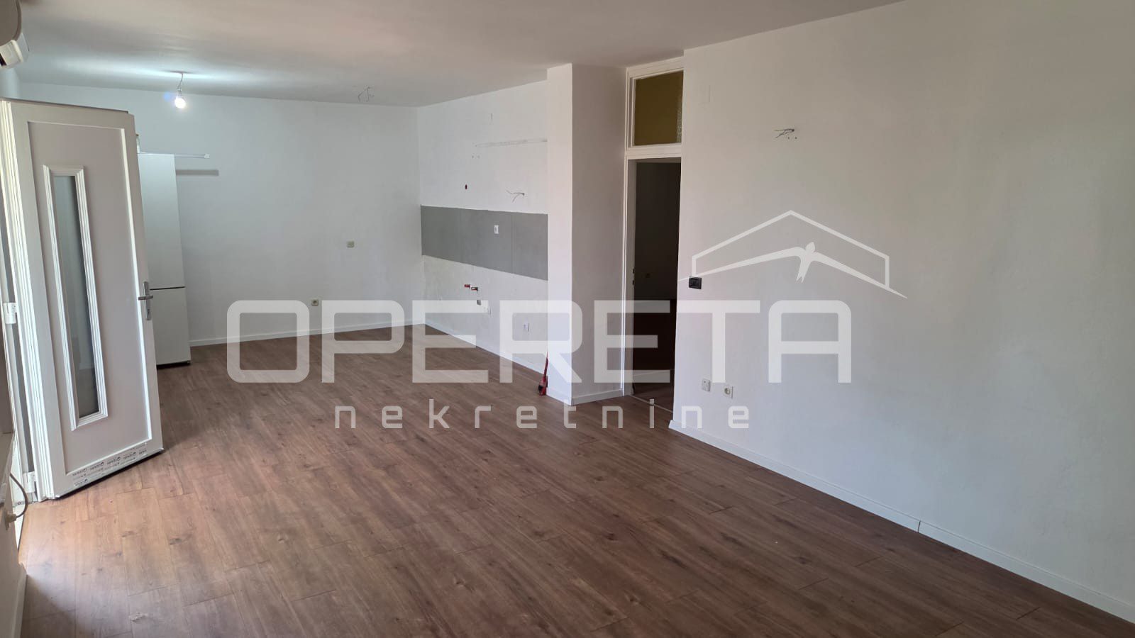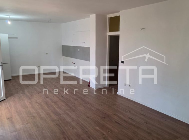 It consists of an entrance hall, a large room with a kitchen and a living room with a total area of 36 m2, a hallway, two bedrooms and a bathroom with a toilet.