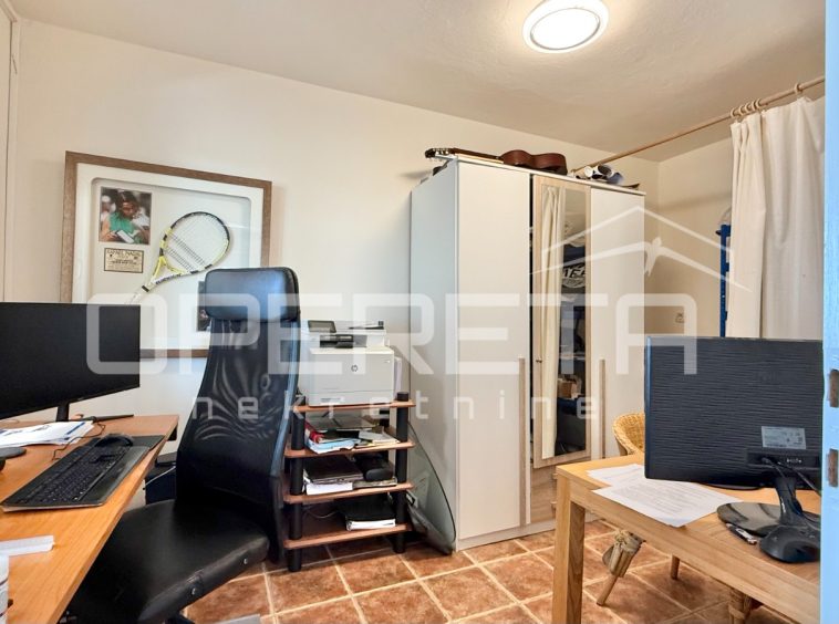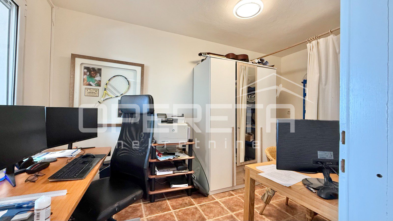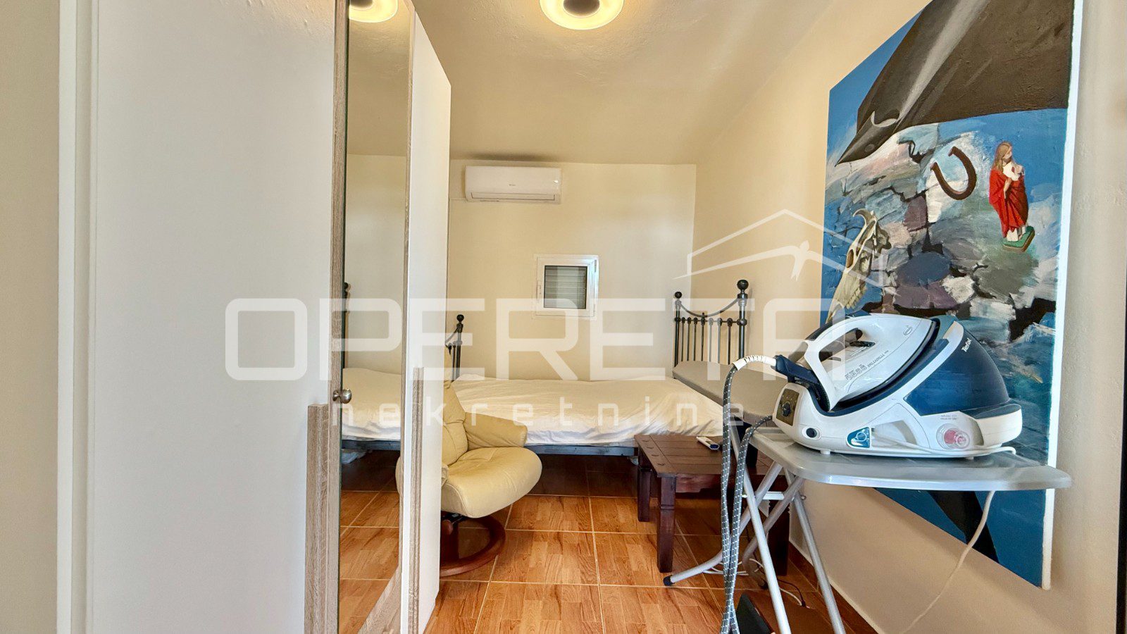 The ground floor includes a spacious living room, two bedrooms, a bathroom, and a small work area. From the living room, there is access to a terrace that offers a beautiful sea view.