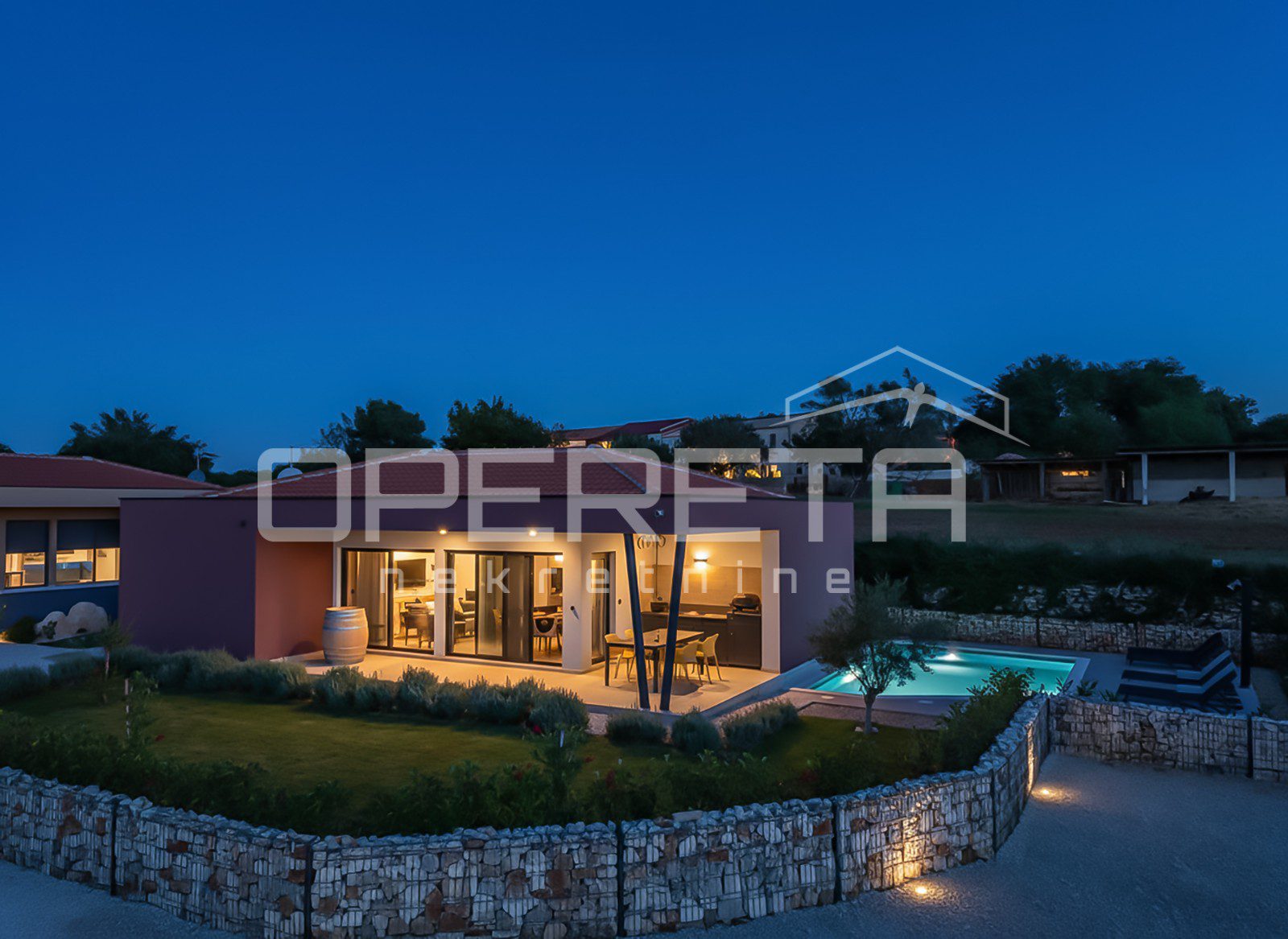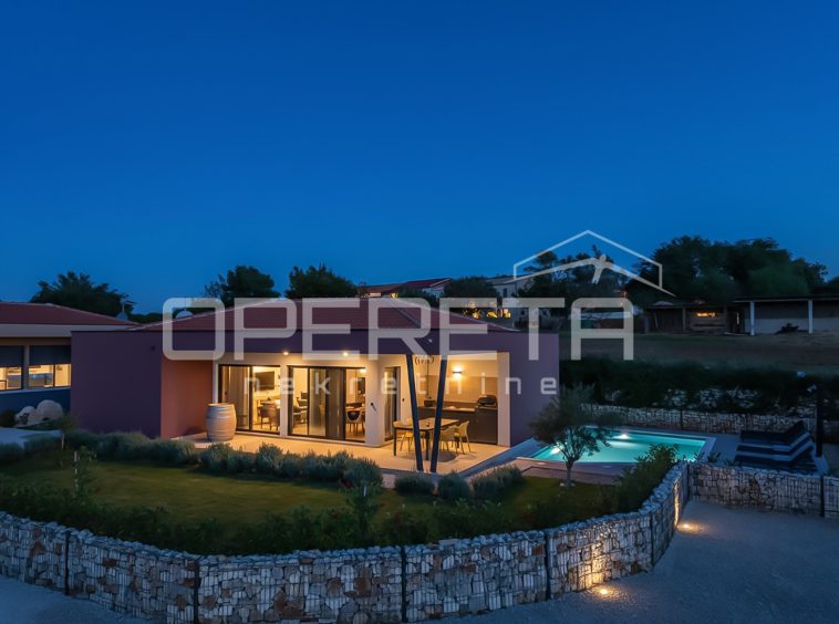 Just a few minutes’ drive from Sv. Lovreč, this newly built, fully furnished, and modernly equipped house is situated, offering a perfect blend of Mediterranean charm, comfort, and privacy. The house has a living area of 102 m² on a plot of 567 m². It also includes a 27 m² swimming pool with a spacious sun deck of 48 m². The interior offers three bedrooms, two bathrooms, plus an additional toilet and laundry room. The house has an energy rating A. It is completely furnished with high-end modern furniture and appliances and carefully designed so that every corner provides a sense of home and relaxation. The spacious covered terrace features a summer kitchen with a grill, refrigerator, sink, and practical work surfaces, as well as a large dining table. The terrace offers a view of an olive grove with no possibility of further construction, which guarantees lasting peace and privacy. Next to the pool, there are six sun loungers and a shower. The surroundings are carefully landscaped with Mediterranean plants such as lavender, palms, and laurel cherry, all watered by an automatic system.