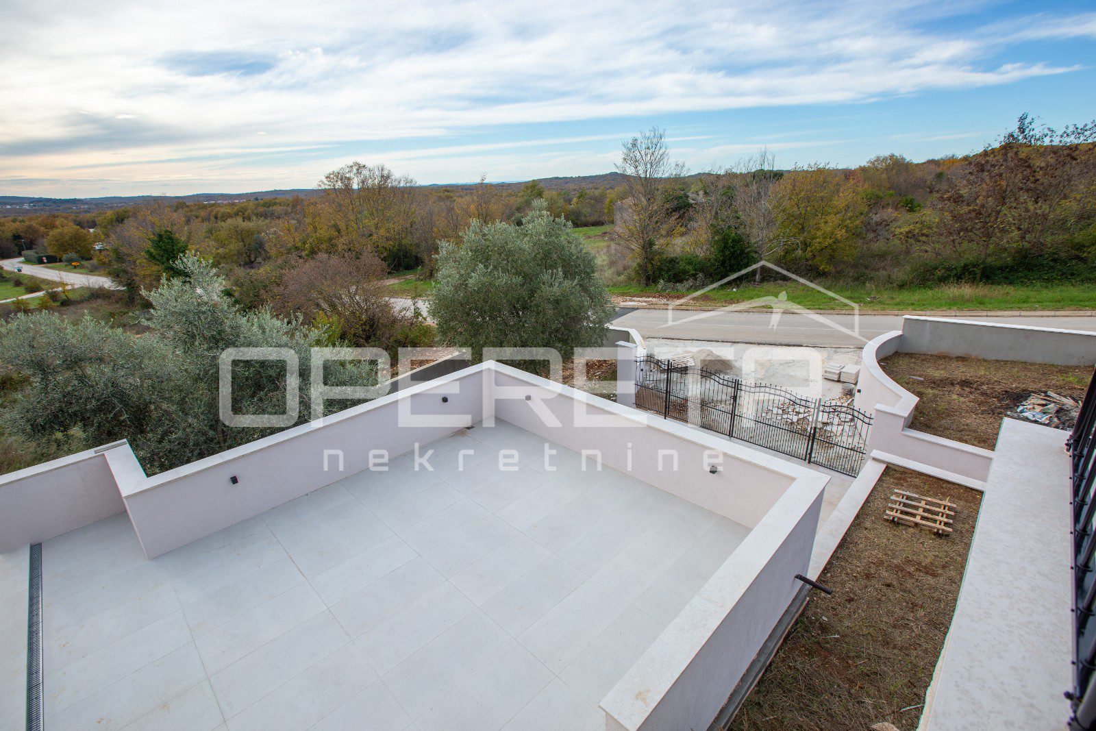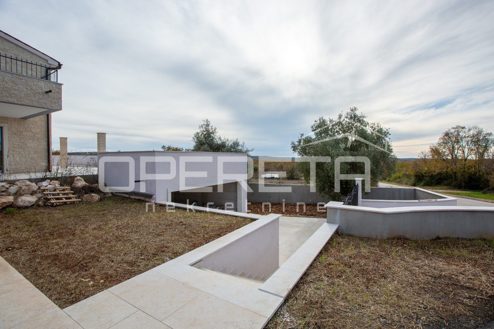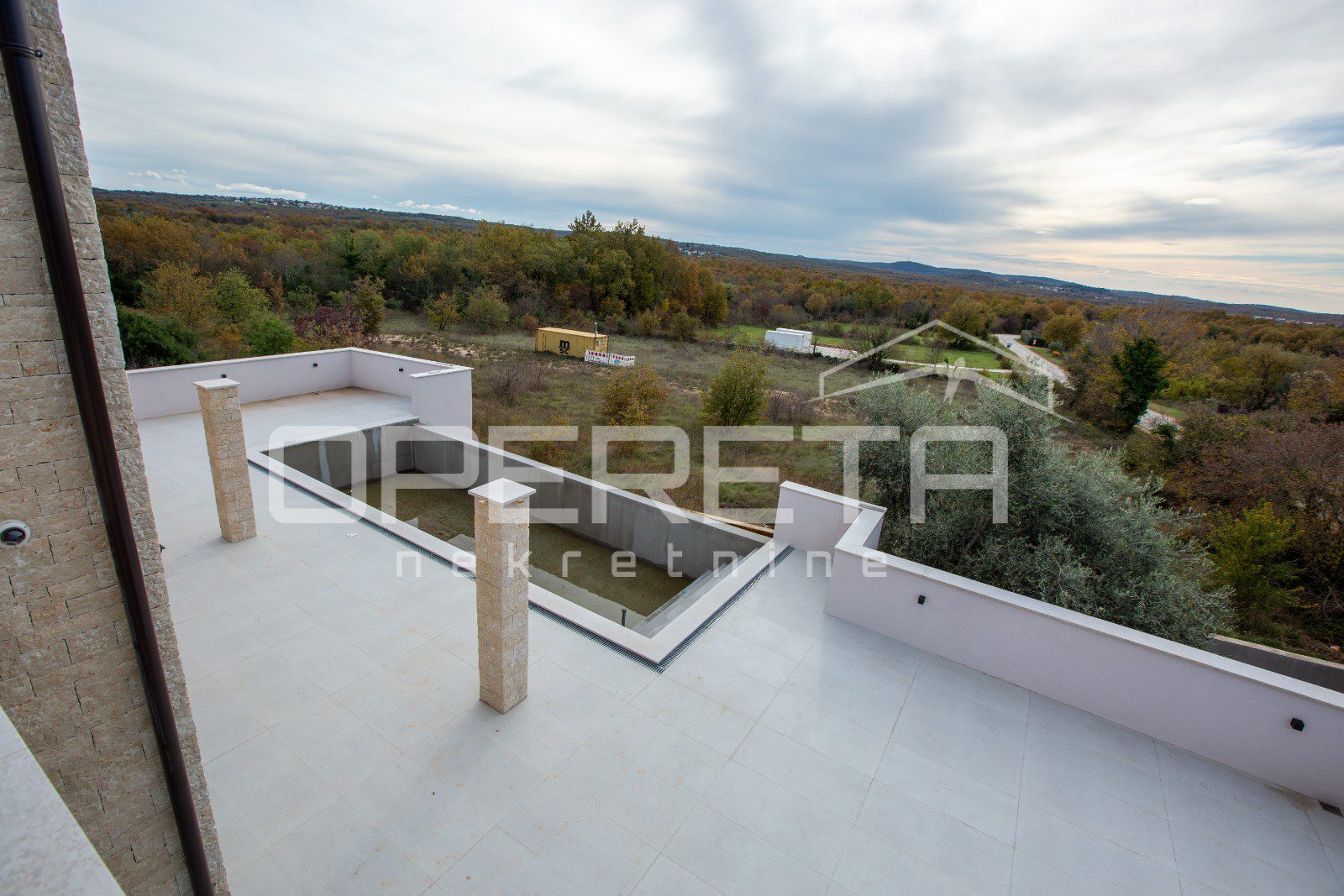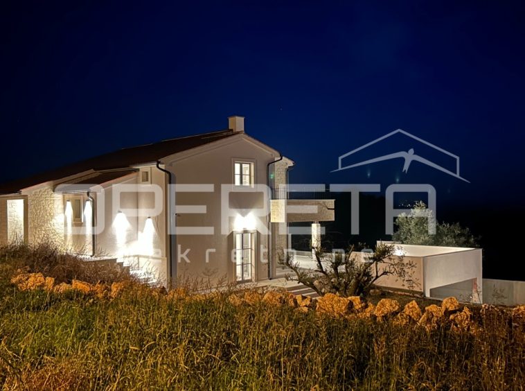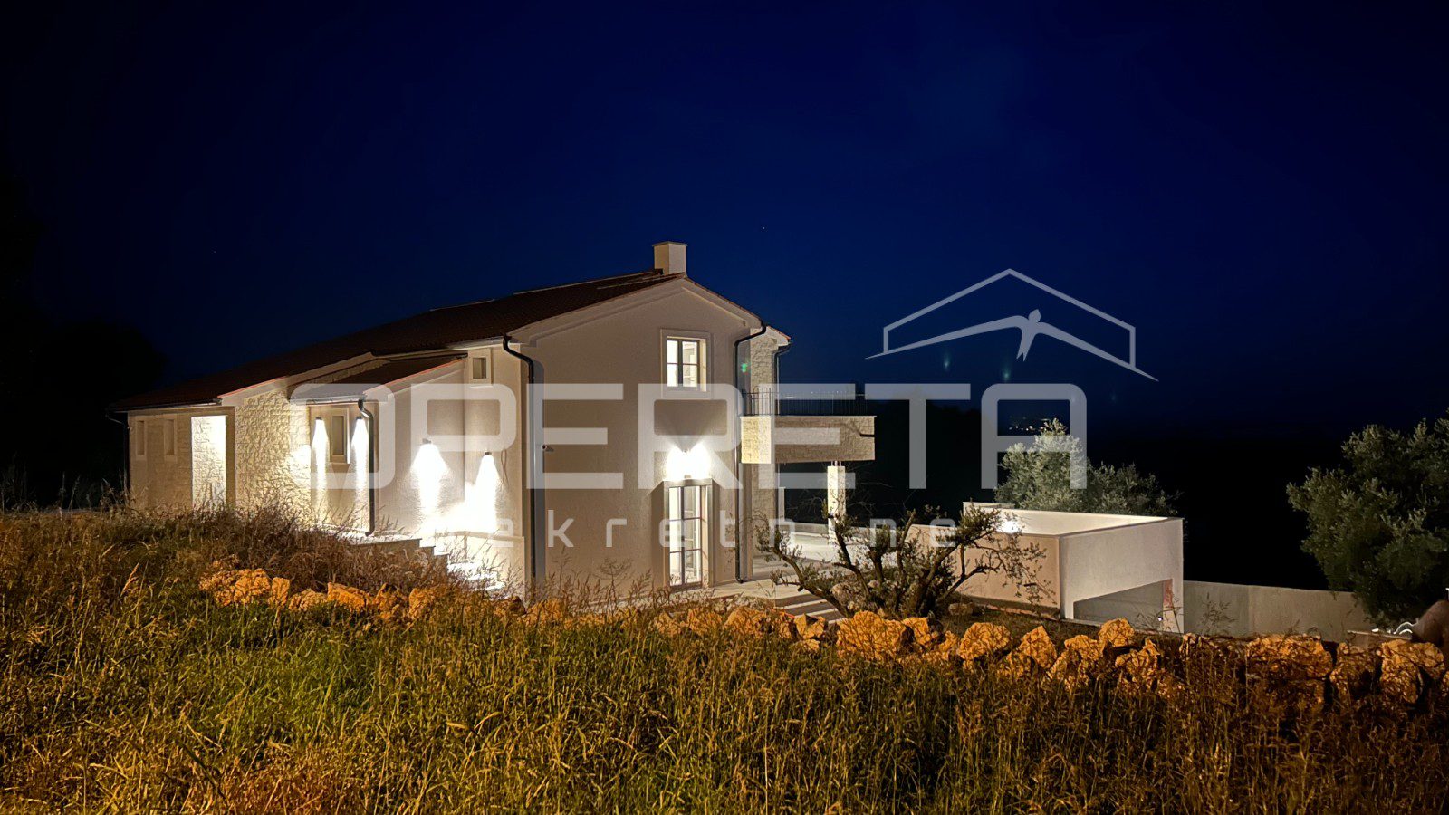 It includes three full bathrooms plus an additional guest toilet. The generous kitchen seamlessly connects to the dining area and living room, which opens onto a terrace and complete with an infinity pool overlooking the surroundings, as well as a double garage. The upper level hosts three additional bedrooms. Heating and cooling are ensured through air-conditioning units, with the added option of a fireplace for extra comfort.