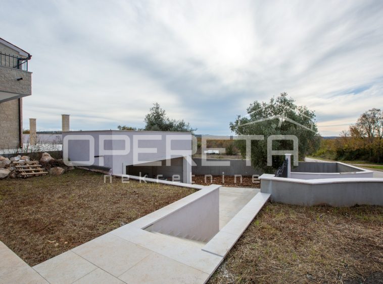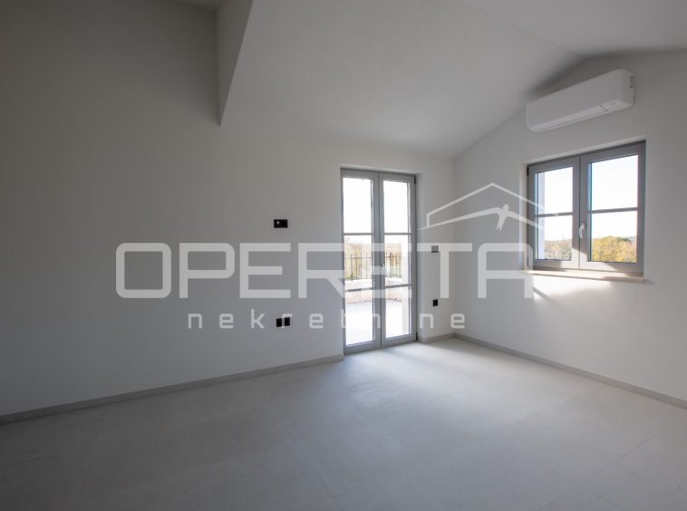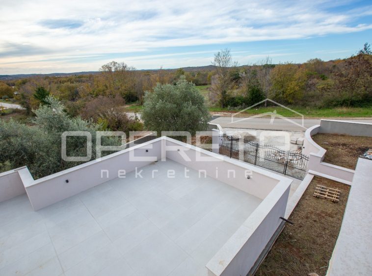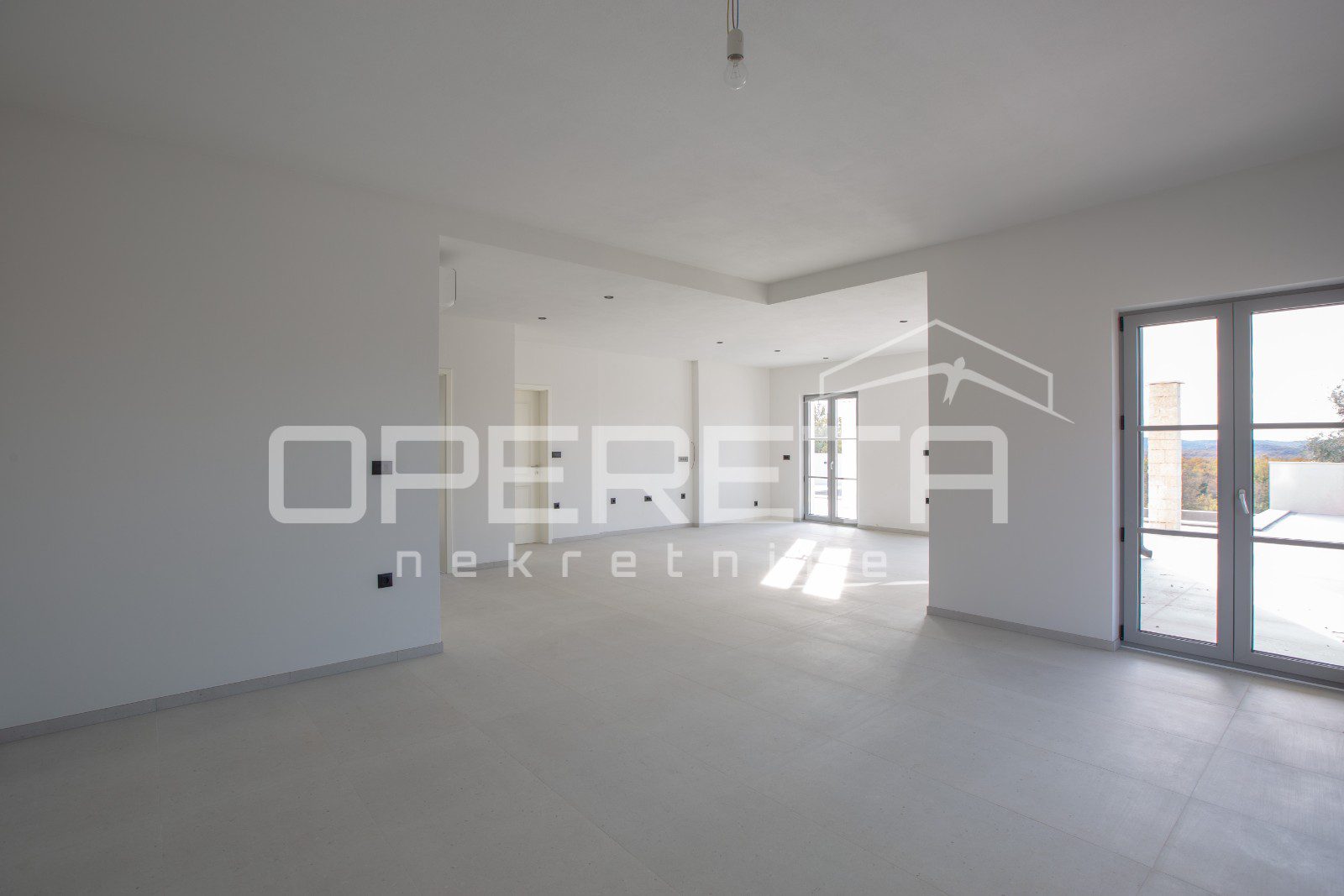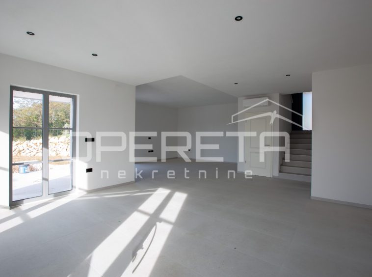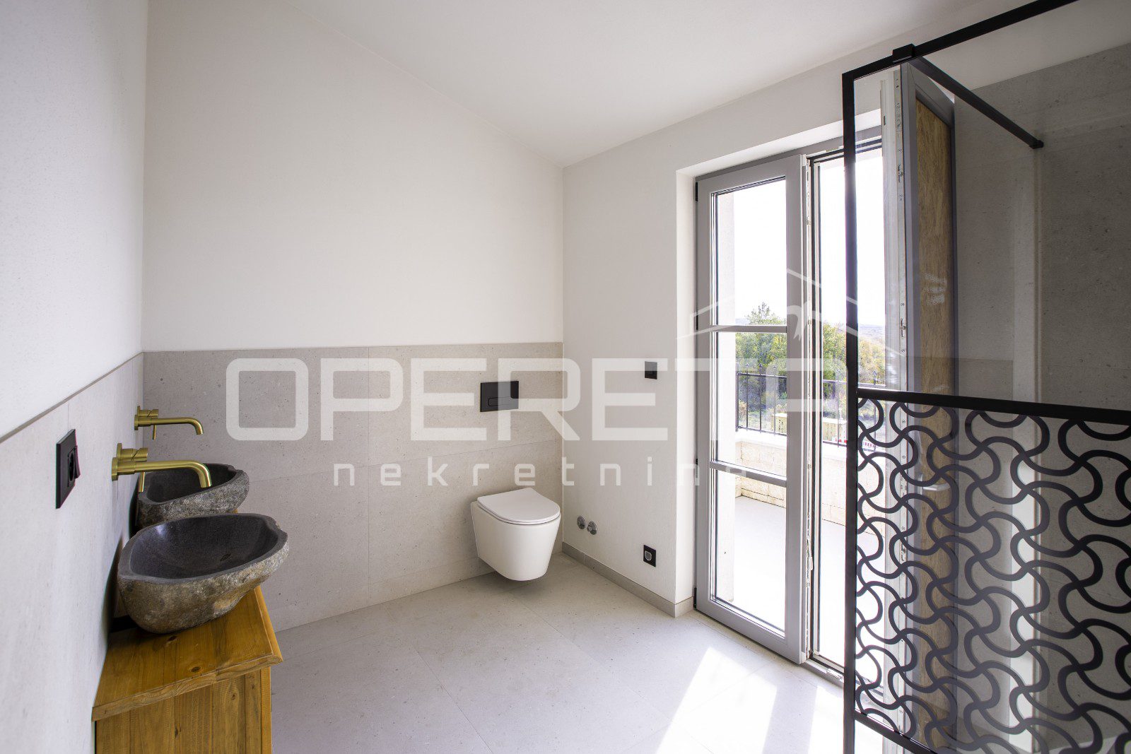 It includes three full bathrooms plus an additional guest toilet. The generous kitchen seamlessly connects to the dining area and living room, which opens onto a terrace and complete with an infinity pool overlooking the surroundings, as well as a double garage. The upper level hosts three additional bedrooms. Heating and cooling are ensured through air-conditioning units, with the added option of a fireplace for extra comfort.