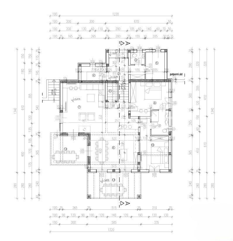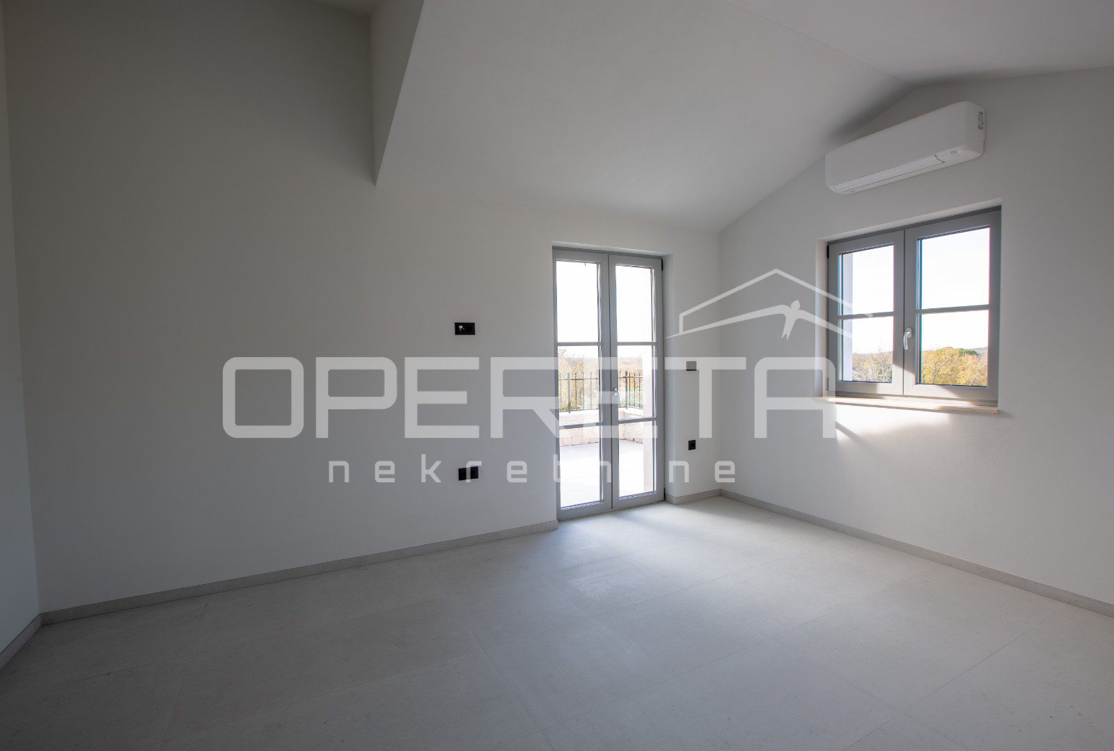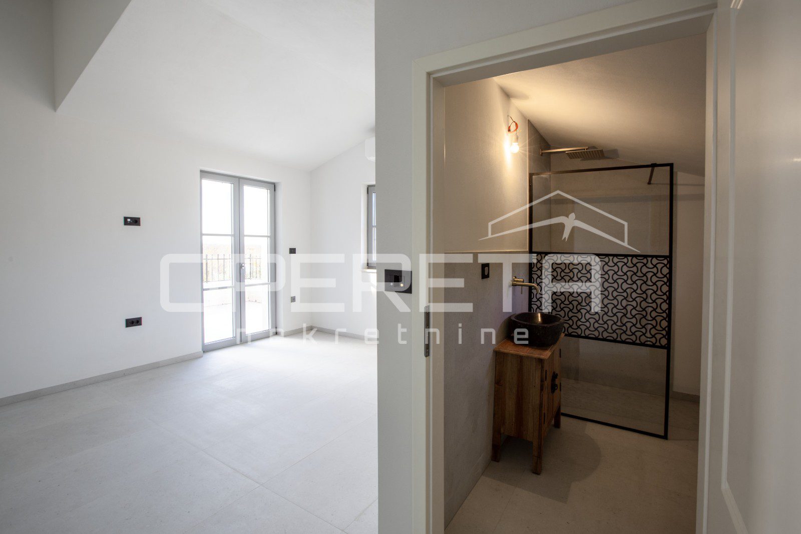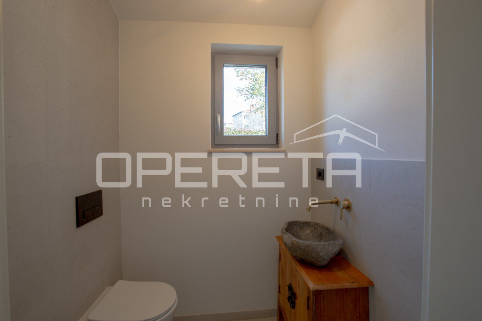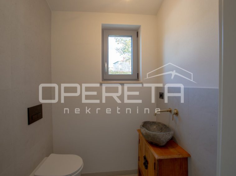 It includes three full bathrooms plus an additional guest toilet. The generous kitchen seamlessly connects to the dining area and living room, which opens onto a terrace and complete with an infinity pool overlooking the surroundings, as well as a double garage. The upper level hosts three additional bedrooms. Heating and cooling are ensured through air-conditioning units, with the added option of a fireplace for extra comfort.
