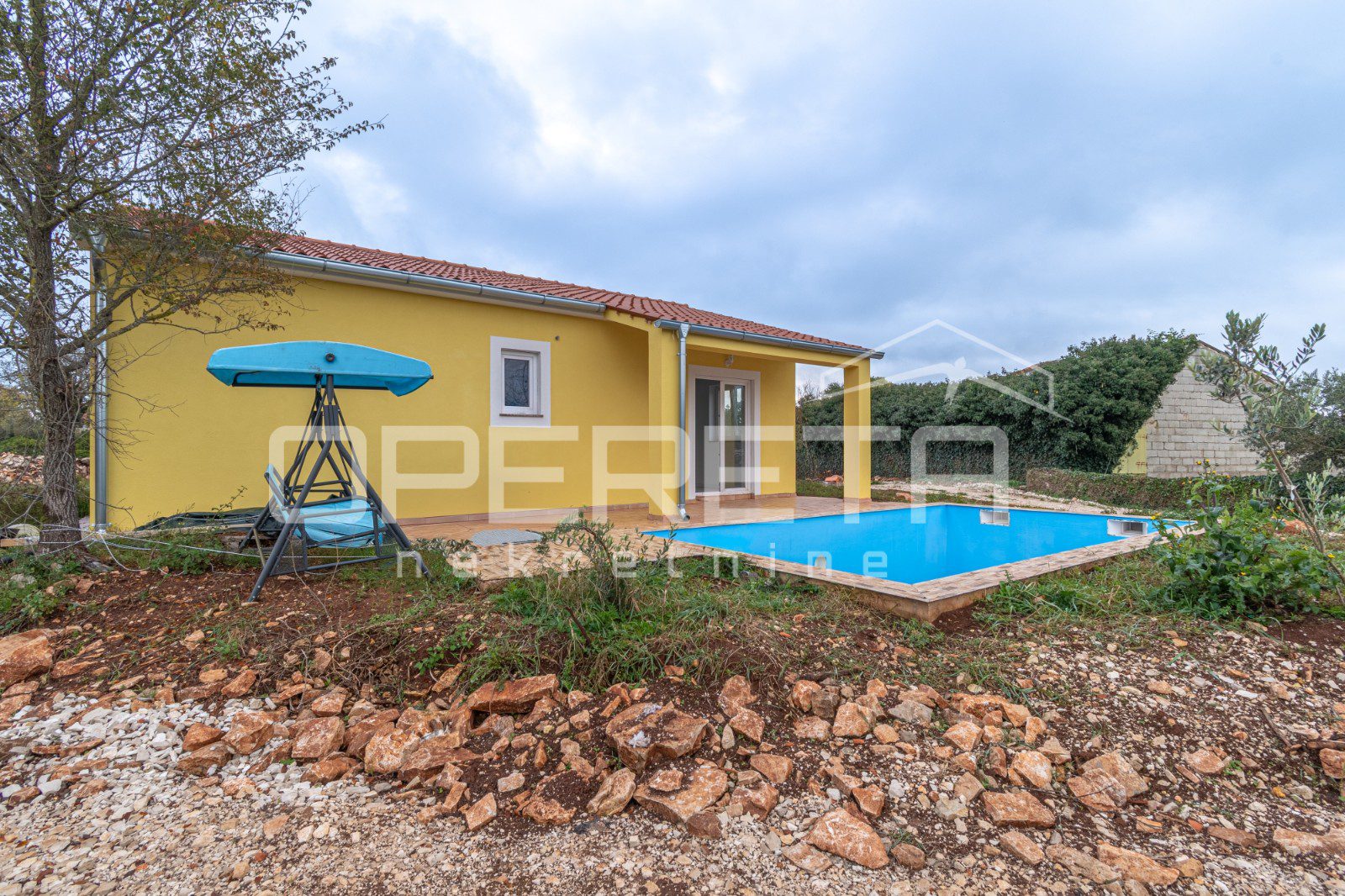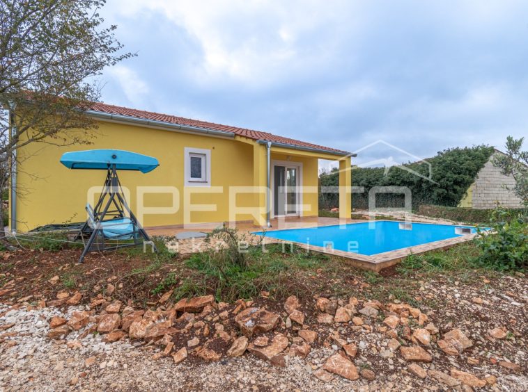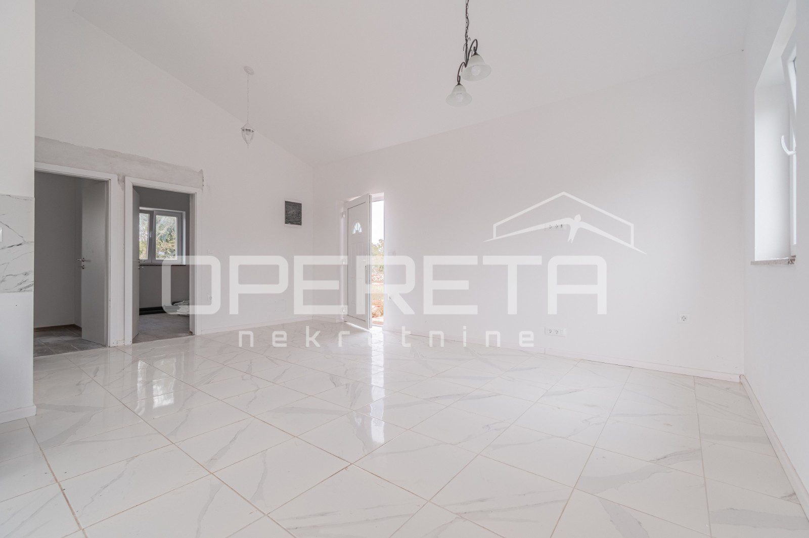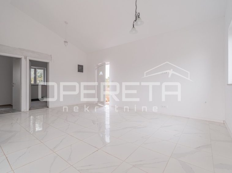 In a quiet location in Čabrunići, a single-storey house is for sale, ideal for year-round living or for tourist rental. The house consists of two bedrooms, a bathroom and an open living area with a kitchen and dining room, with direct access to a 10 m² covered terrace.