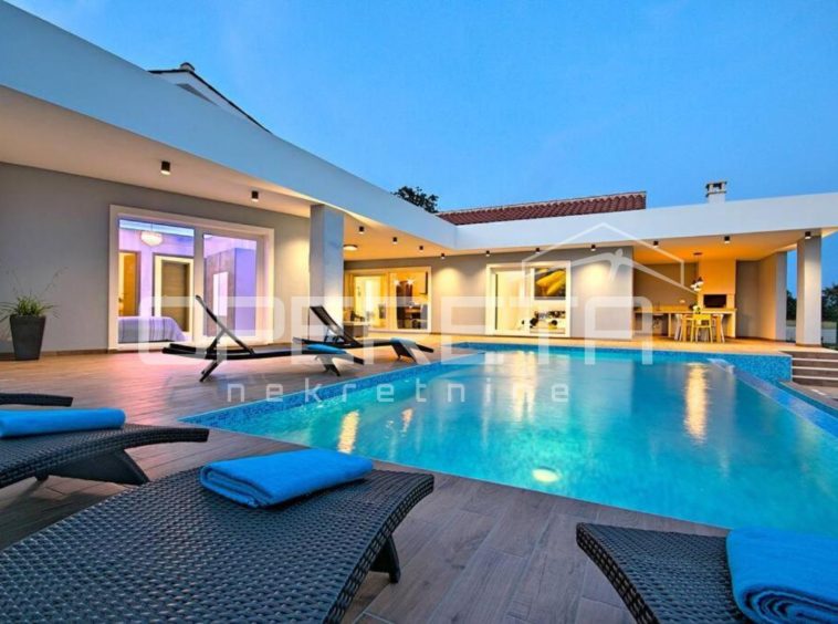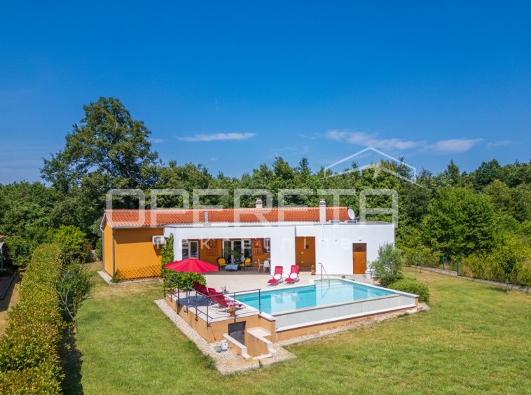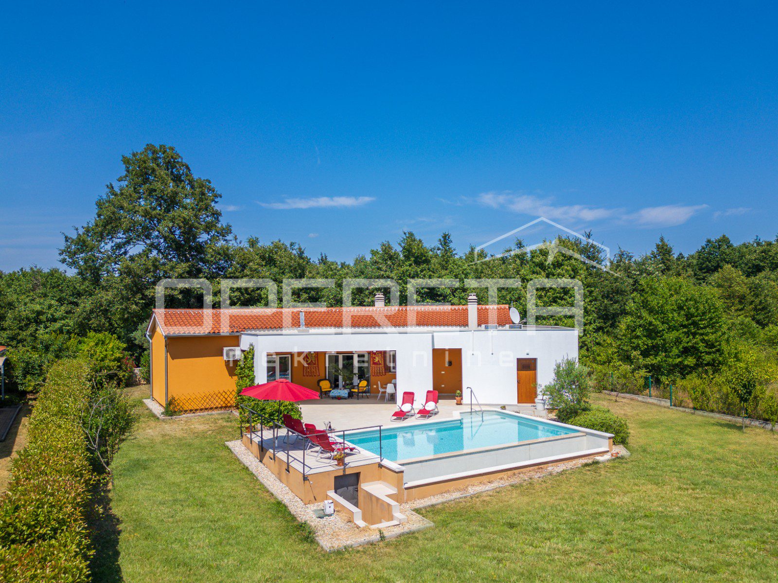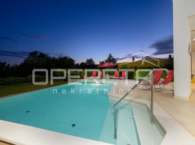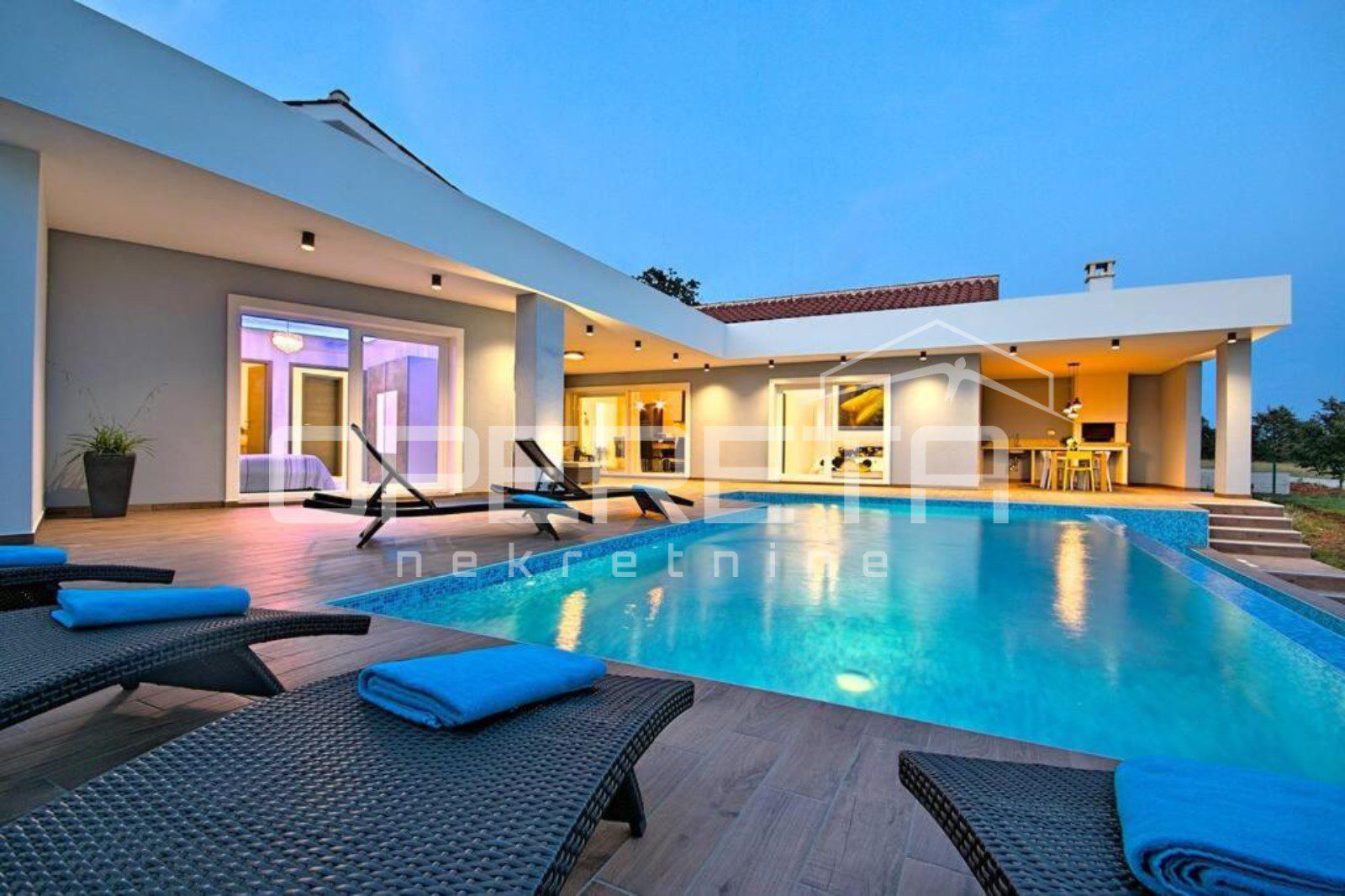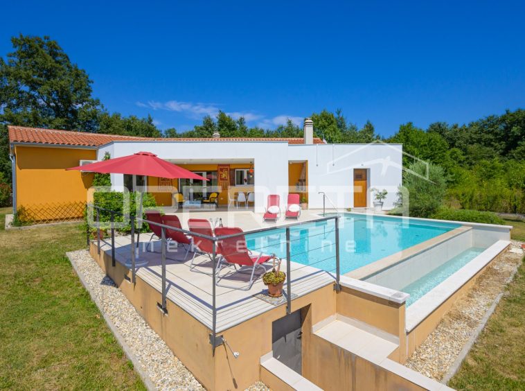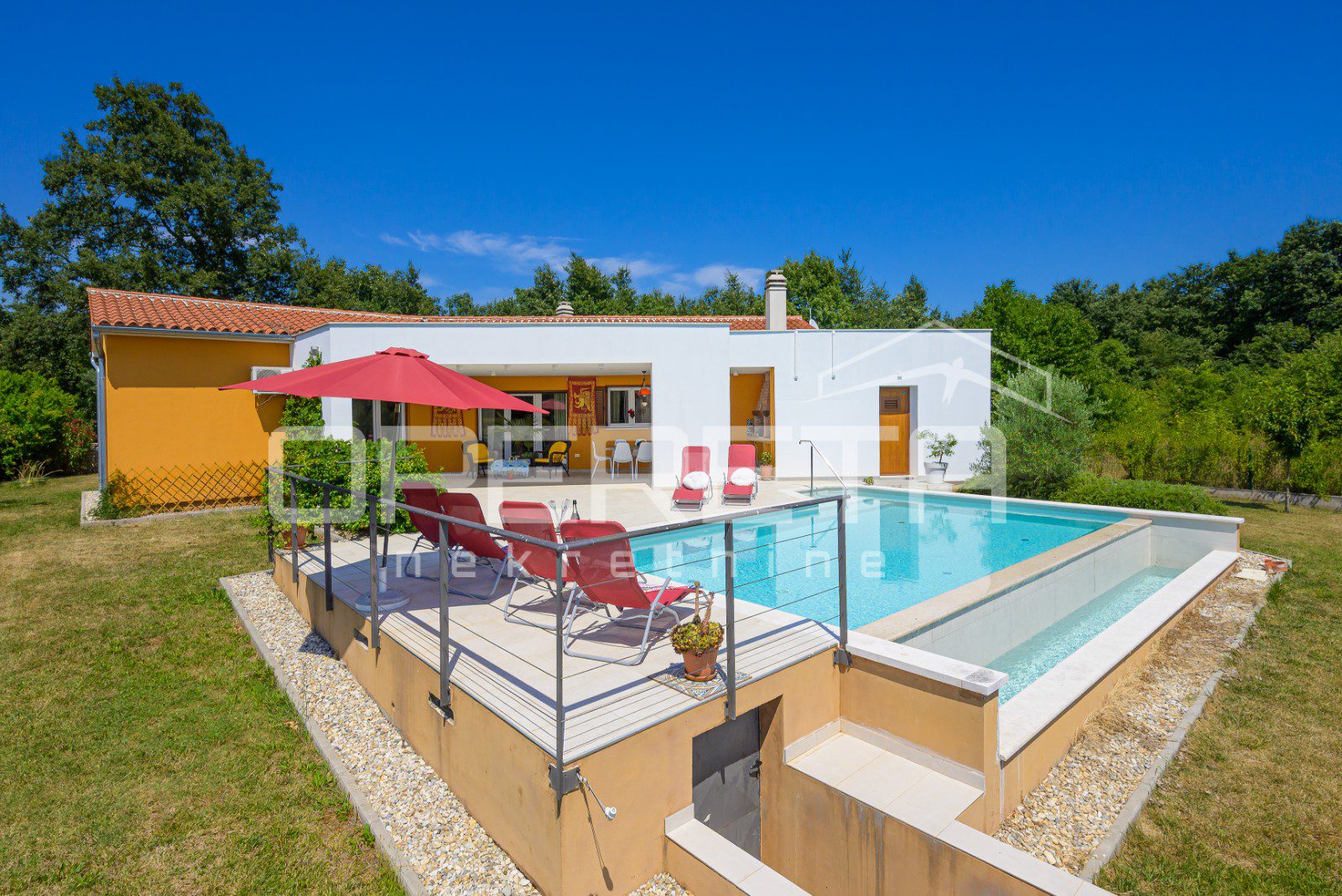 For sale is an attractive modern villa located in the heart of central Istria, in a peaceful setting not far from the magical medieval town of Svetvinčenat. This elegant single-storey house, built in 2018, is characterized by contemporary architecture and a carefully decorated interior that exudes style and sophistication. The villa is located on a plot of 1,079 m², while the living area itself is 170 m².
