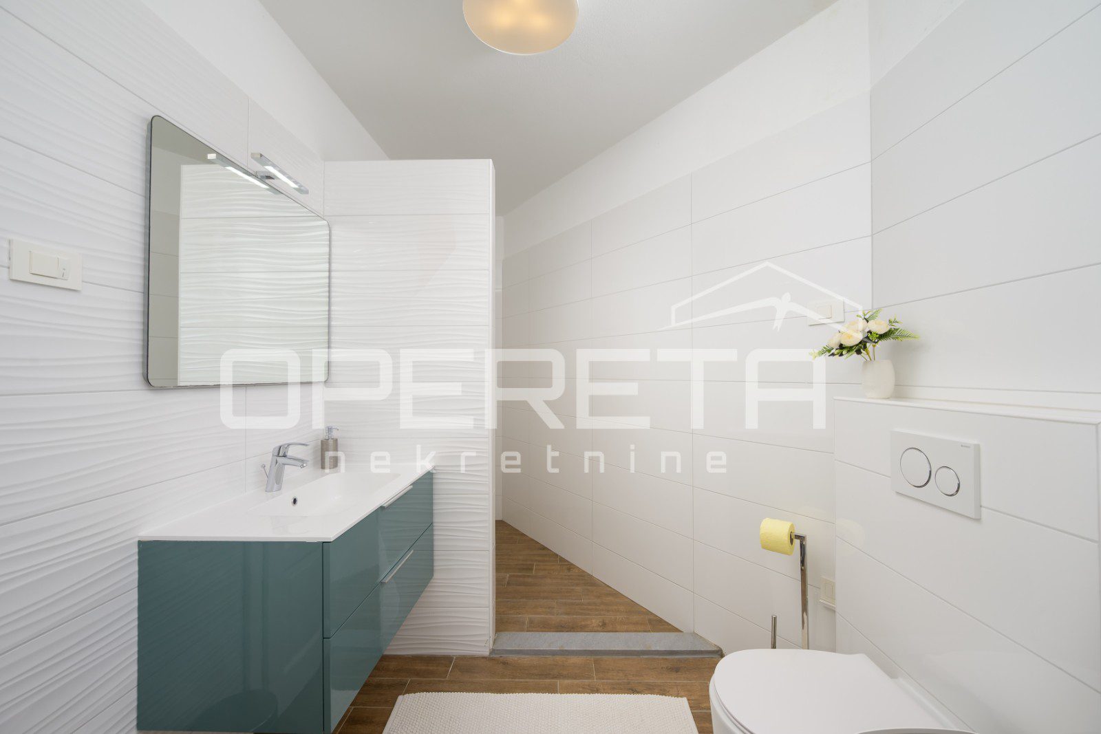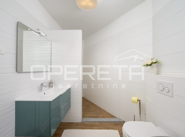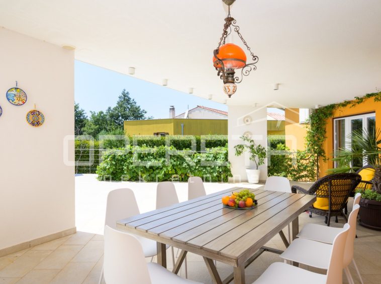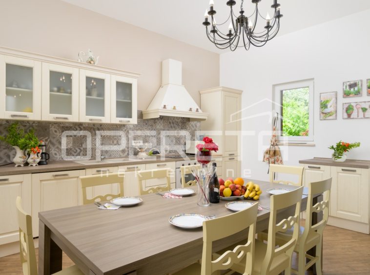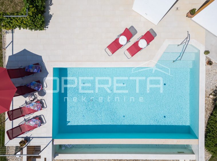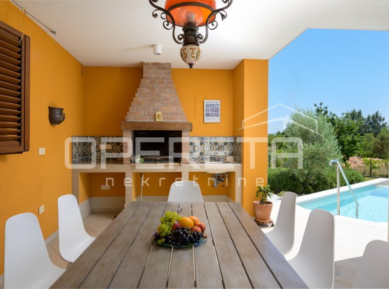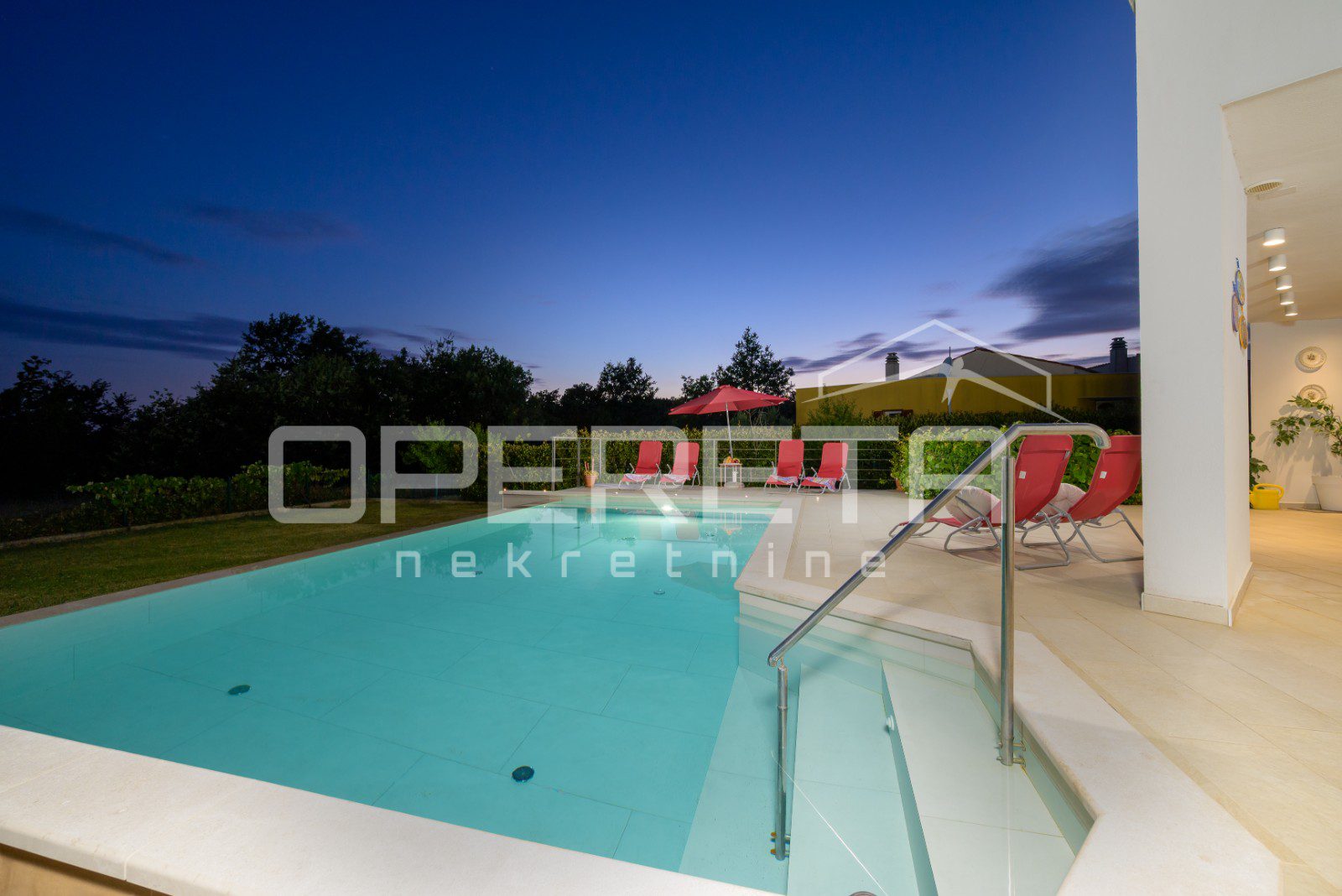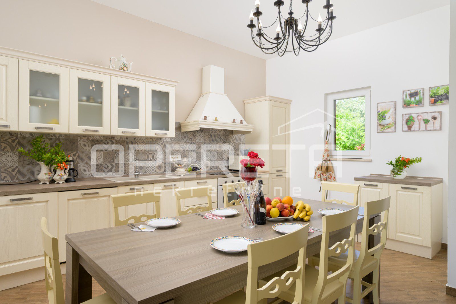 For sale is an attractive modern villa located in the heart of central Istria, in a peaceful setting not far from the magical medieval town of Svetvinčenat. This elegant single-storey house, built in 2018, is characterized by contemporary architecture and a carefully decorated interior that exudes style and sophistication. The villa is located on a plot of 1,079 m², while the living area itself is 170 m².