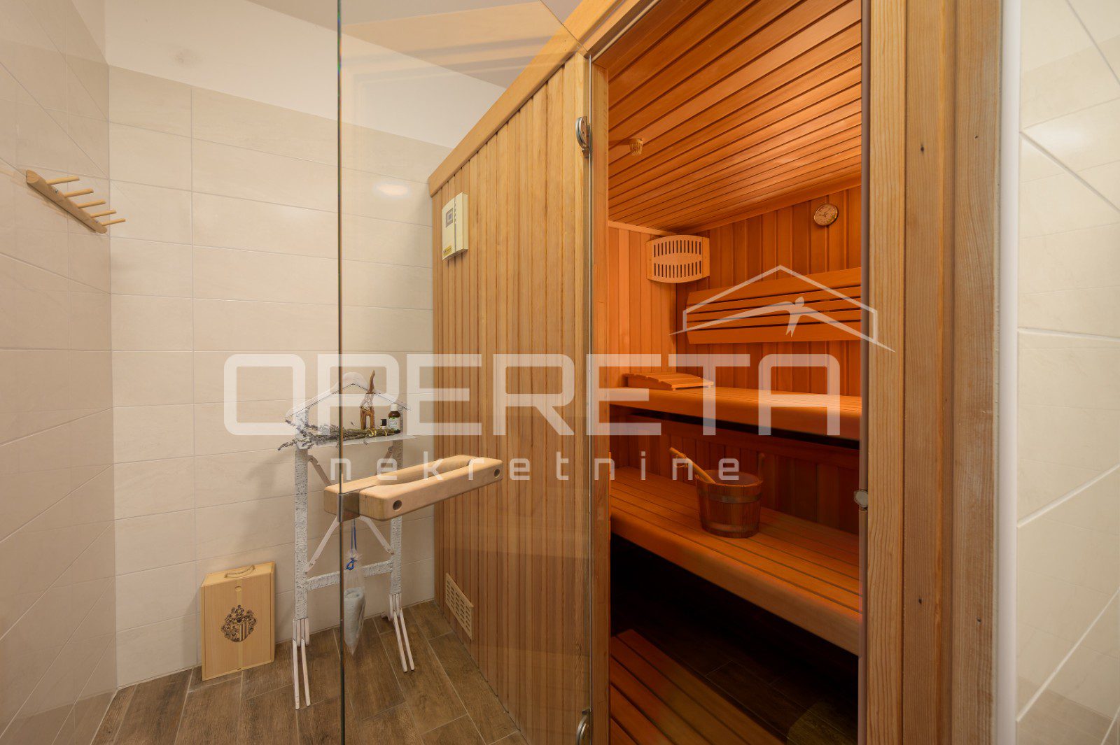 The entire property is air-conditioned, and an additional luxury is provided by a sauna — perfect for relaxation at any time of the year. The living room and dining room lead out onto a large covered terrace with a built-in fireplace, ideal for socializing and evening gatherings. Next to the terrace is a large swimming pool surrounded by deck chairs, creating the perfect area for sunbathing and relaxing.