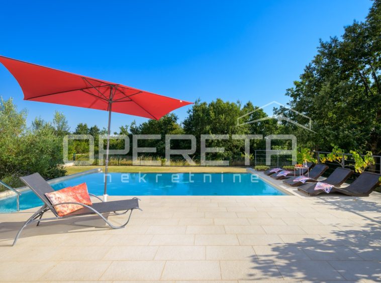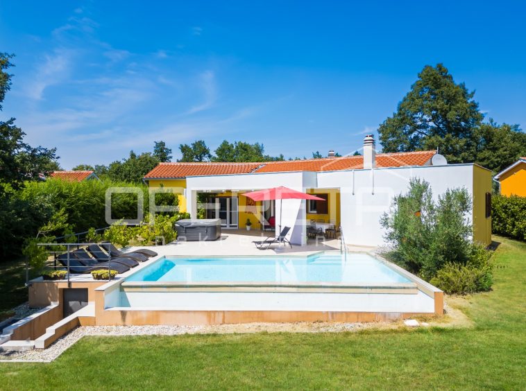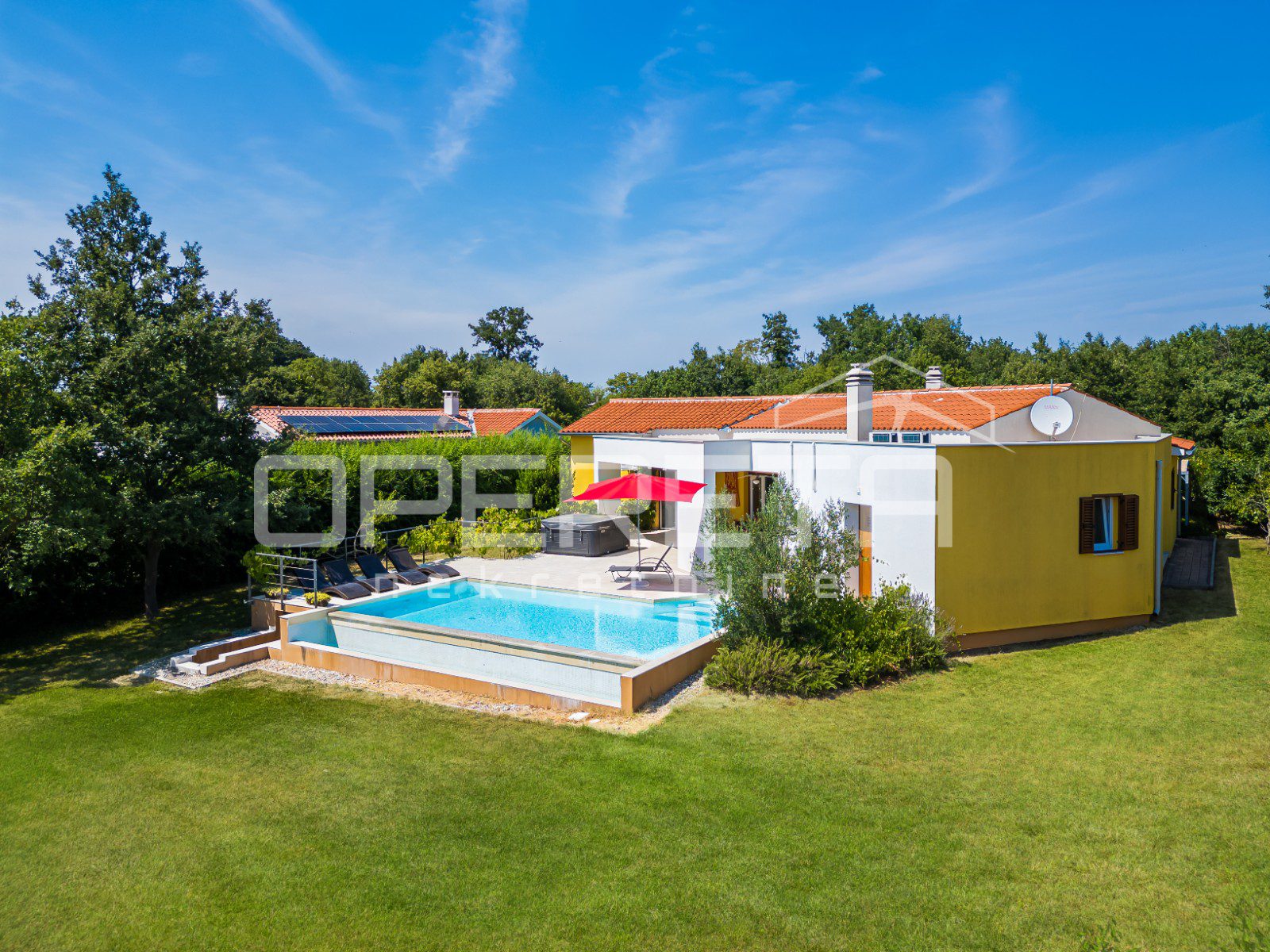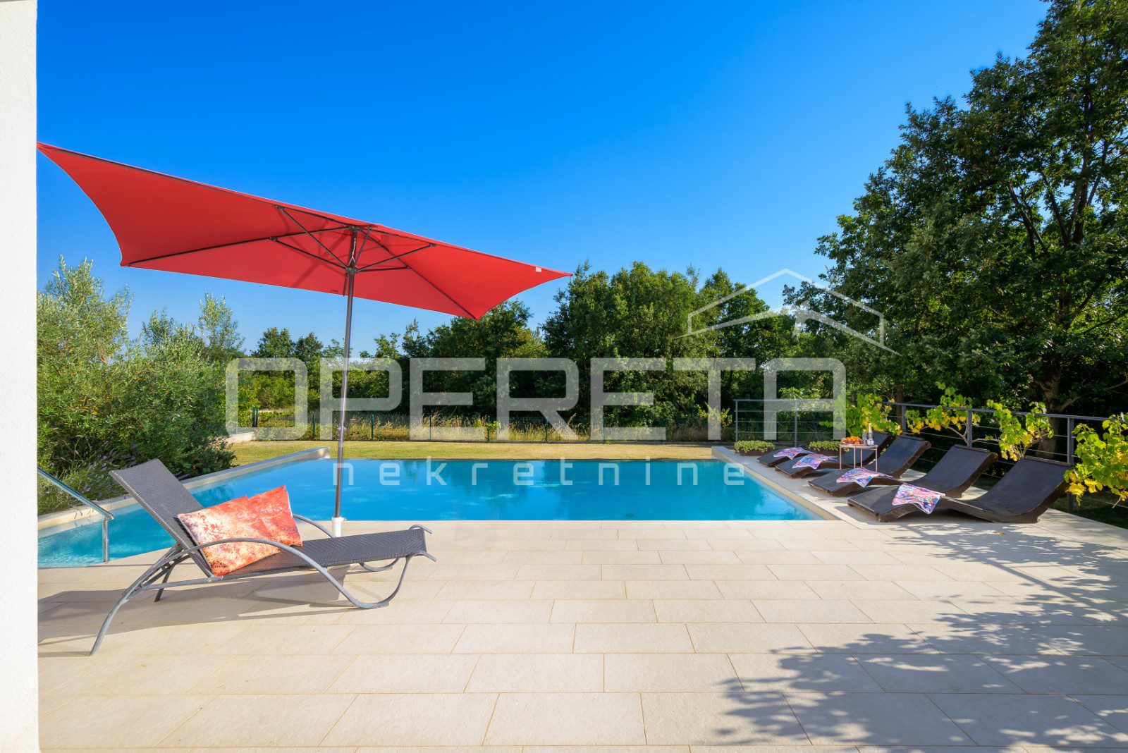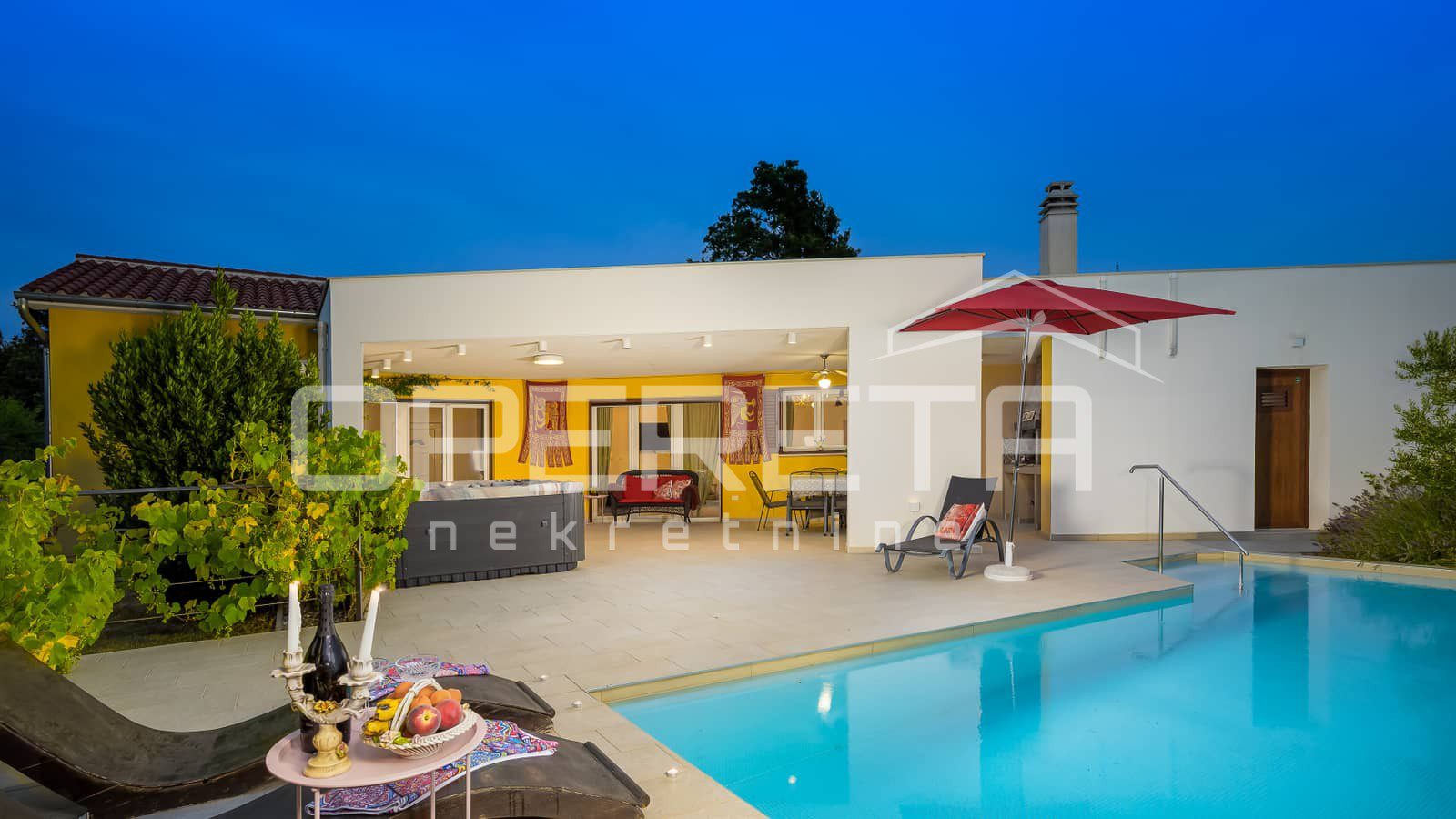 For sale is an attractive modern villa located in the heart of central Istria, in a peaceful setting not far from the magical medieval town of Svetvinčenat. This elegant single-storey house, built in 2018, is characterized by contemporary architecture and a carefully decorated interior that exudes style and sophistication. The villa is located on a plot of 1,079 m², while the living area itself is 170 m².
