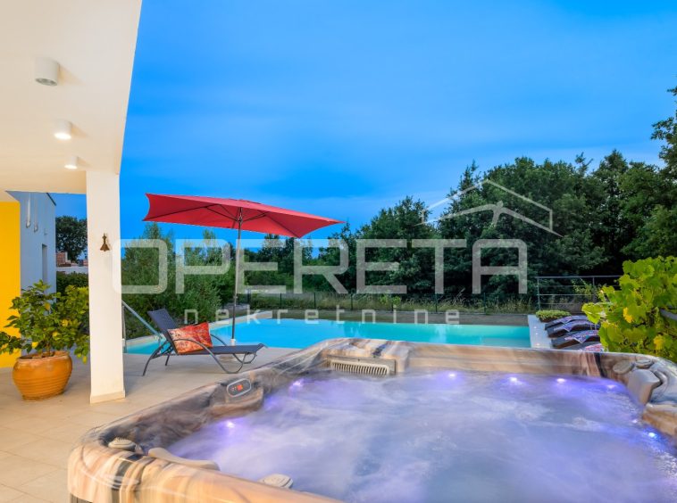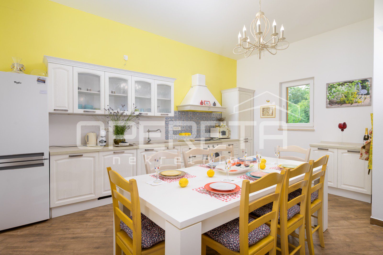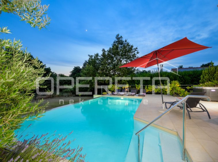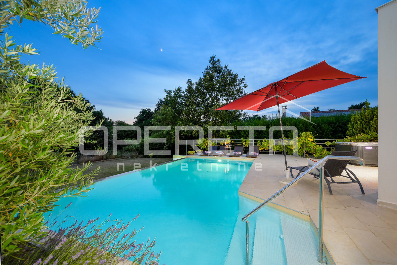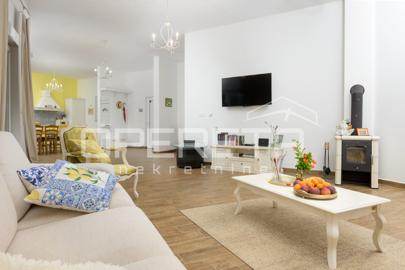 For sale is an attractive modern villa located in the heart of central Istria, in a peaceful setting not far from the magical medieval town of Svetvinčenat. This elegant single-storey house, built in 2018, is characterized by contemporary architecture and a carefully decorated interior that exudes style and sophistication. The villa is located on a plot of 1,079 m², while the living area itself is 170 m².