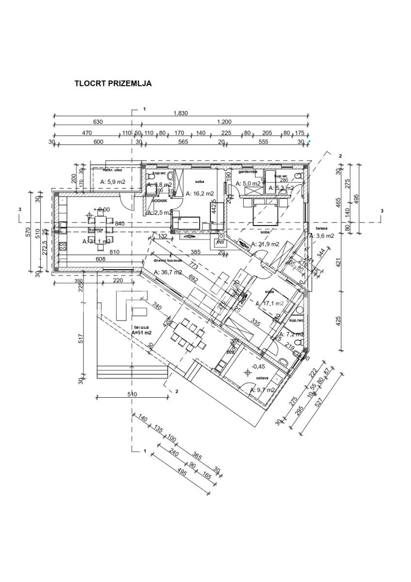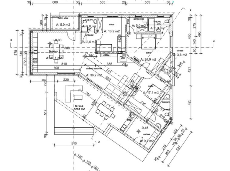 The interior of the house is designed to provide maximum comfort. It consists of three modernly decorated bedrooms, each with its own bathroom, a spacious living room and a kitchen with a dining area and an outdoor storage room.