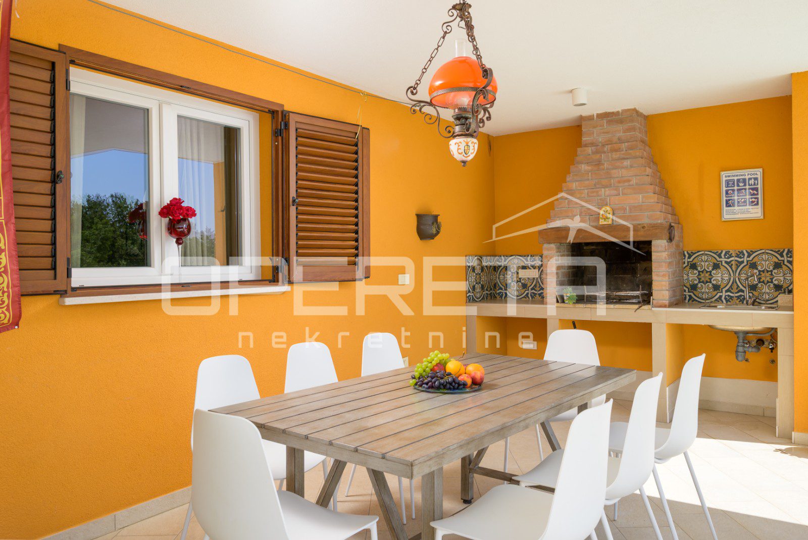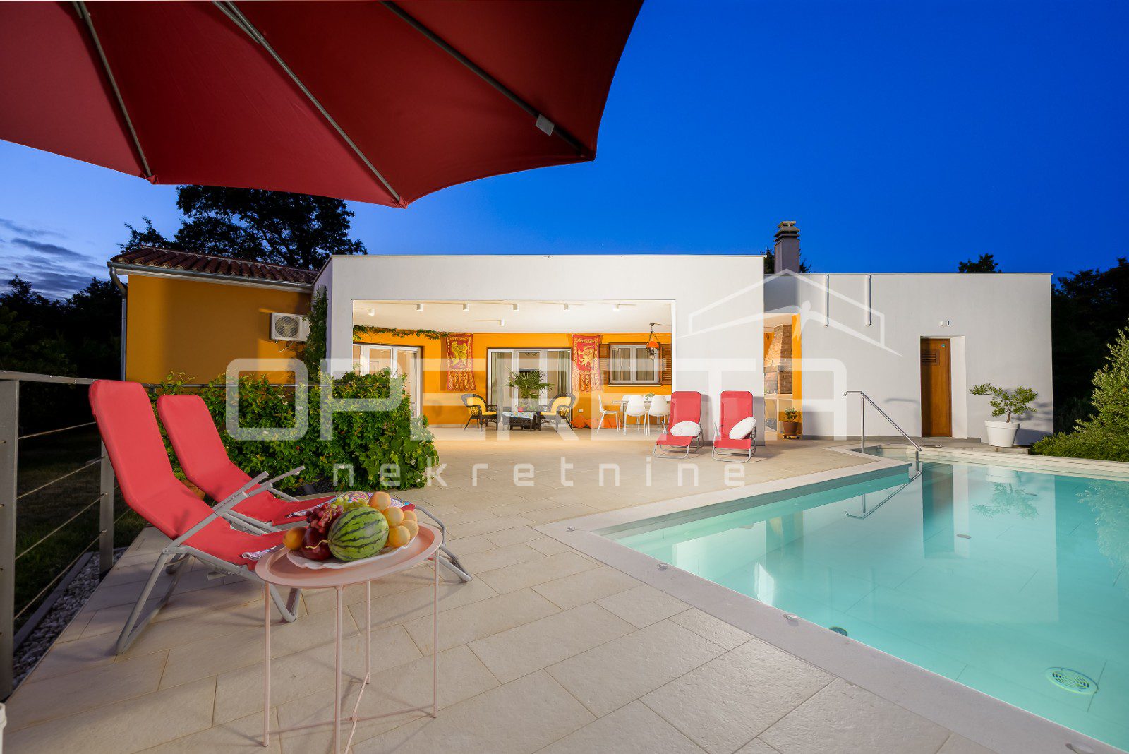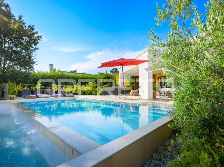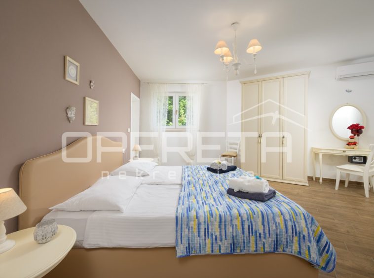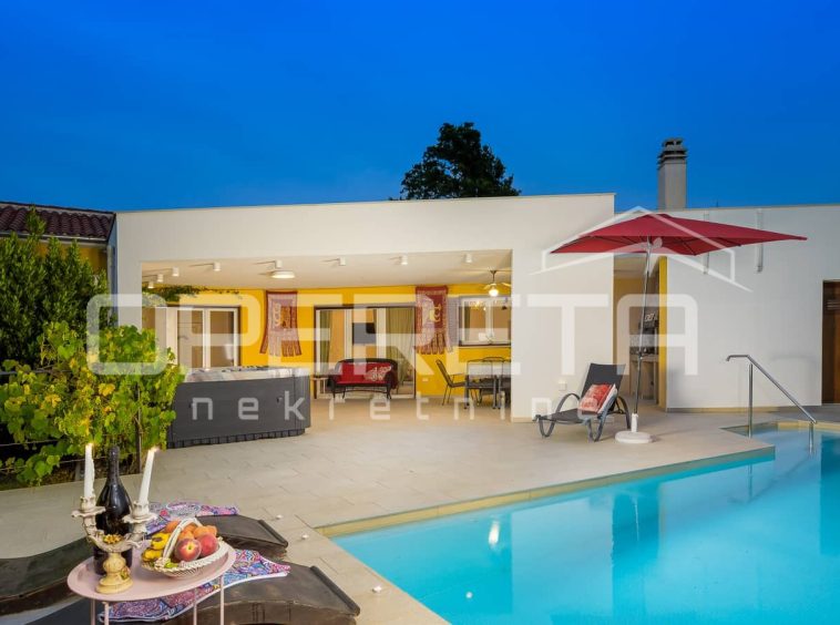 The house is fully air-conditioned and equipped with a sauna. The living area opens onto a covered terrace with a fireplace, while below there is a swimming pool with a sunbathing area, ideal for enjoying warm Istrian days.