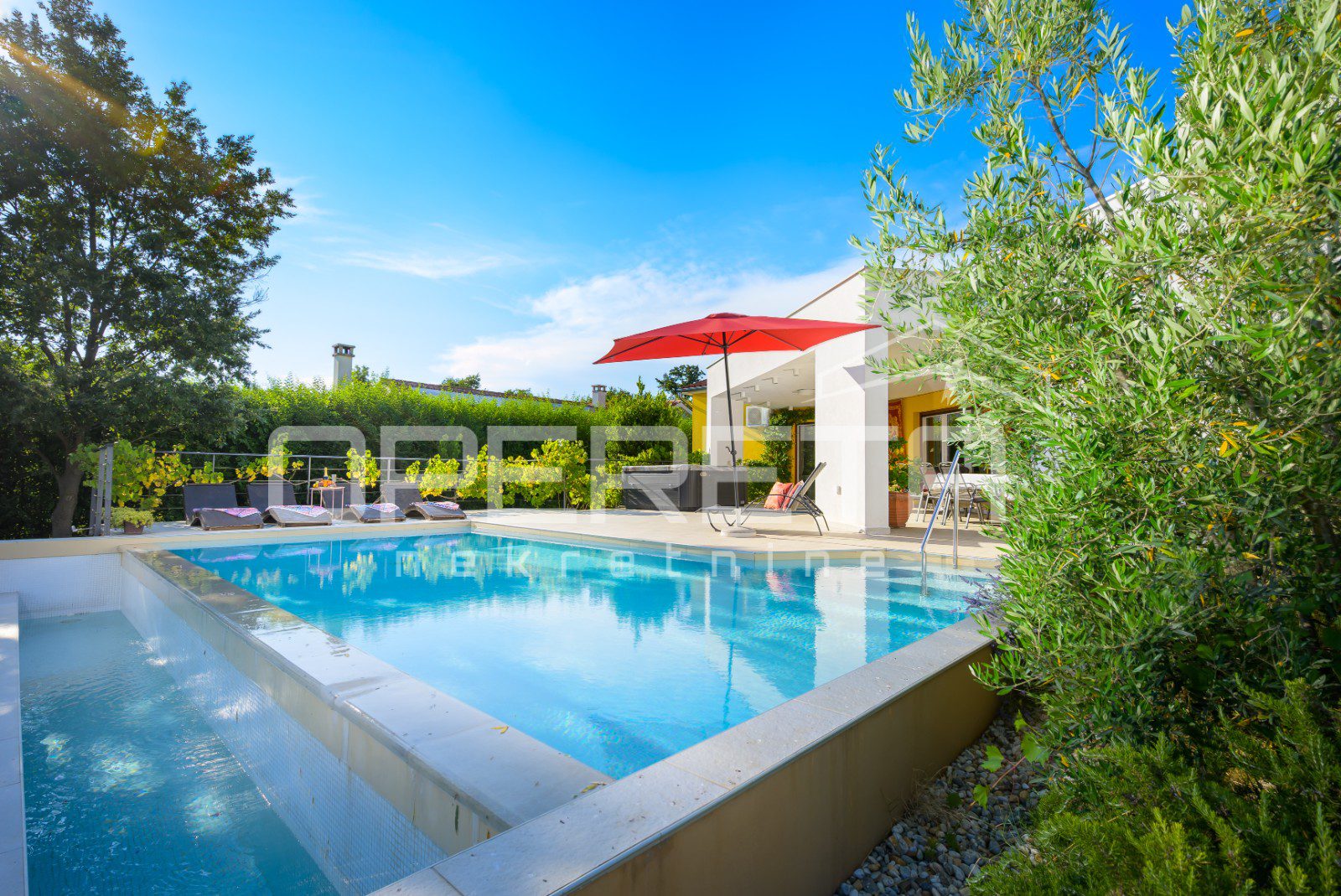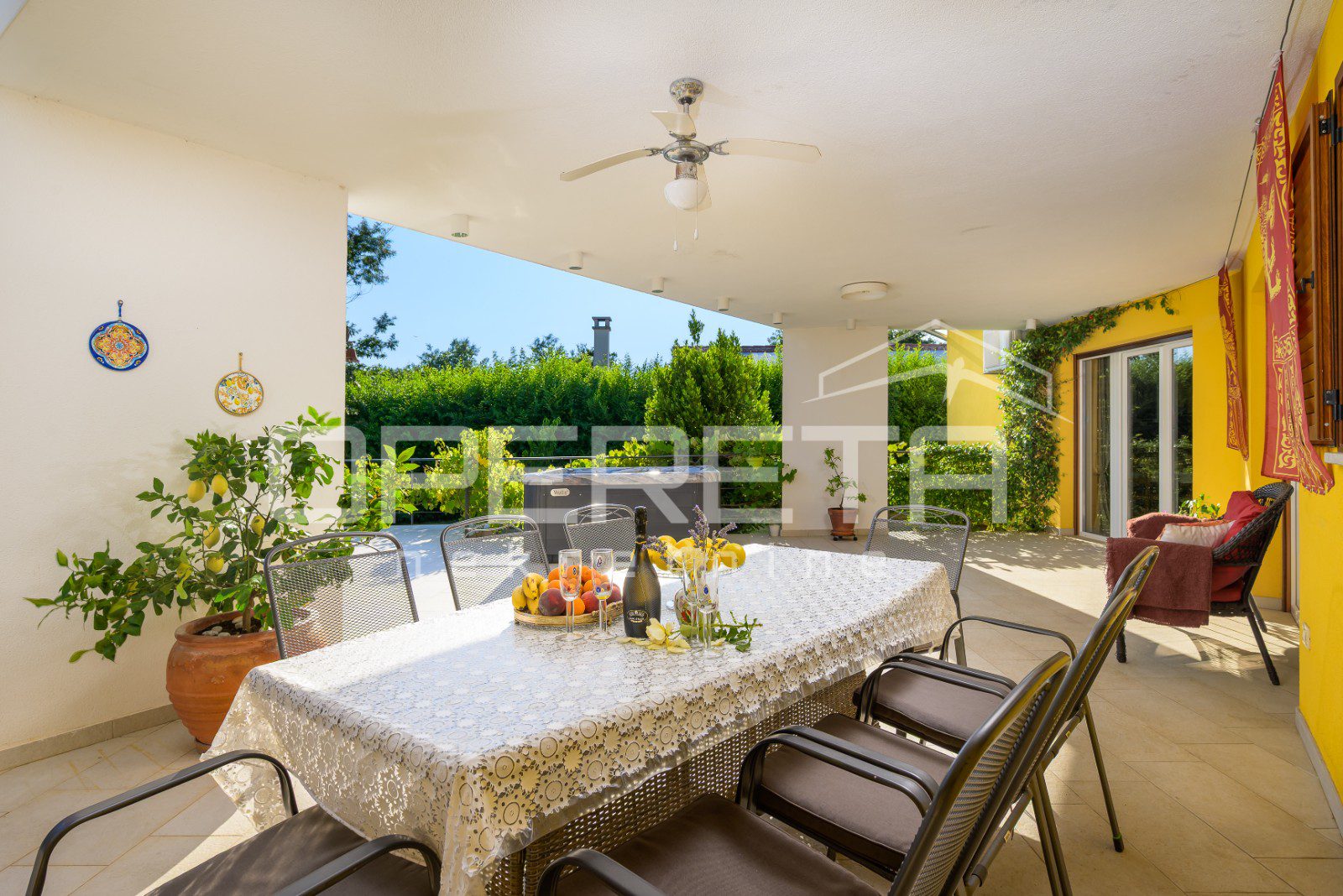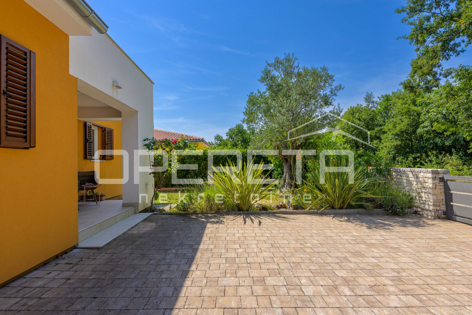 The yard is completely fenced and decorated with Mediterranean vegetation, ensuring privacy and security – ideal for families with children and pets.