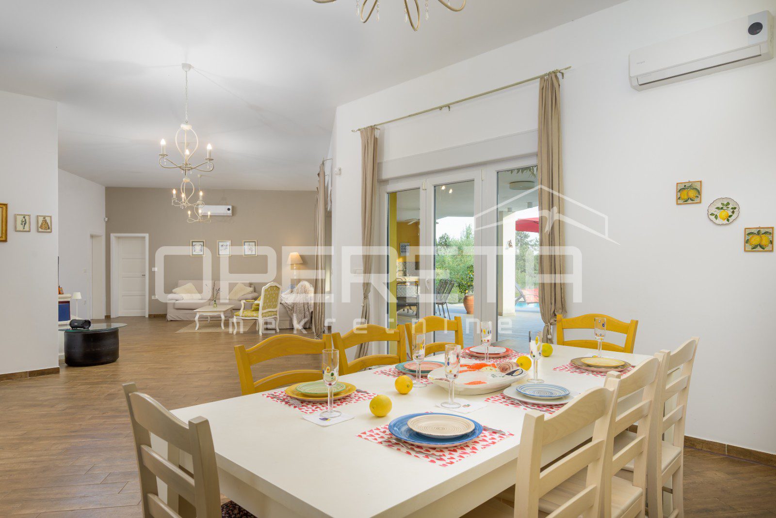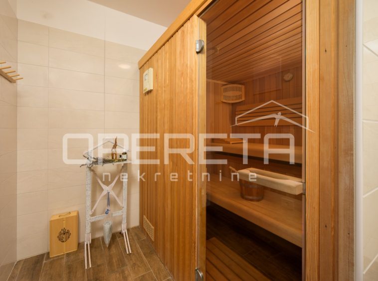 The entire property is air-conditioned, and an additional luxury is provided by a sauna, ideal for relaxation throughout the year. The living room and dining room lead out onto a large covered terrace with a built-in fireplace, perfect for socializing and evening gatherings. Next to the terrace is a large swimming pool with a sunbathing area and deck chairs, creating an ideal relaxation area.